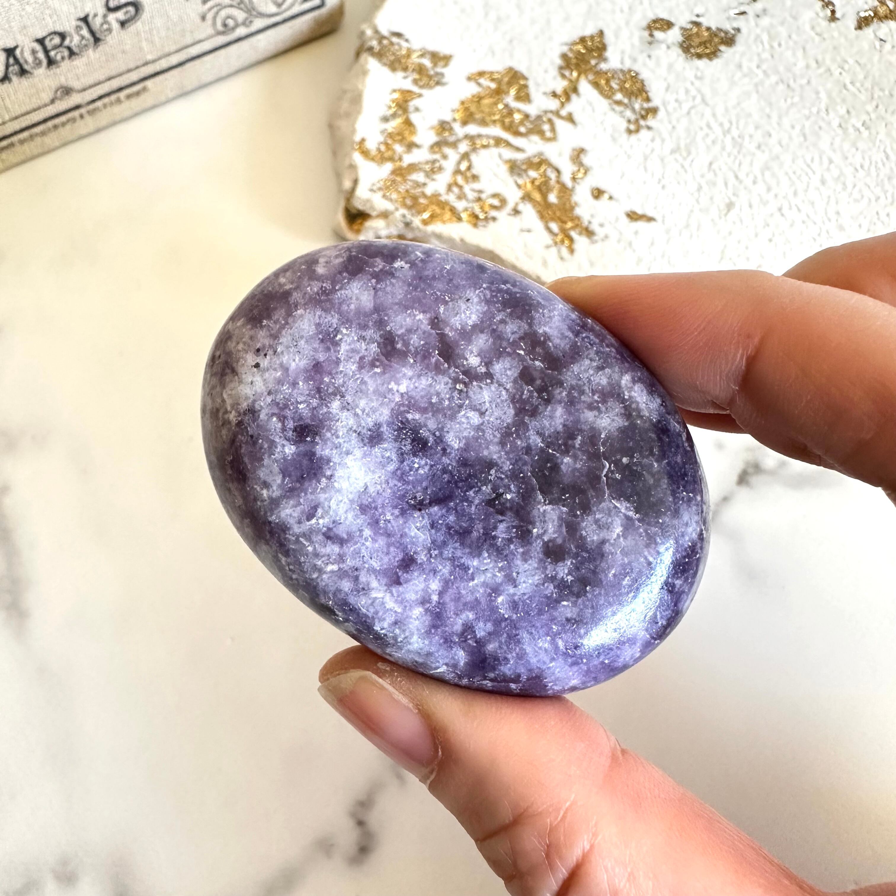 明るいパープルと白の模様が綺麗なレピドライトのパームストーンです。