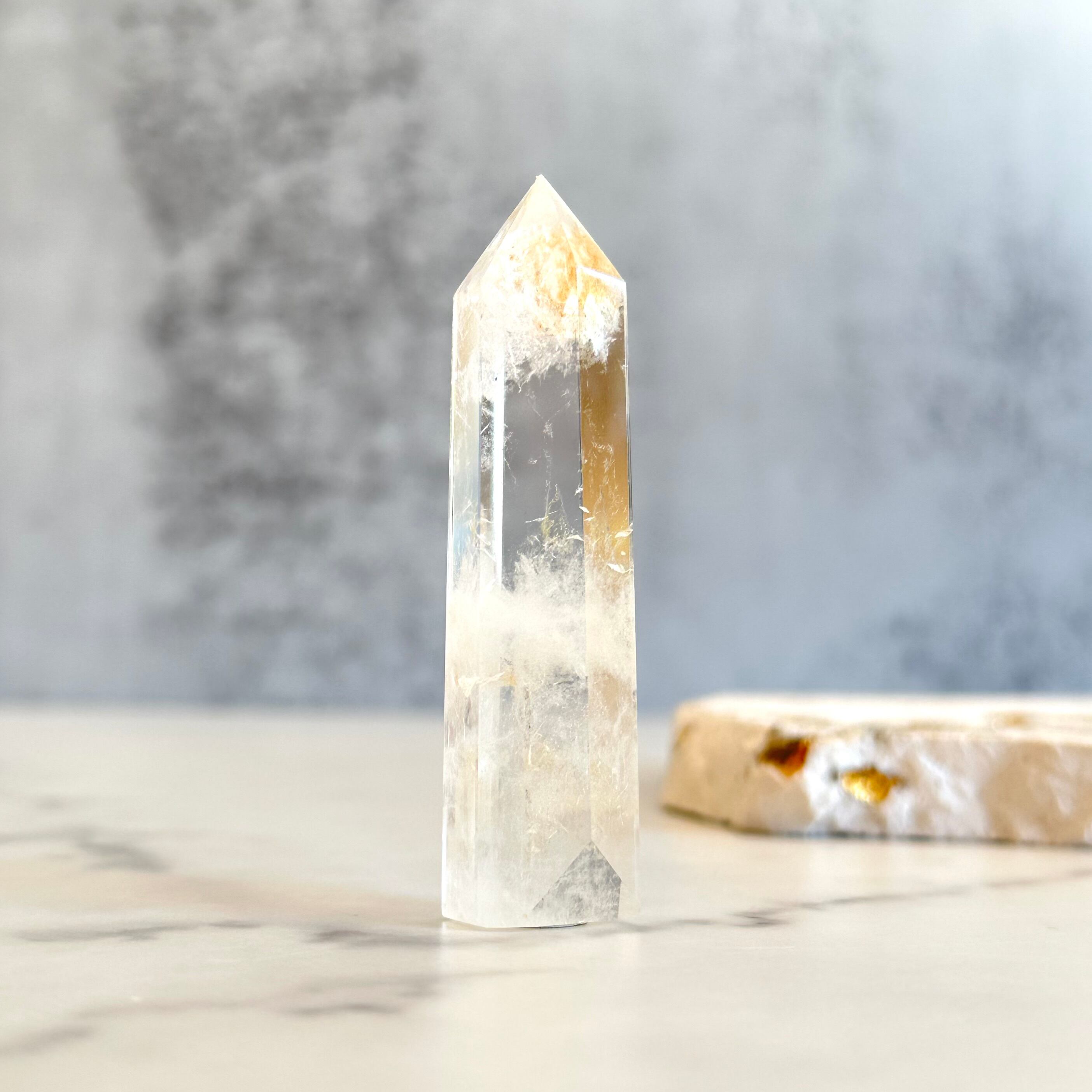 すっきりと細く伸びたフォルムで、山野を流れる清らかな水のようにみずみずしい水晶です。トップにシャンパンゴールドのインクルージョンが見られ、繊細で美しいタワーです。