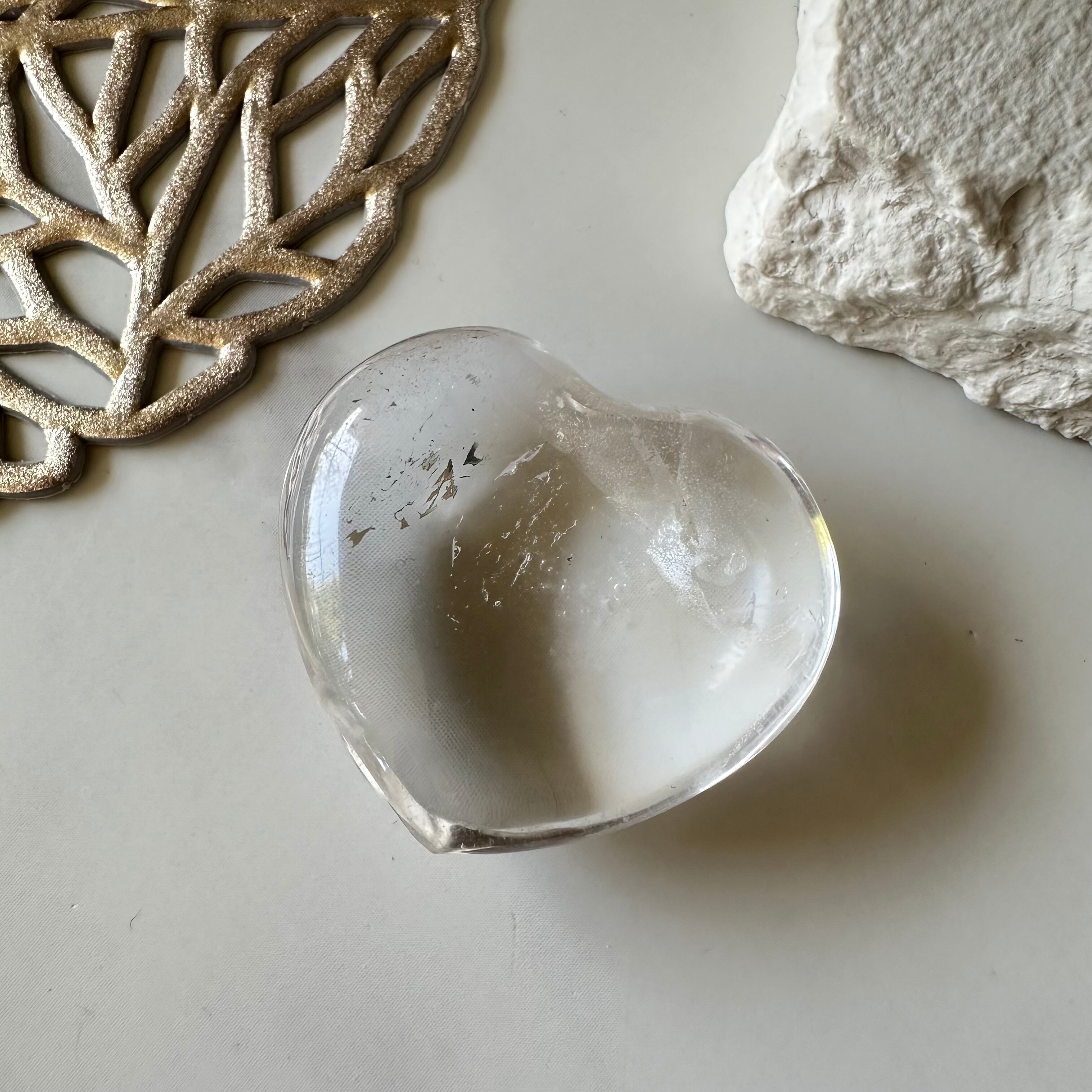 透明感が綺麗なクリアクォーツ(水晶)のハート型ストーンです。光を含んでキラキラと輝きます。みずみずしく優しい光は疲れた心にそっと寄り添い癒してくれるかのようです。