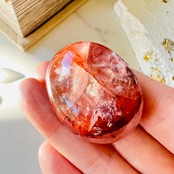 しっかり濃い赤と透明感のあるクォーツが綺麗なファイヤークォーツタンブル。光を入れるとキラキラと輝きます。ころんと厚みのある小さめな石で手に馴染み握りやすい形です。内部には虹も煌めきます。