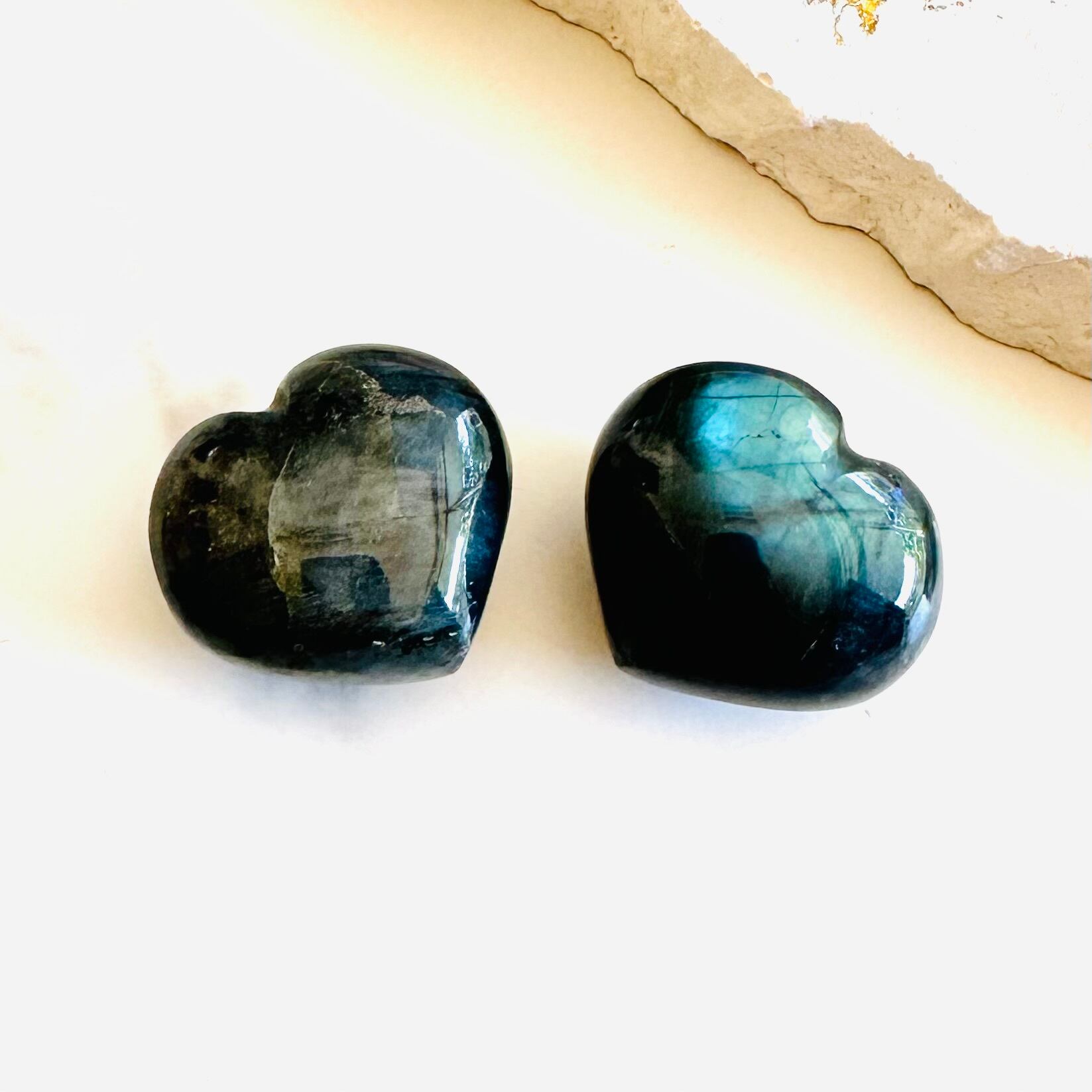 ラブラドライのぷっくりとしたハート型ストーン2個セットです。ラブラドライト特有の、孔雀の羽のように鮮やかに輝く光をラブラドレッセンスと呼びます。美しいレッセンスが宇宙の神秘を思わせる魅力的なアイテムです。
