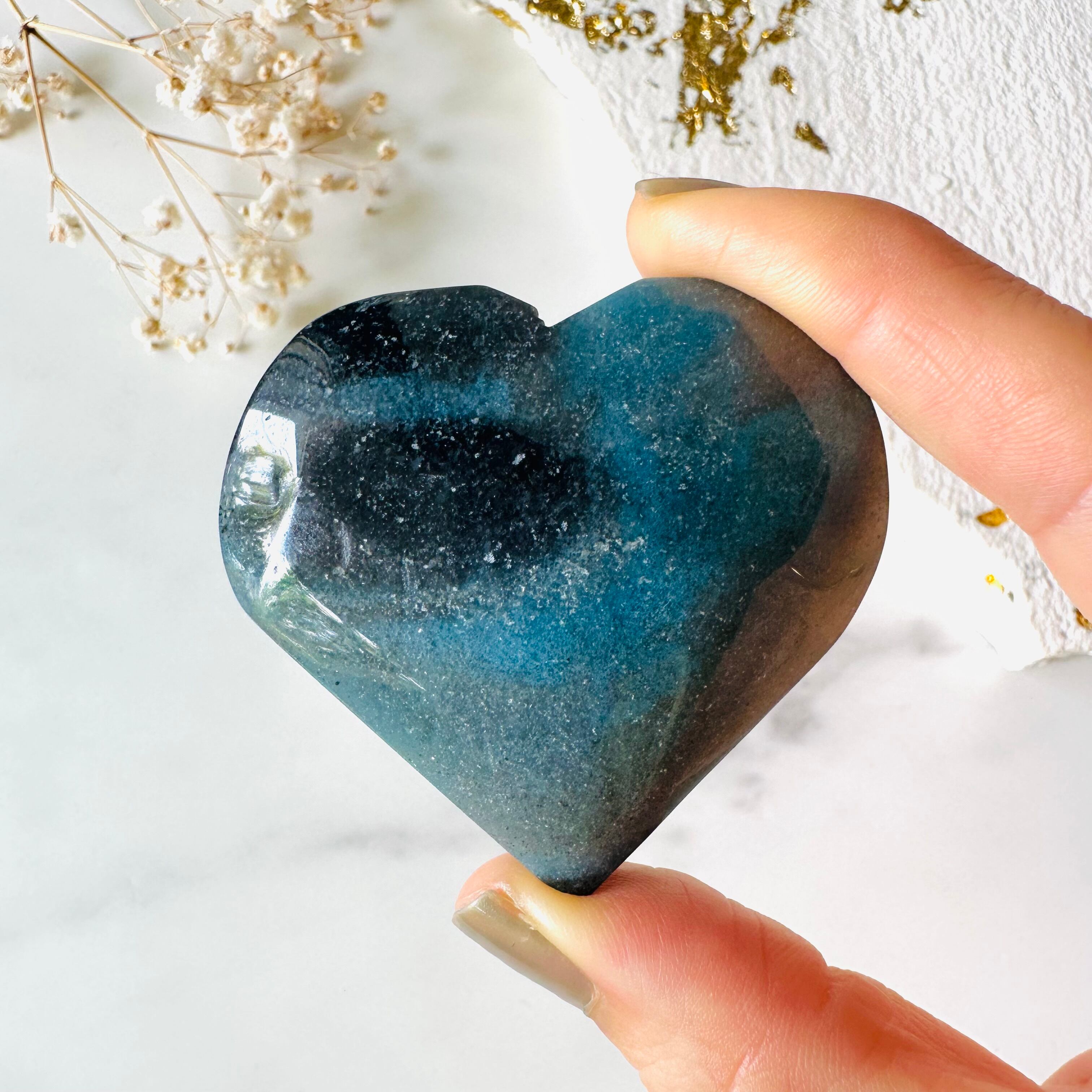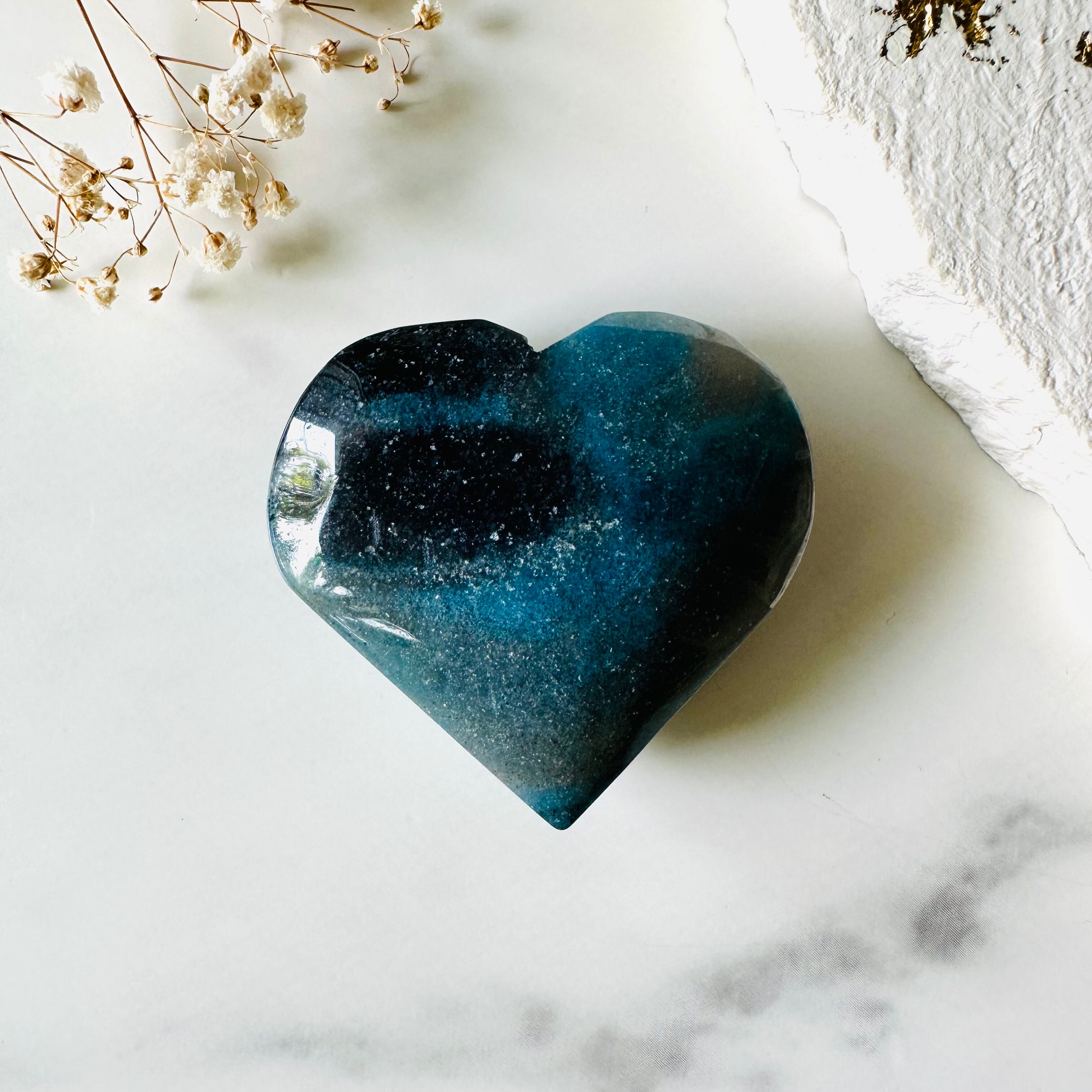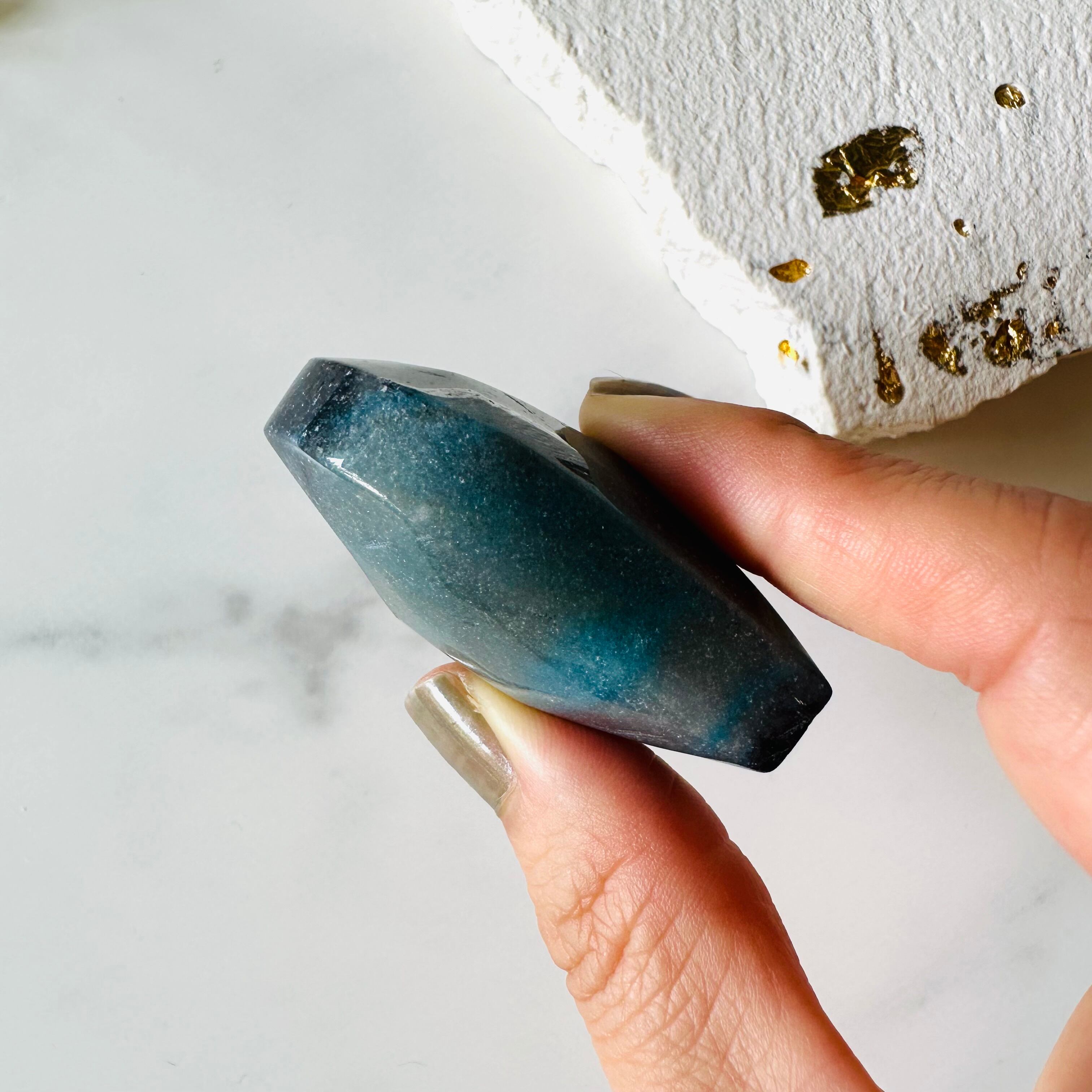 ふんわりとした抽象的な印象のあるトロレアイト。絵本の中の世界のようにメルヘンで可愛らしく、どこか懐かしい気持ちにさせてくれる不思議な雰囲気を持つ石です。水色から濃いブルーのグラデーションの中に、オレンジ色の絵の具をひとはけしたような模様です。微粒子のようなキラキラが散らばり角度を変えると儚げにキラキラします。しっかりと厚みがあるアイテムです。
