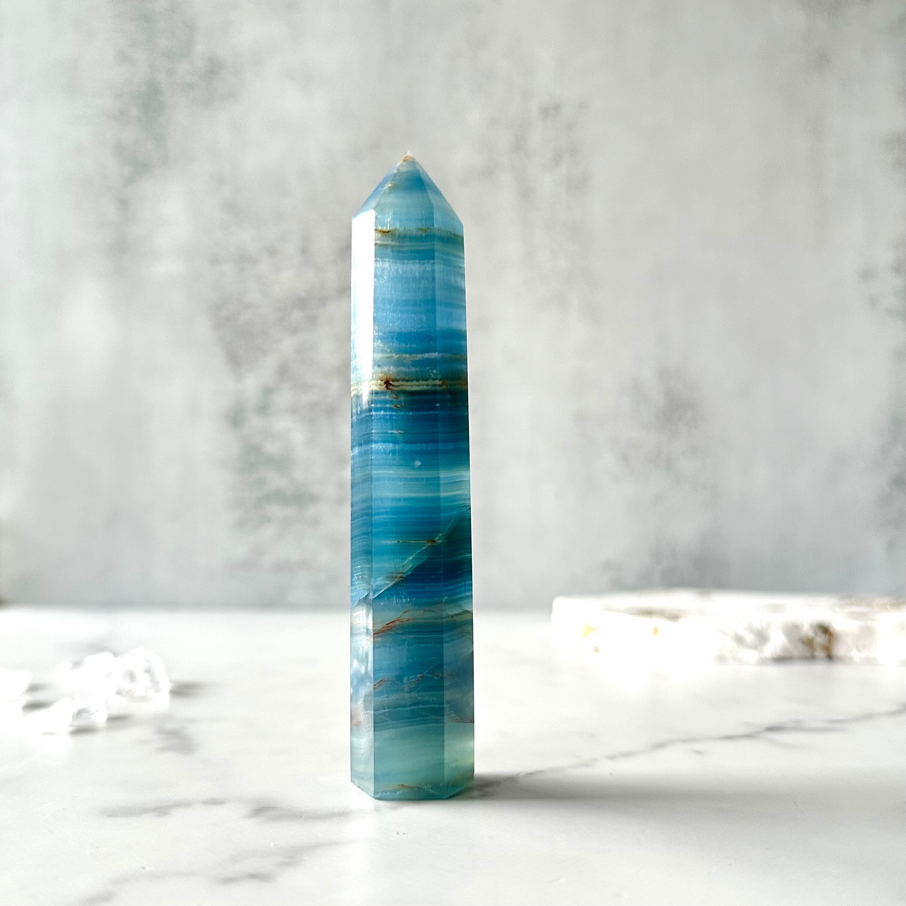 何層にも重なり合ったブルーとブラウンの縞模様が美しい色と模様を作り出しています。こちらは特にブラウン部分が少なく青が美しいタワーです。つやつやとした石肌でどの角度から見ても美しいアイテムです。