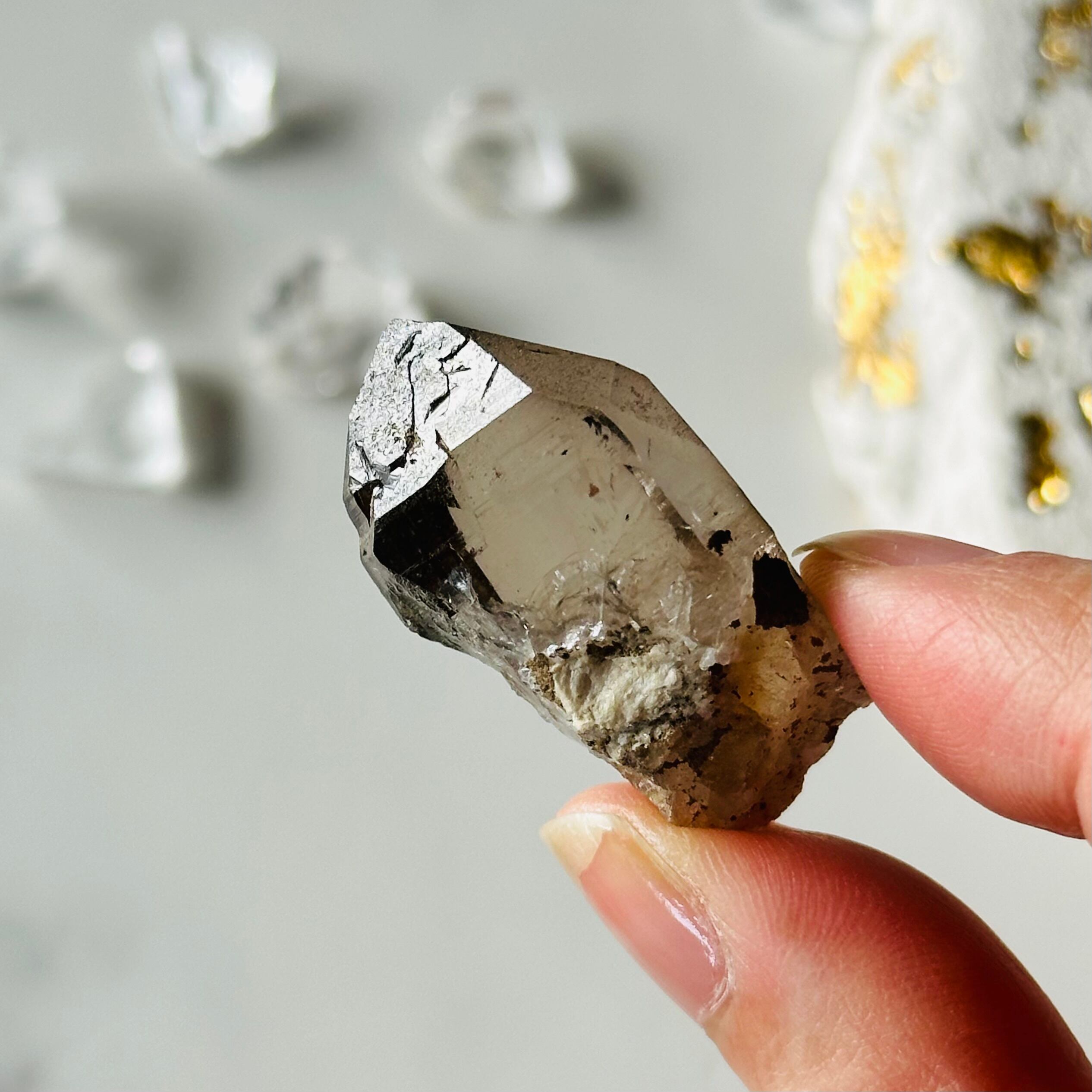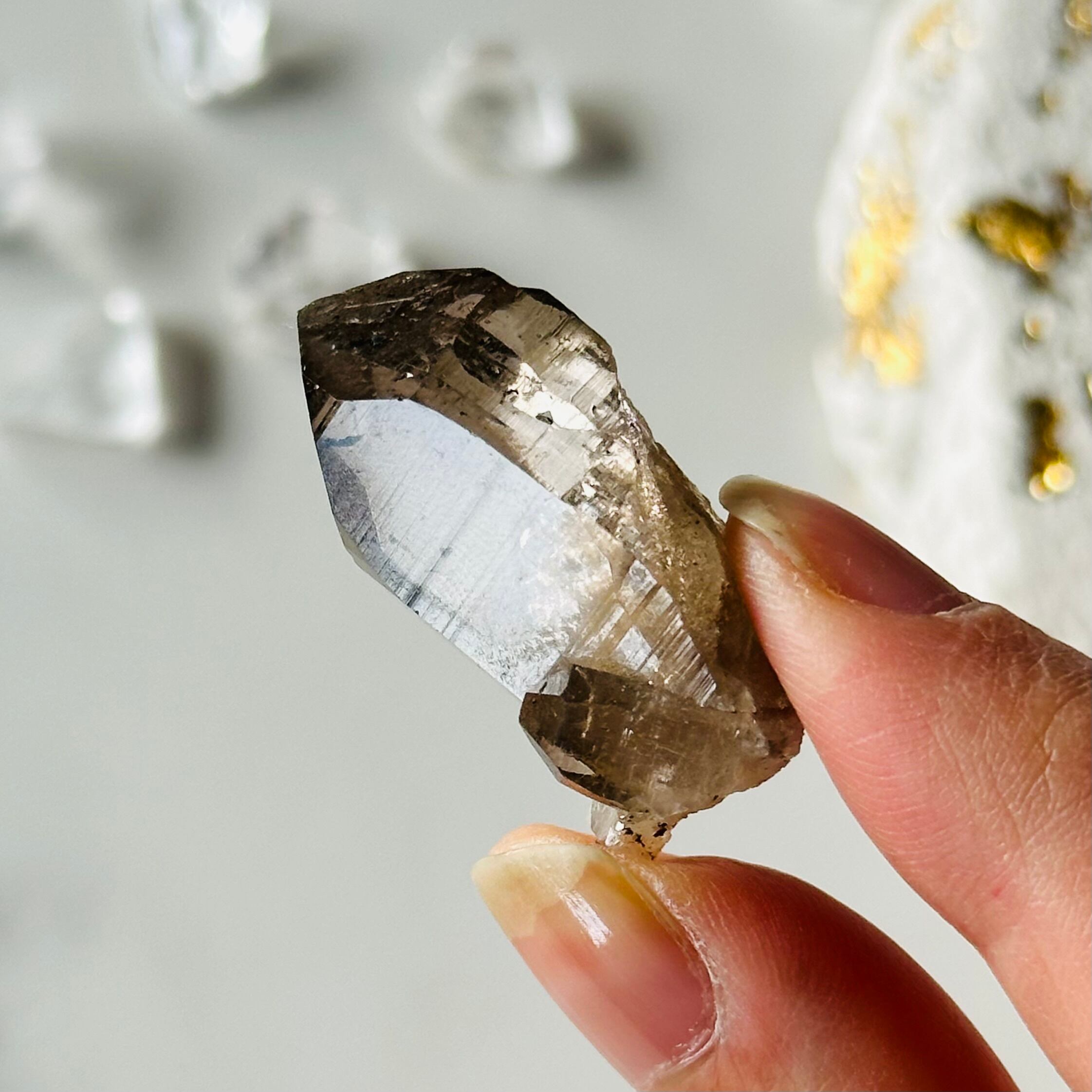 ヒマラヤ山脈の中にあるガウリシャンカール山は非常に険しいことで知られます。荒々しい環境の中で育ち、採取された大変貴重な水晶で、透き通ったブラウンカラーが最大の特徴です。ガウリシャンカール産の水晶は先端が欠けている事も多くありますが、その神秘的な色と透明感には不思議と引き込まれる魅力があり人気の高い水晶です。表面の照りが強くキラキラと美しい輝きを放ちます。天然のスモーキークォーツの飽きのこない美しさをお楽しみください。