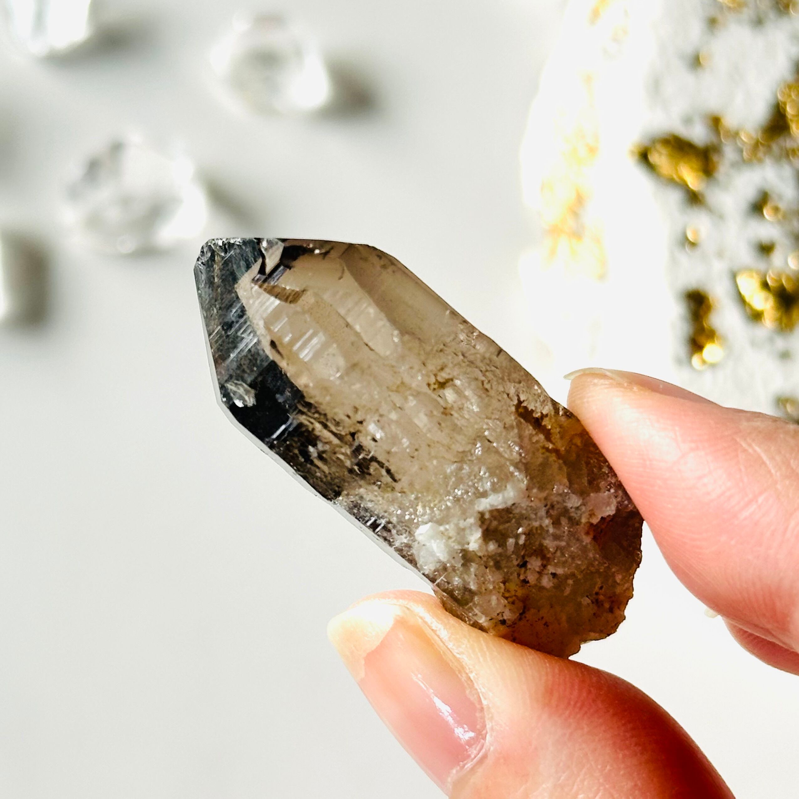 ヒマラヤ山脈の中にあるガウリシャンカール山は非常に険しいことで知られます。荒々しい環境の中で育ち、採取された大変貴重な水晶で、透き通ったブラウンカラーが最大の特徴です。ガウリシャンカール産の水晶は先端が欠けている事も多くありますが、その神秘的な色と透明感には不思議と引き込まれる魅力があり人気の高い水晶です。表面の照りが強くキラキラと美しい輝きを放ちます。天然のスモーキークォーツの飽きのこない美しさをお楽しみください。