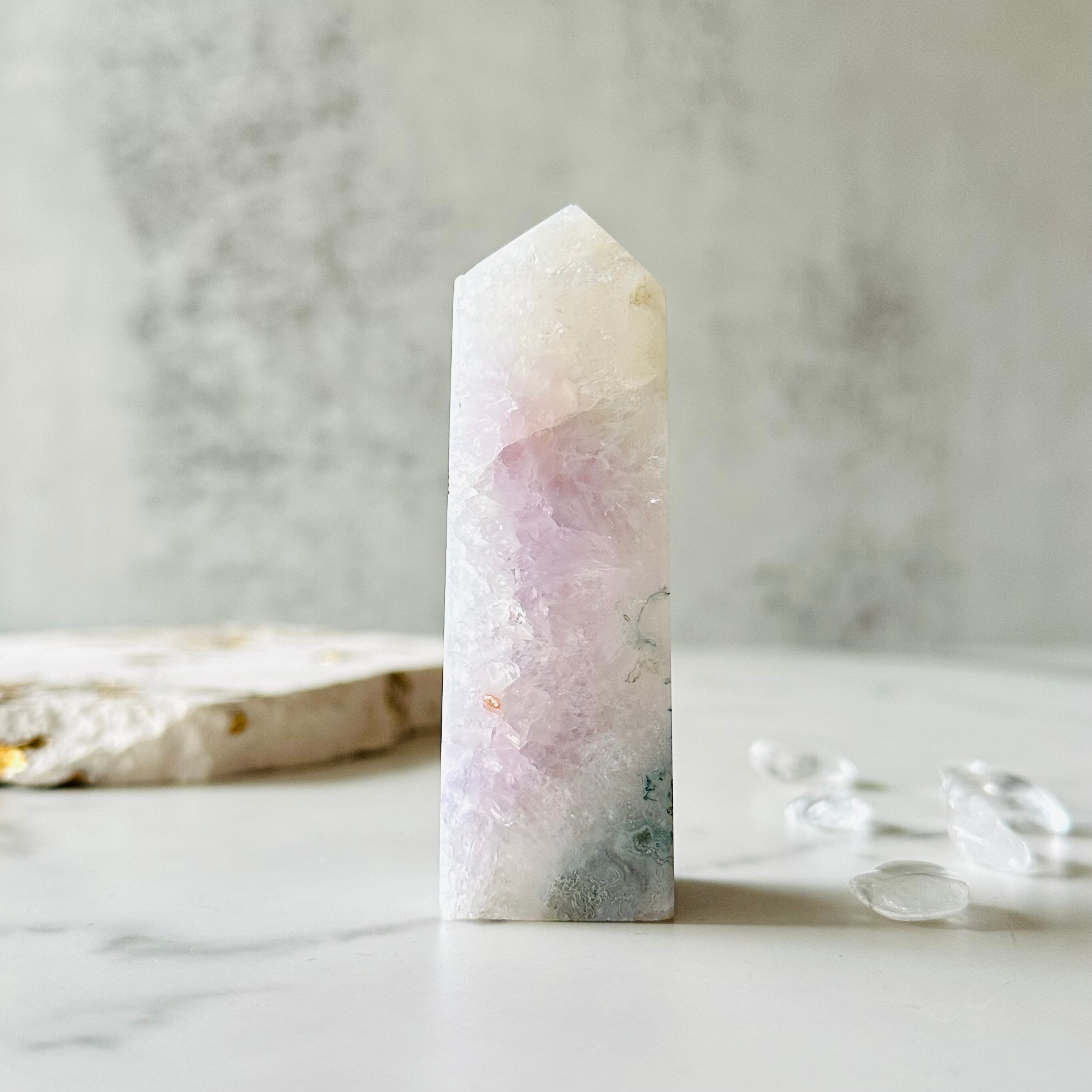 美しい乳白色とラベンダーカラーのアメジストの結晶がキラキラ輝きます。細かな虹がびっしり入ってとても綺麗です。足元にはモスアゲートの癒しのグリーンが共生しており、優しい色合いに癒されます。ふんわり上品な雰囲気のタワーです。