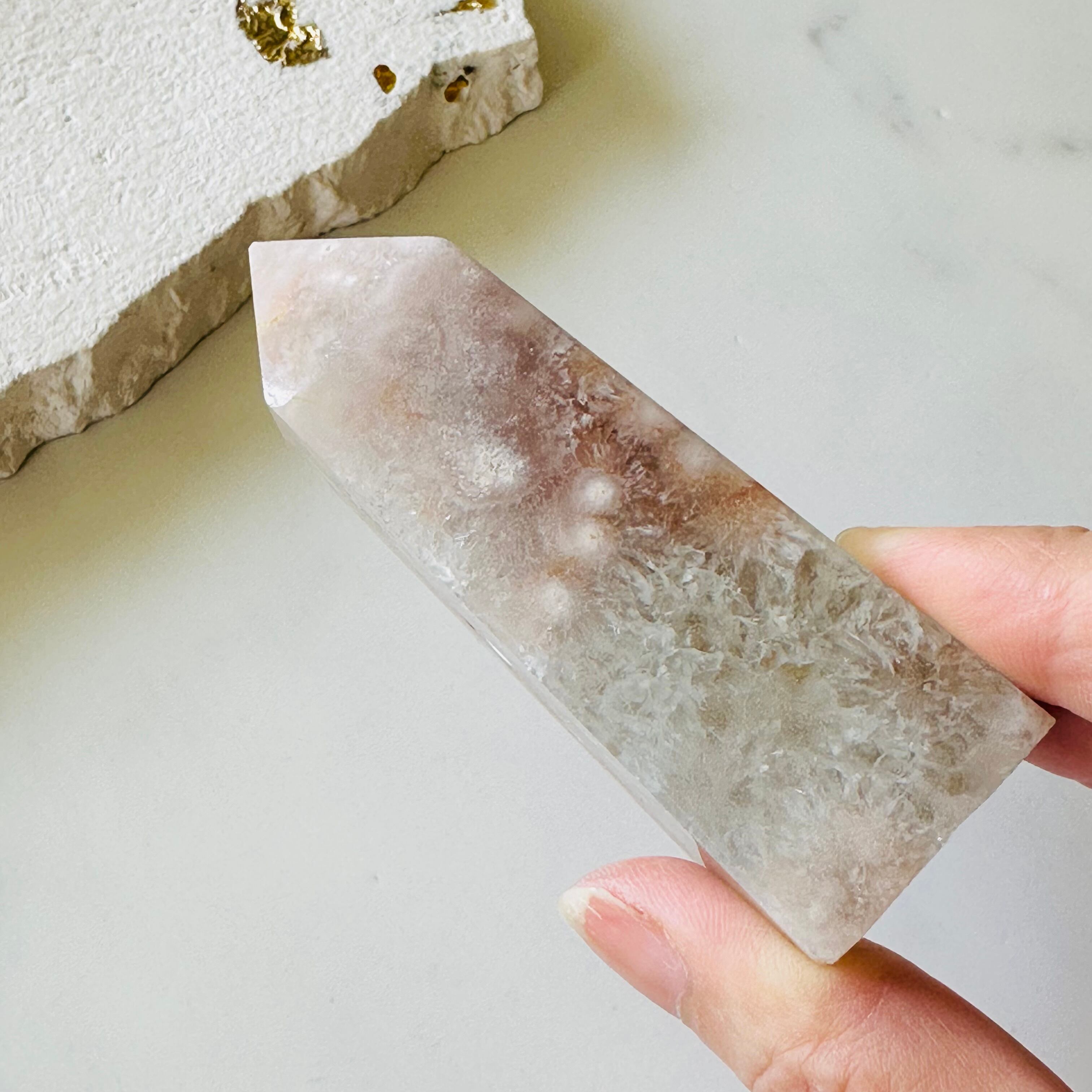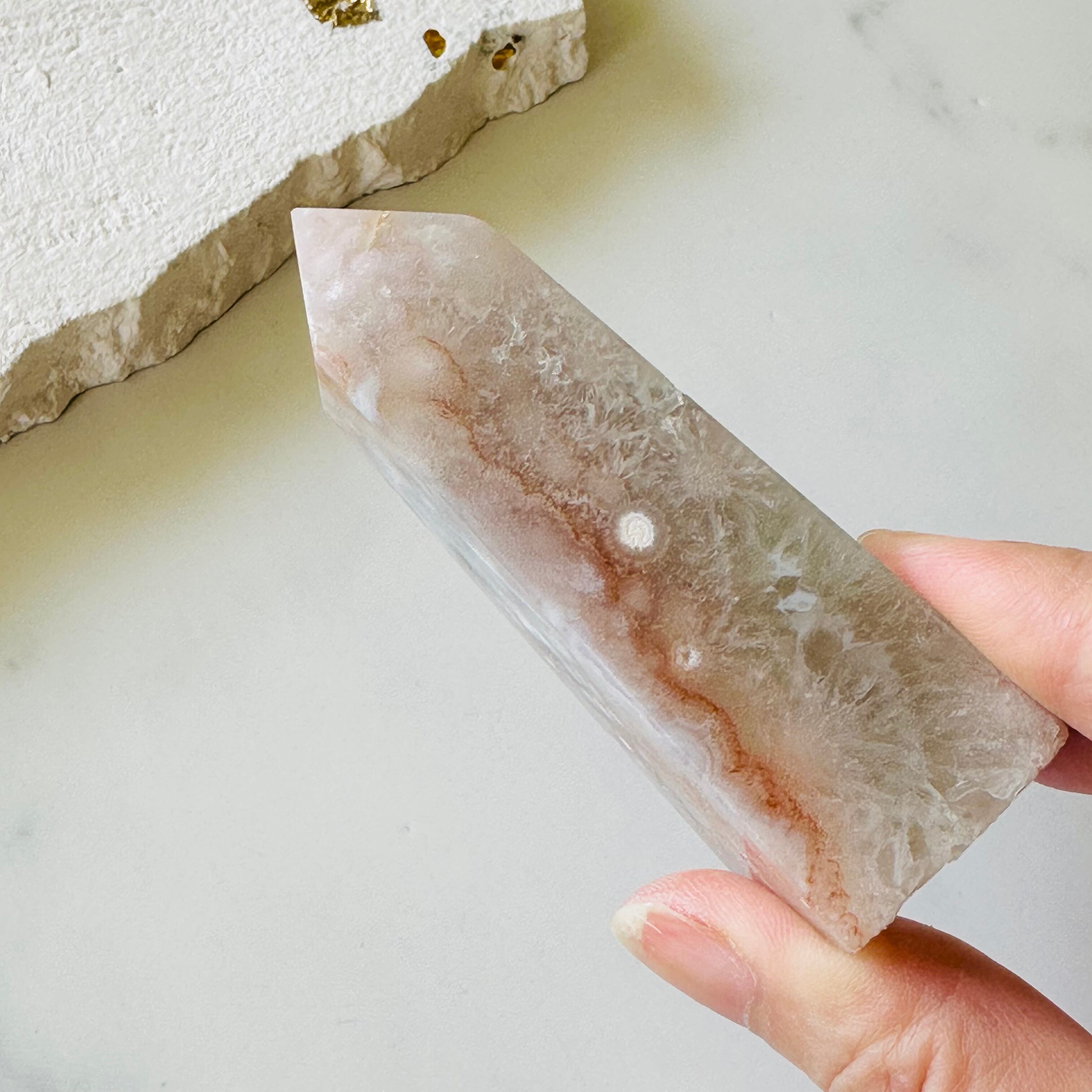 優しいピンクとホワイトの色合いが可愛らしいピンクフラワーアゲートのタワーです。ザクザクした結晶の透け感と、そこに浮かんだピンクのお花の可憐な姿が特徴の、女性らしいアイテムです。