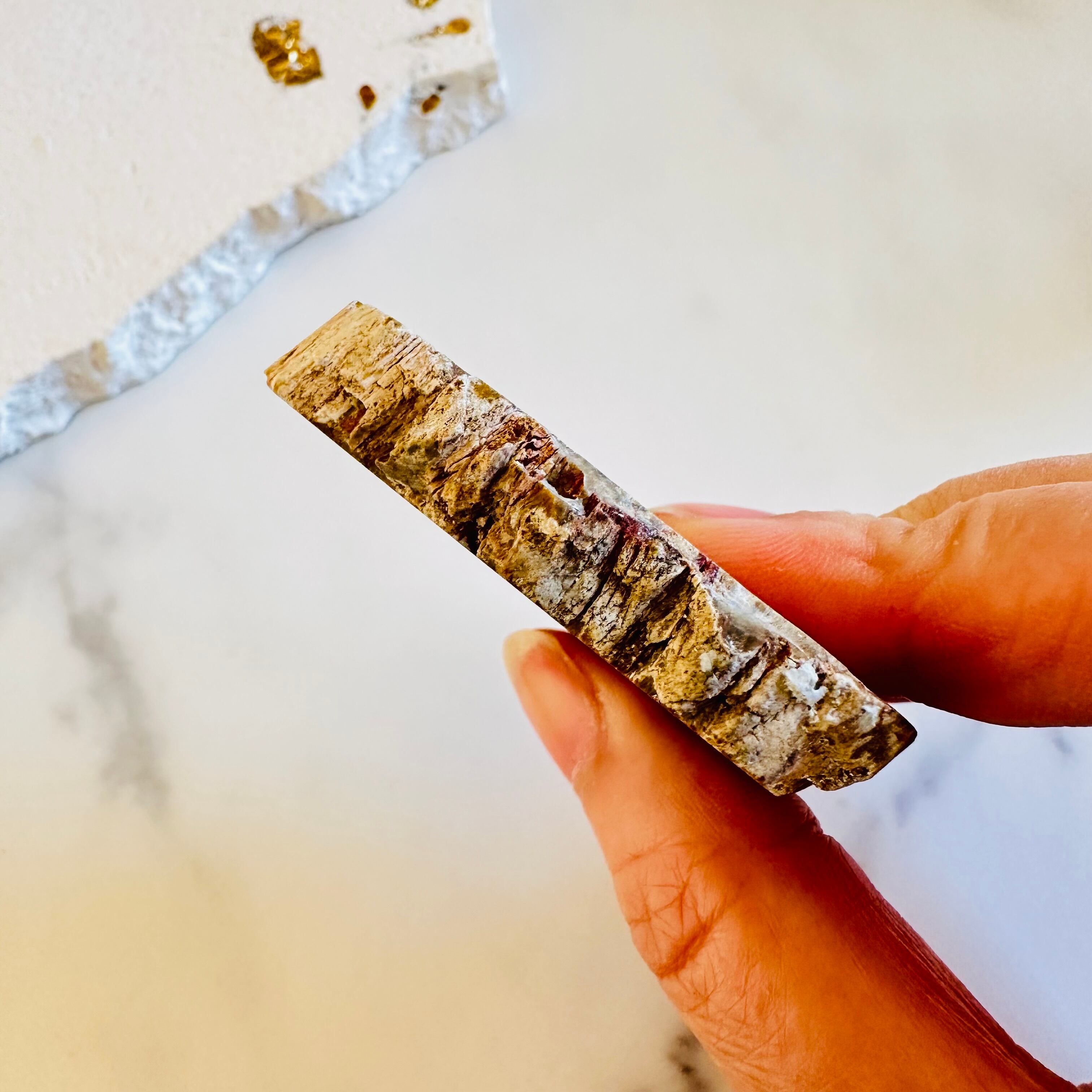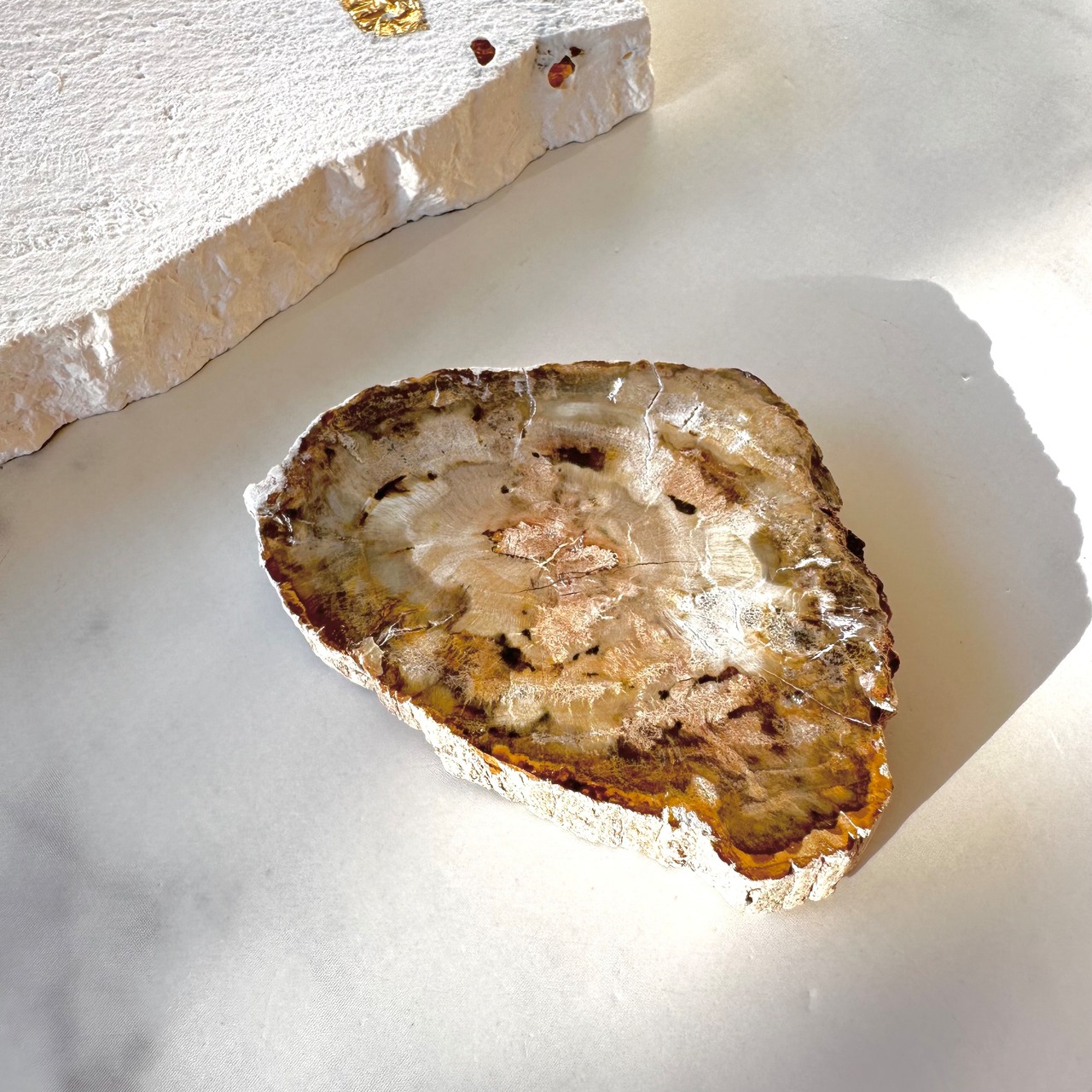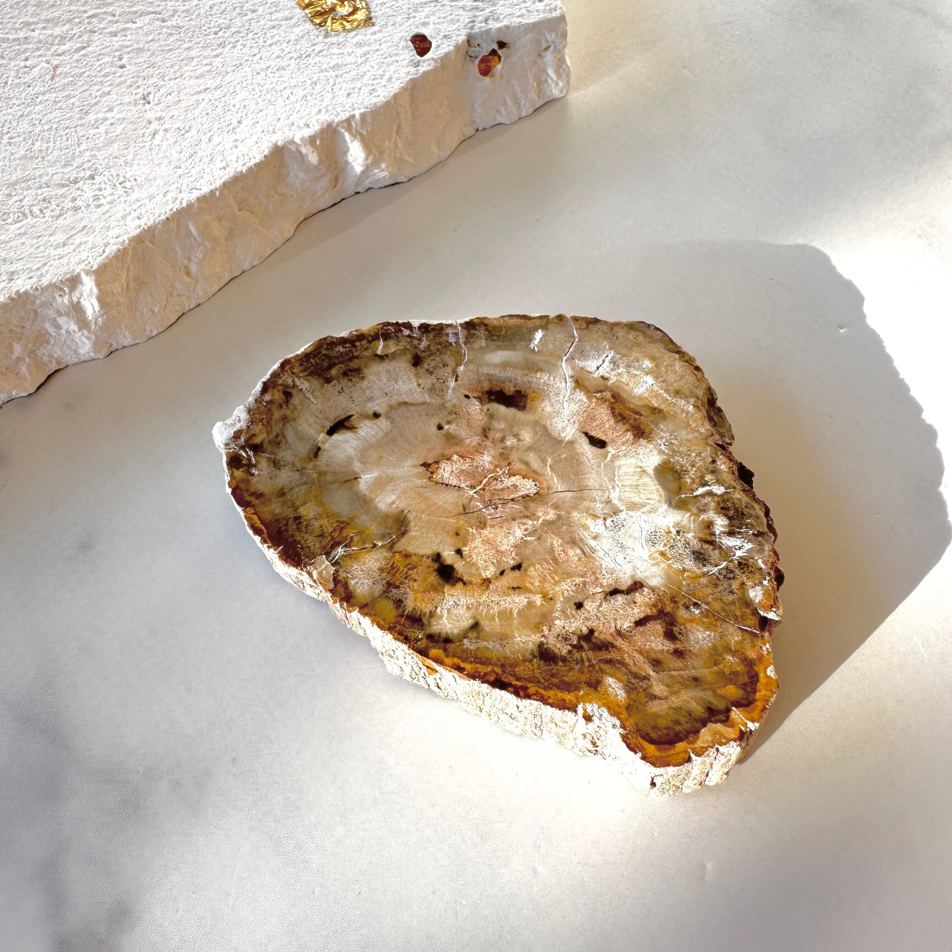 ペトリファイドウッドは太古の植物が化石化したもので、地中に埋もれた樹木に珪酸が浸透して、何億年もの時を経て化石にへと変化したものです。もともとは樹木ですが、化石化しているために木のように軽いわけではなく、重さがあり硬い質感です。