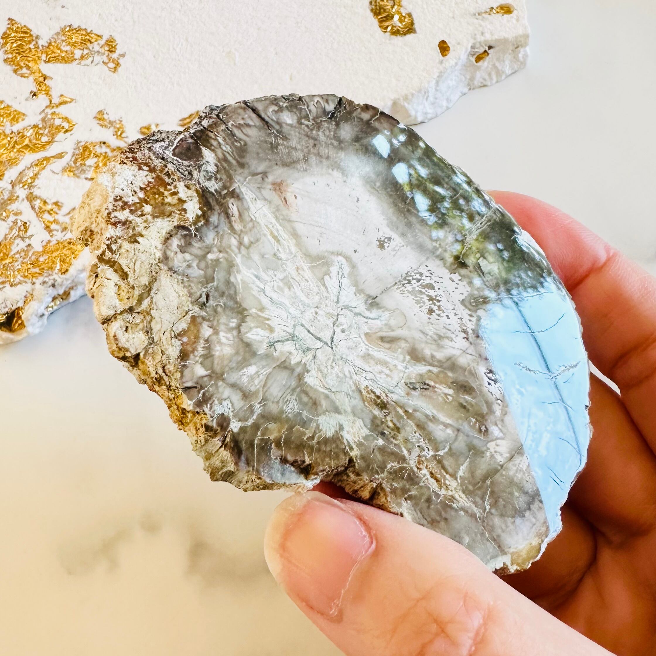 ペトリファイドウッドは太古の植物が化石化したもので、地中に埋もれた樹木に珪酸が浸透して、何億年もの時を経て化石にへと変化したものです。もともとは樹木ですが、化石化しているために木のように軽いわけではなく、重さがあり硬い質感です。