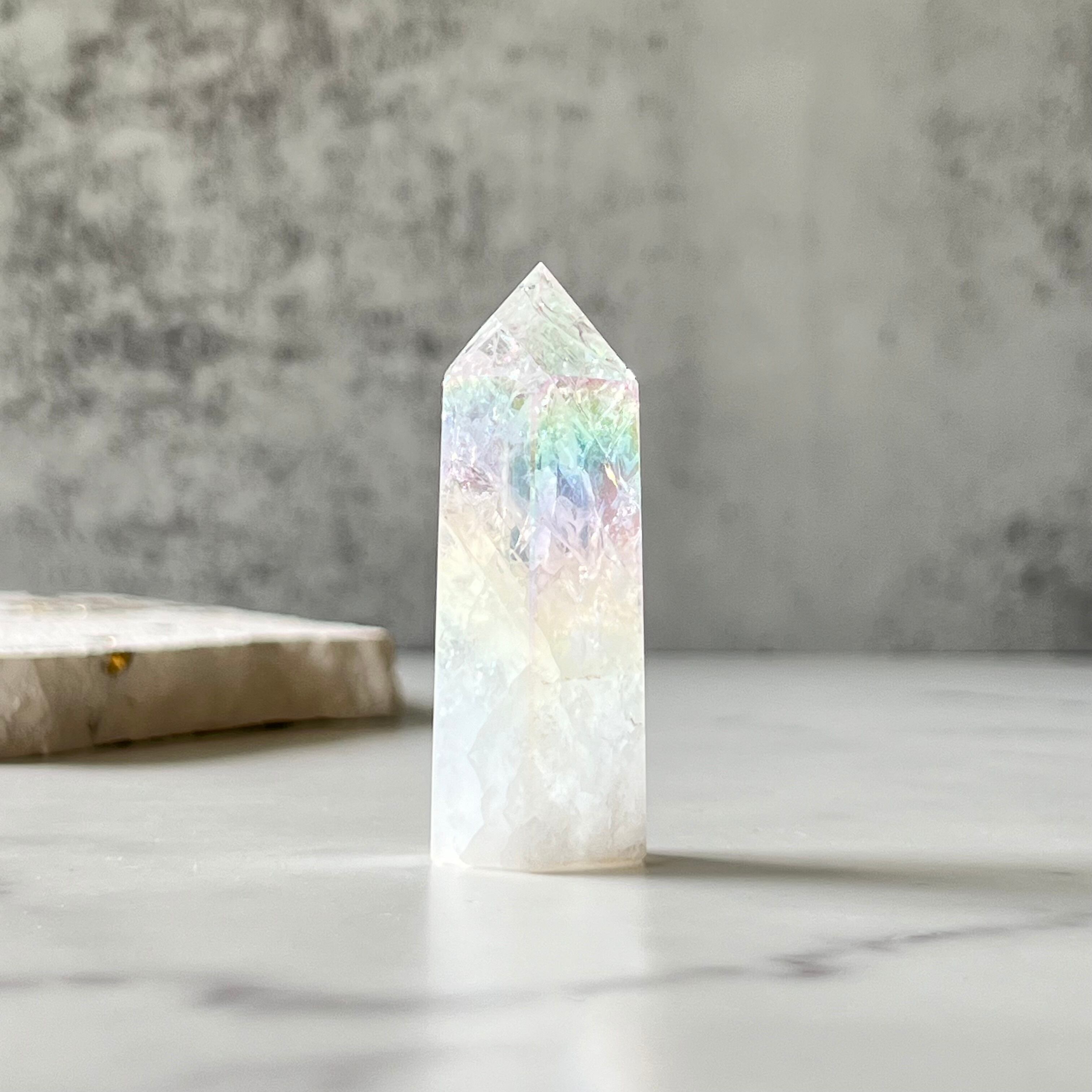 人工的にクラックを入れて、オーロラ加工を施した水晶ポイントです。内部には無数の虹を宿し、ピンクやイエロー、グリーンのパステルカラーのオーラを纏った可愛らしいアイテムです。
