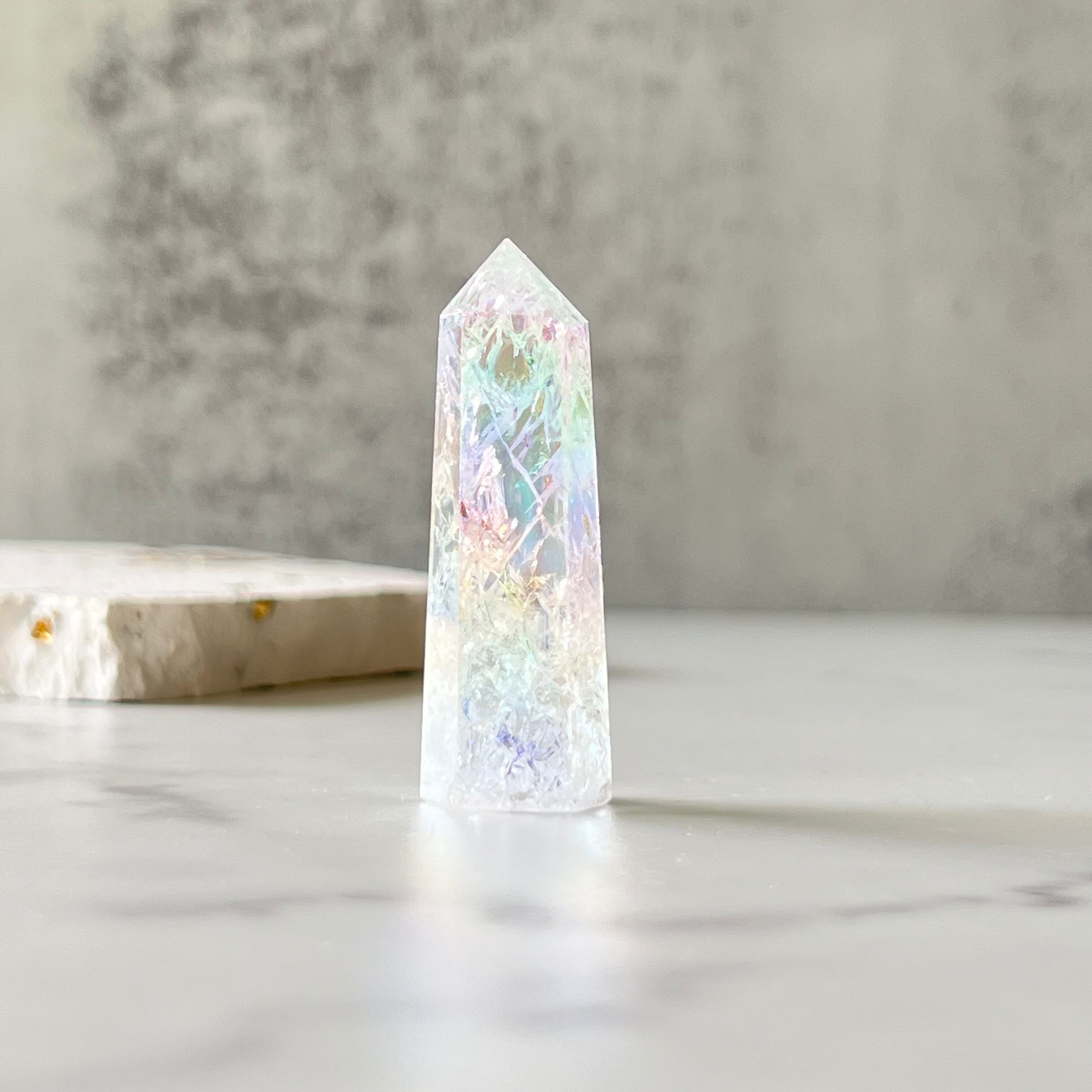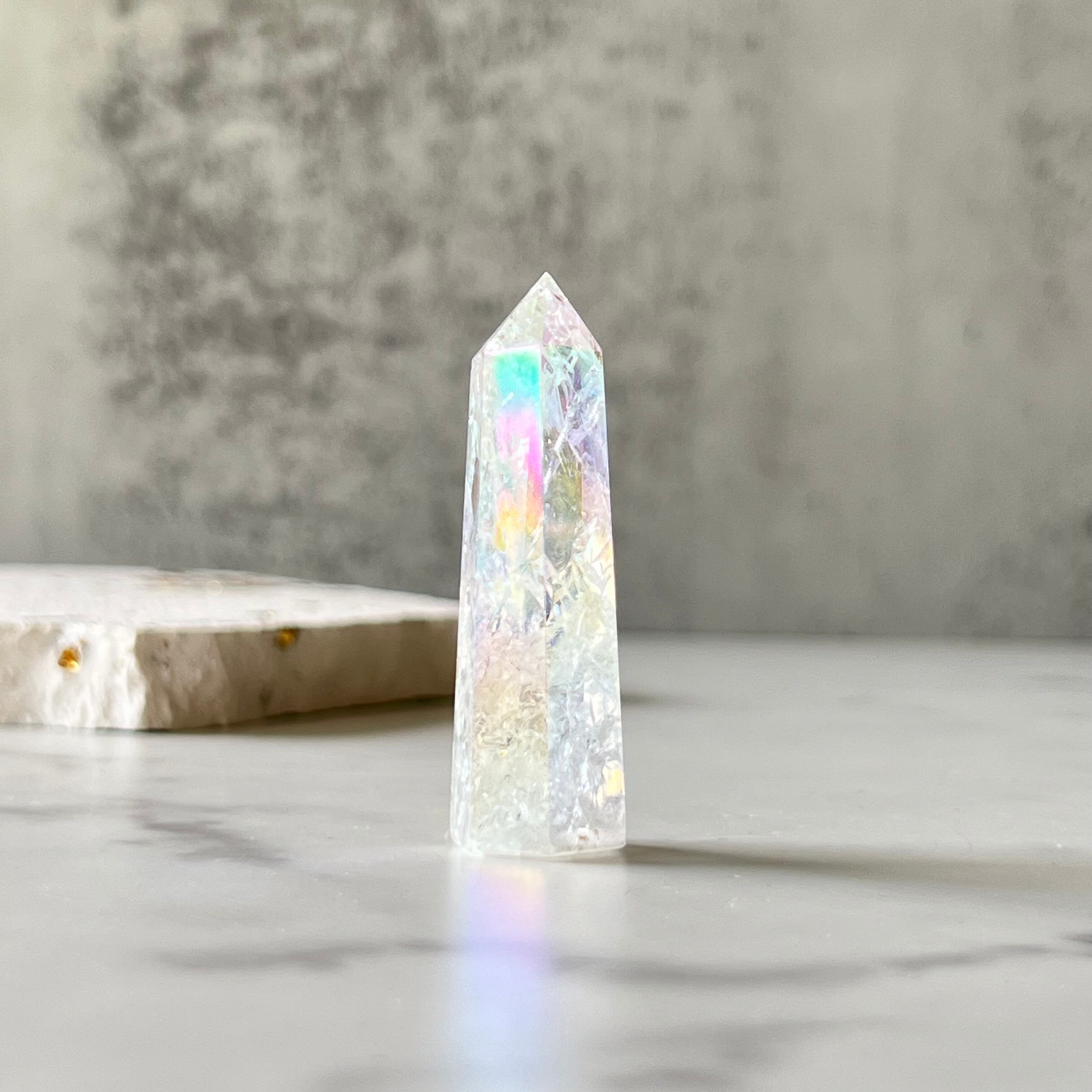 人工的にクラックを入れて、オーロラ加工を施した水晶ポイントです。内部には無数の虹を宿し、ピンクやイエロー、グリーンのパステルカラーのオーラを纏った可愛らしいアイテムです。
