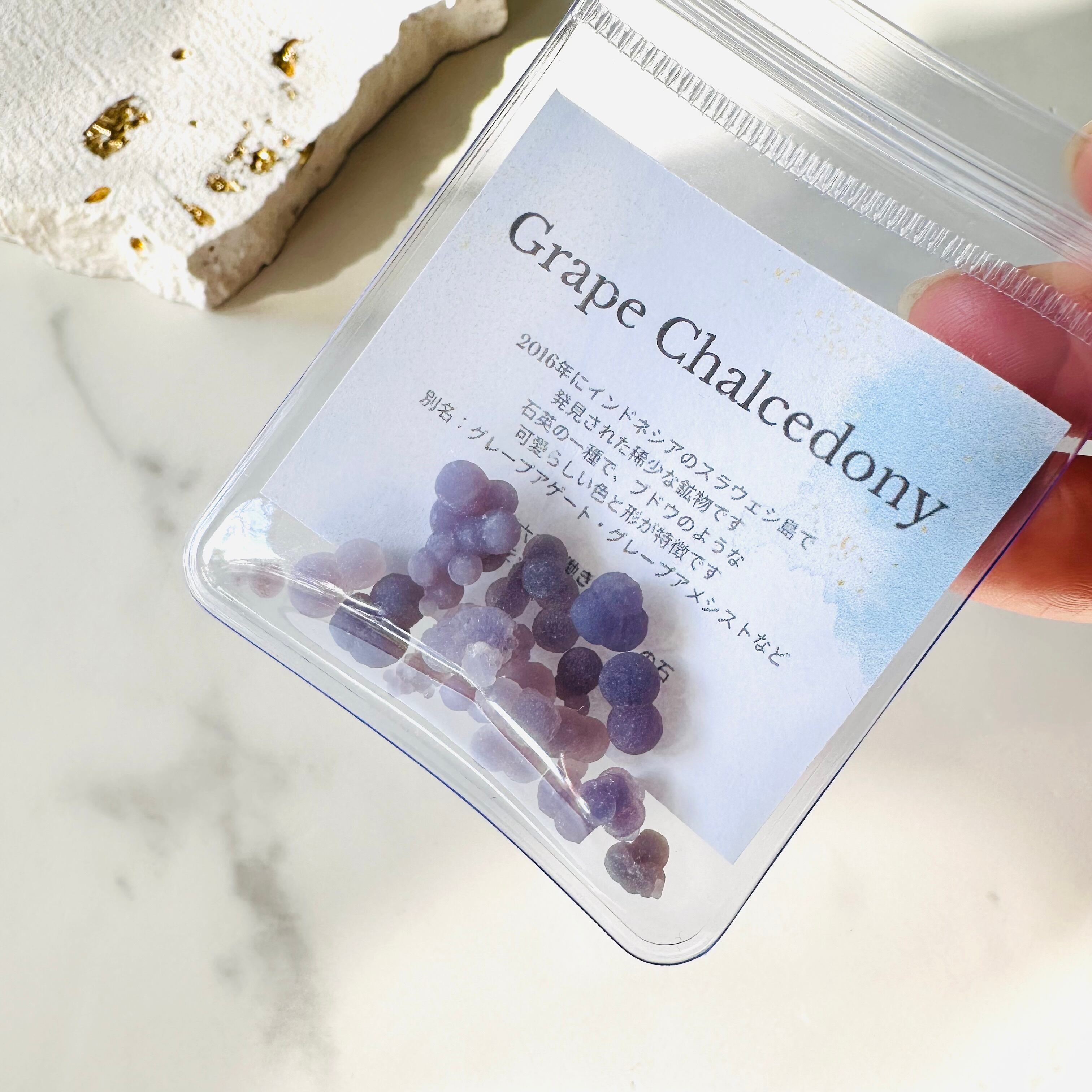 グレープカルセドニーは2016年にインドネシアのスラウェシ島で発見された鉱物です。現在のところ産地がスラウェシ島に限定される希少種です。別名をグレープアゲート、グレープアメシストともいいます。石英の一種で、ブドウのような可愛らしい形と色をしていることからこの名前になりました。