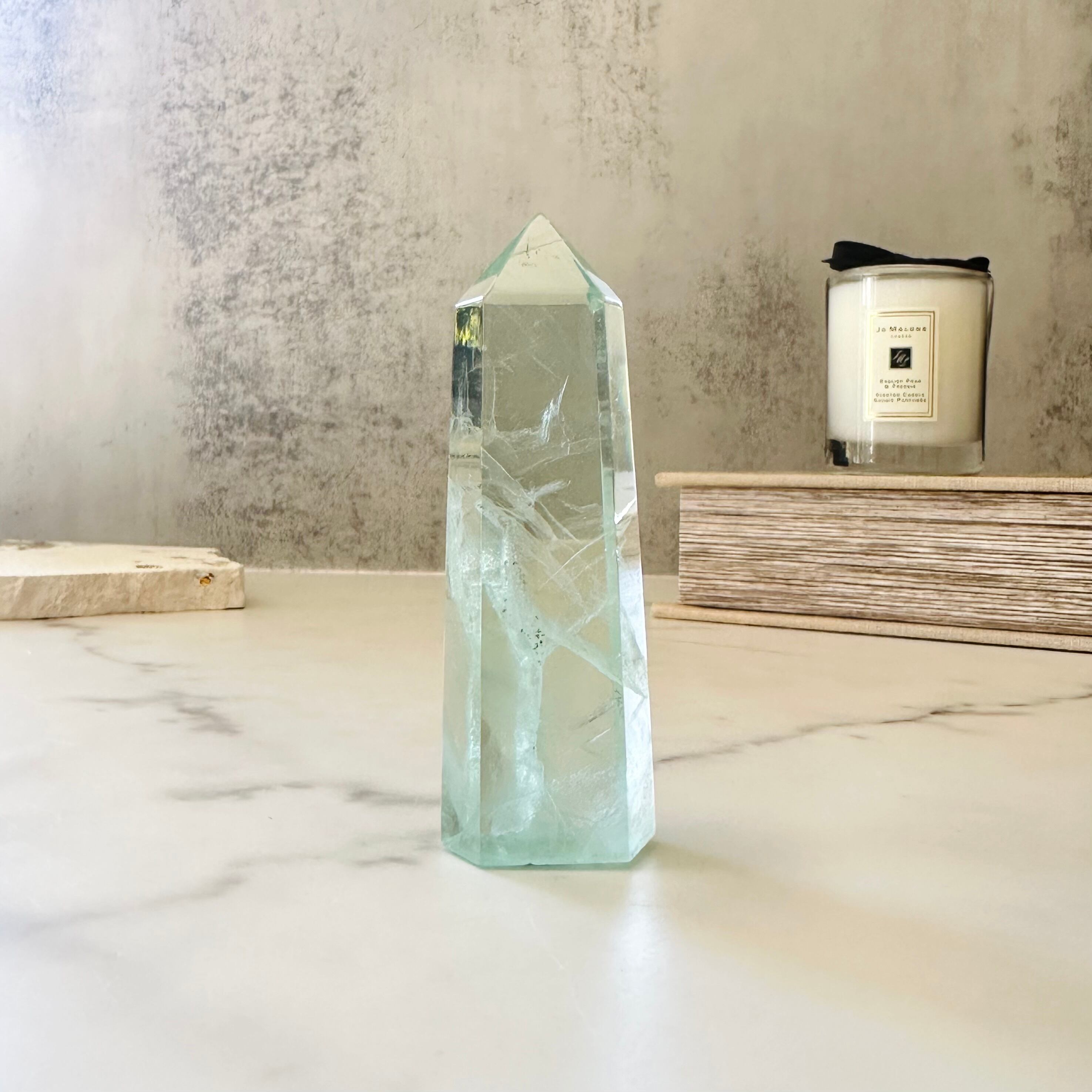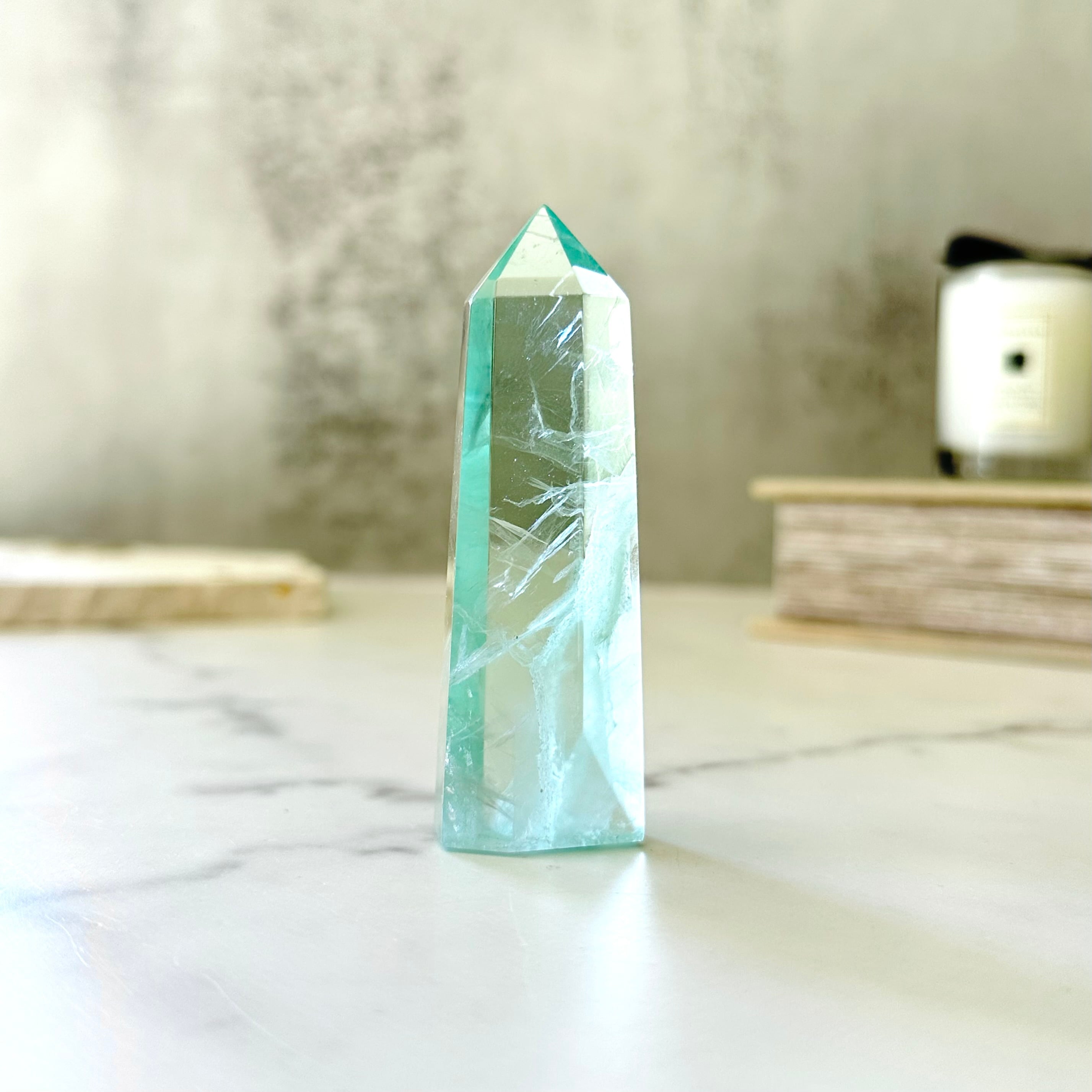 透き通った鮮やかなグリーンが美しいフローライト。スーパークリアなアイテムです。よく見ると細かく散りばめられた虹がとても綺麗で、色の濃淡もあって楽しめます。