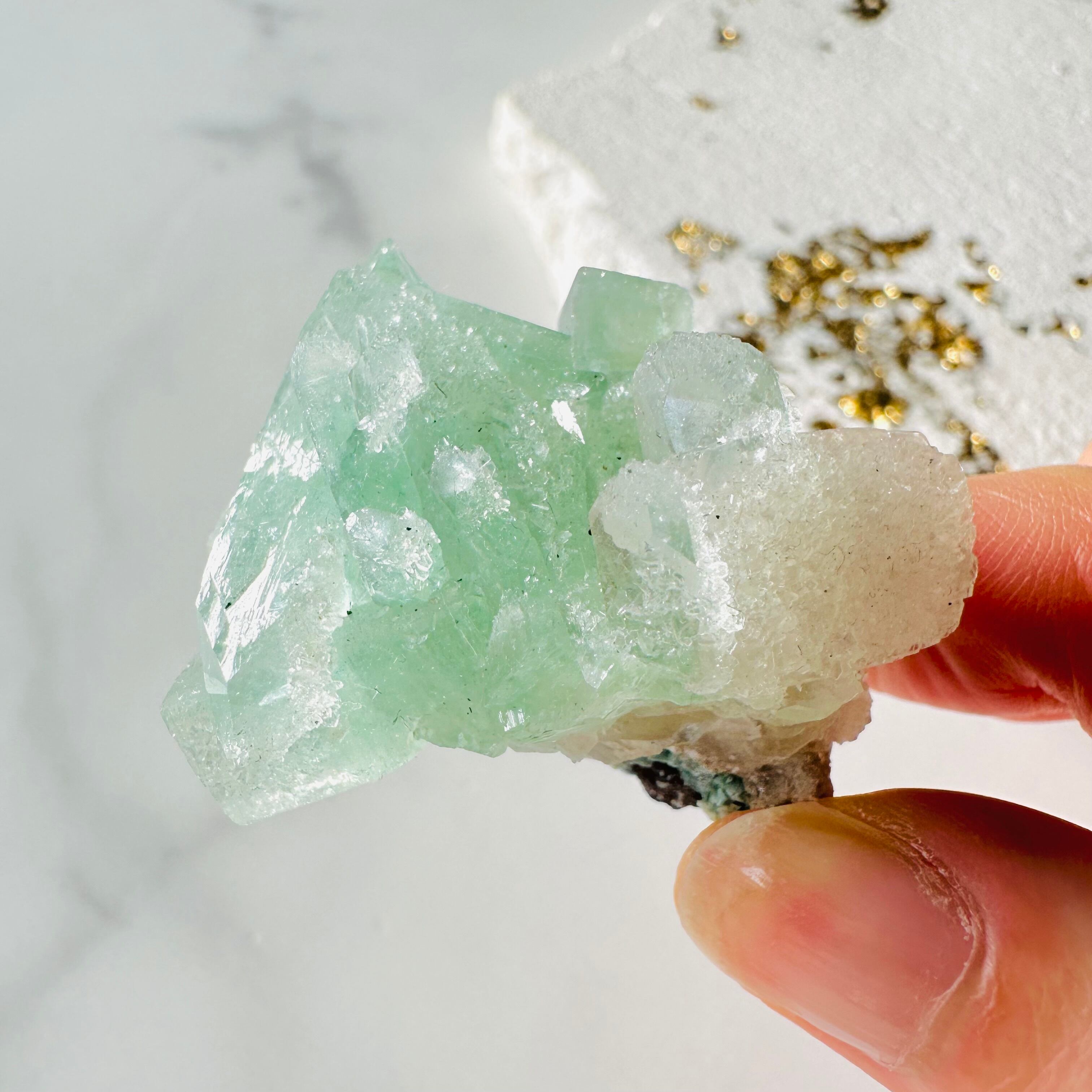 アポフィライトの中でも希少性が高く人気が高いグリーンアポフィライト。このクラスターは美しいライトグリーンの発色と、お砂糖をまぶしたようなキラキラした結晶が魅力です。品良く美しいグリーンの色合いと煌めきが癒しを与えてくれます。また白い束状の結晶は、スティルバイトの共生です。