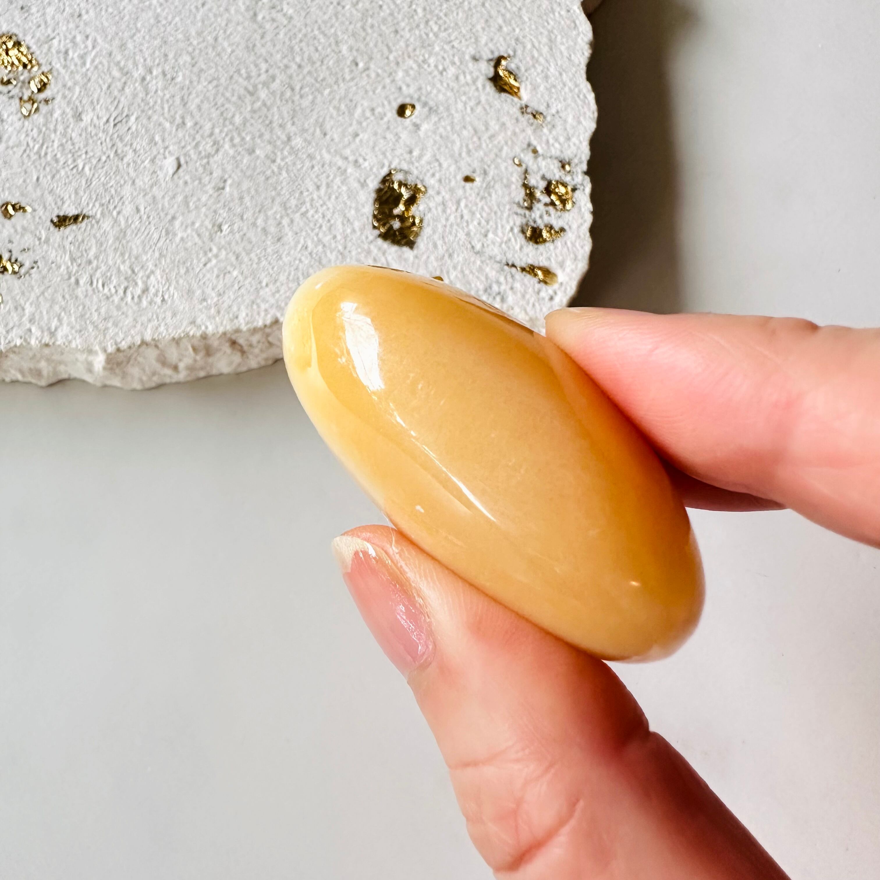 鮮やかなオレンジゼリーのように艶やかなオレンジカルサイトのパームストーンです。カルサイトのほんのり透け感のある軽やかな質感と、美しい発色が綺麗で、明るくポジティブな気持ちにさせてくれるアイテムです。