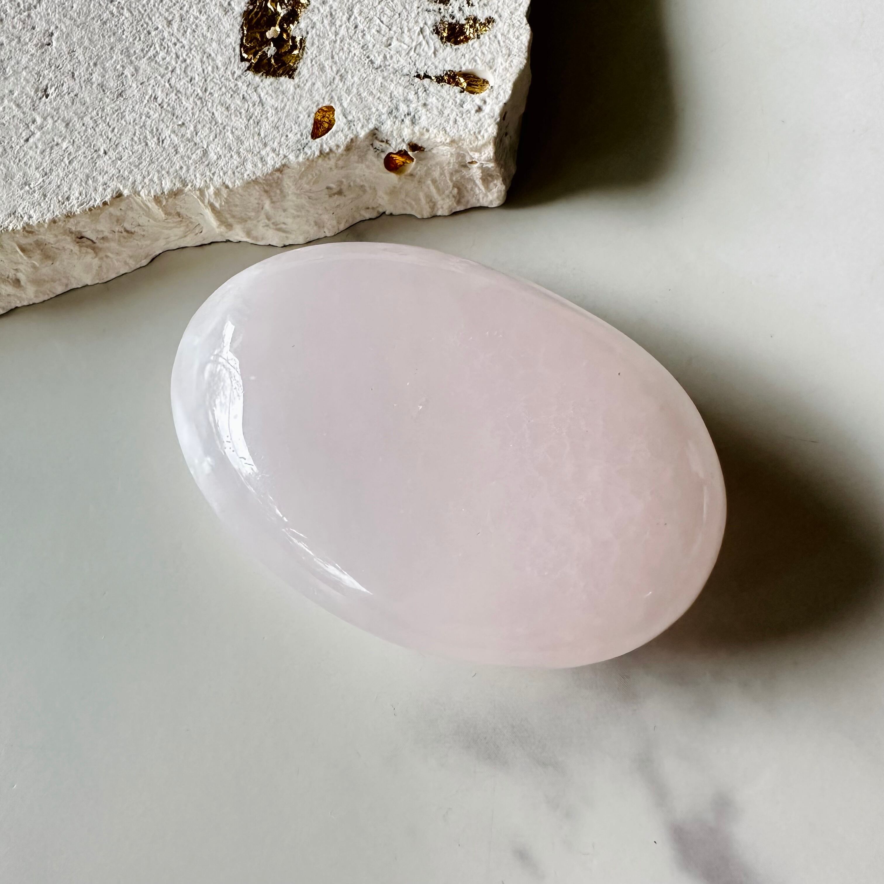 淡いピンク色が可愛いピンクカルサイトのパームストーン。