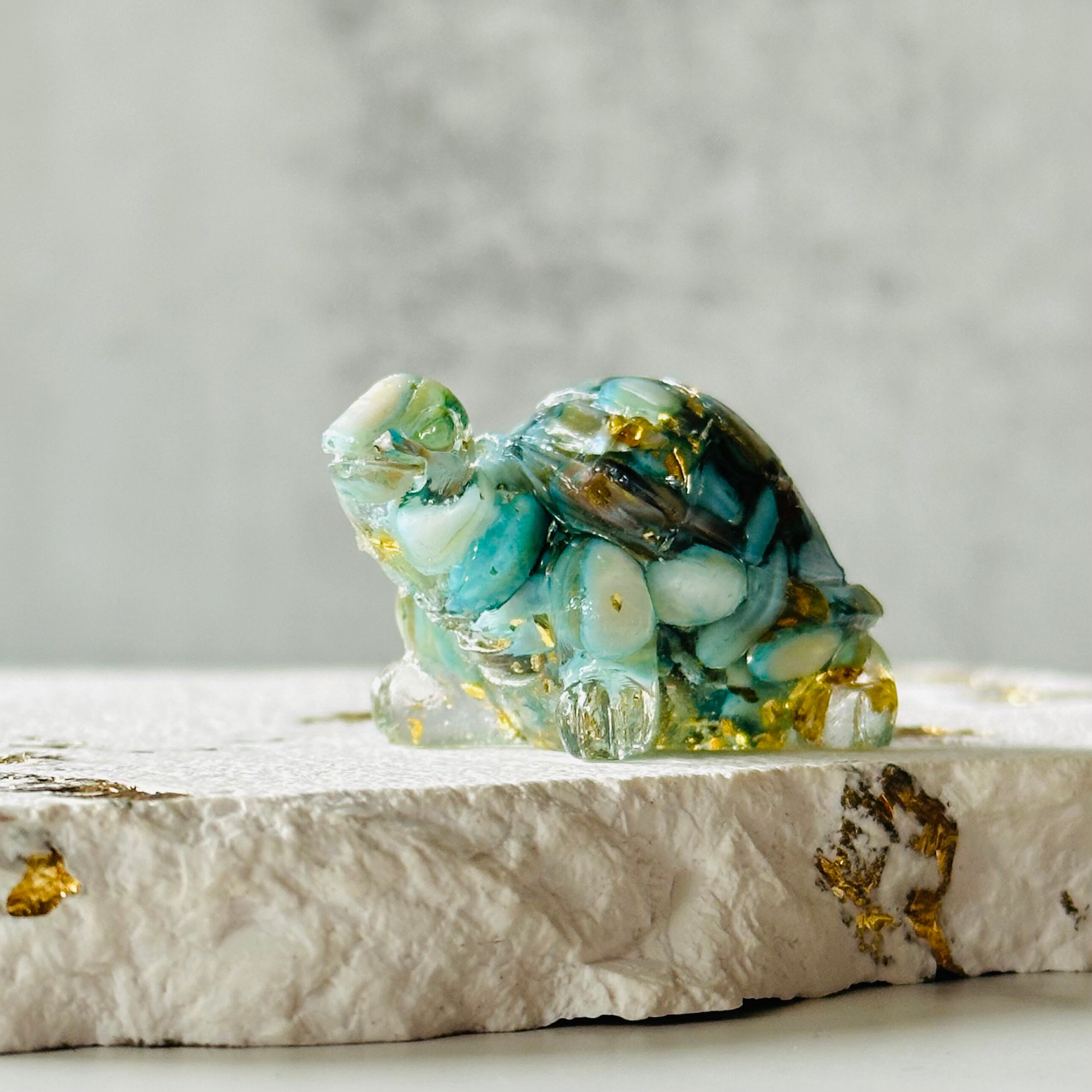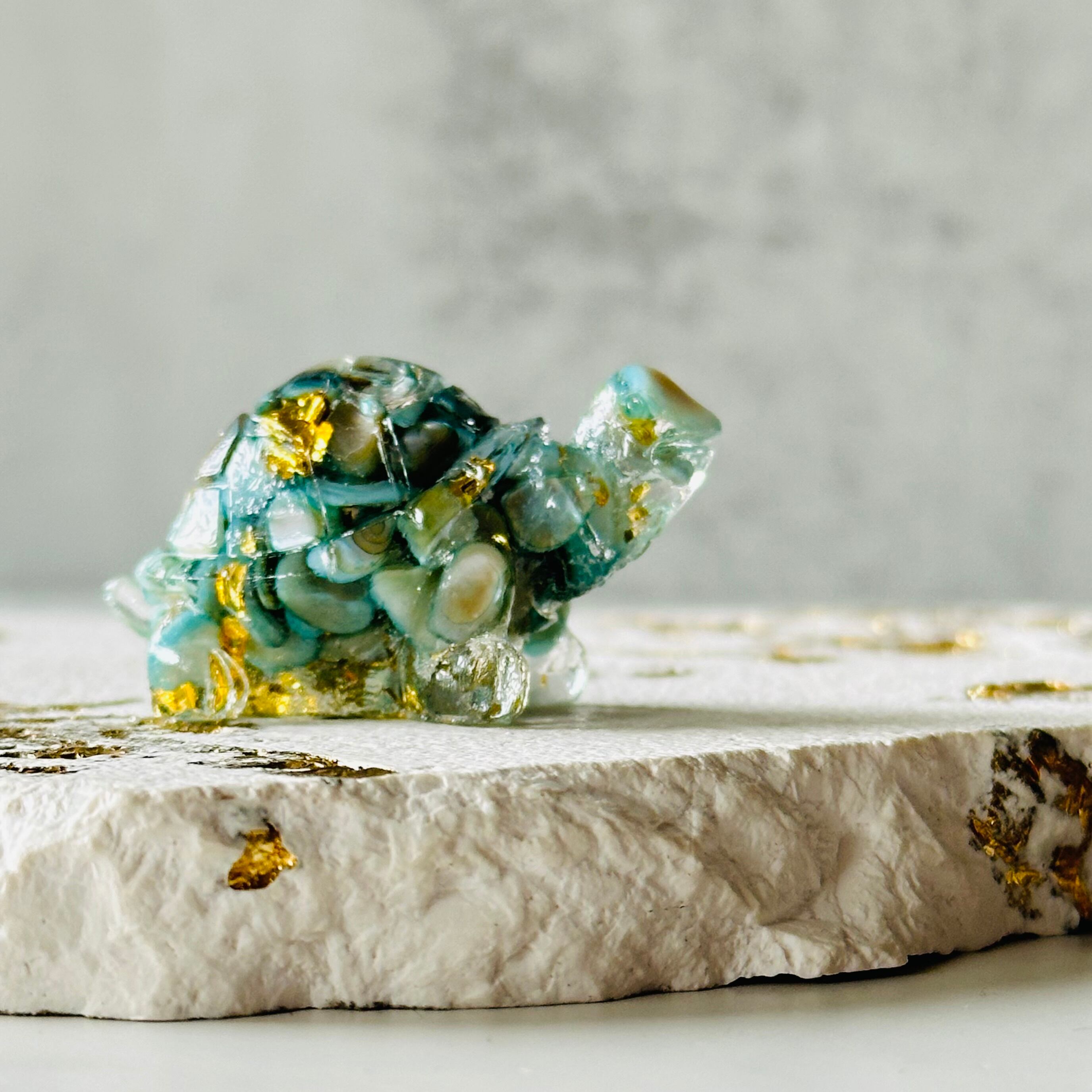アコヤ貝(パールシェル)に染色をして樹脂で固めた可愛い亀さんです。