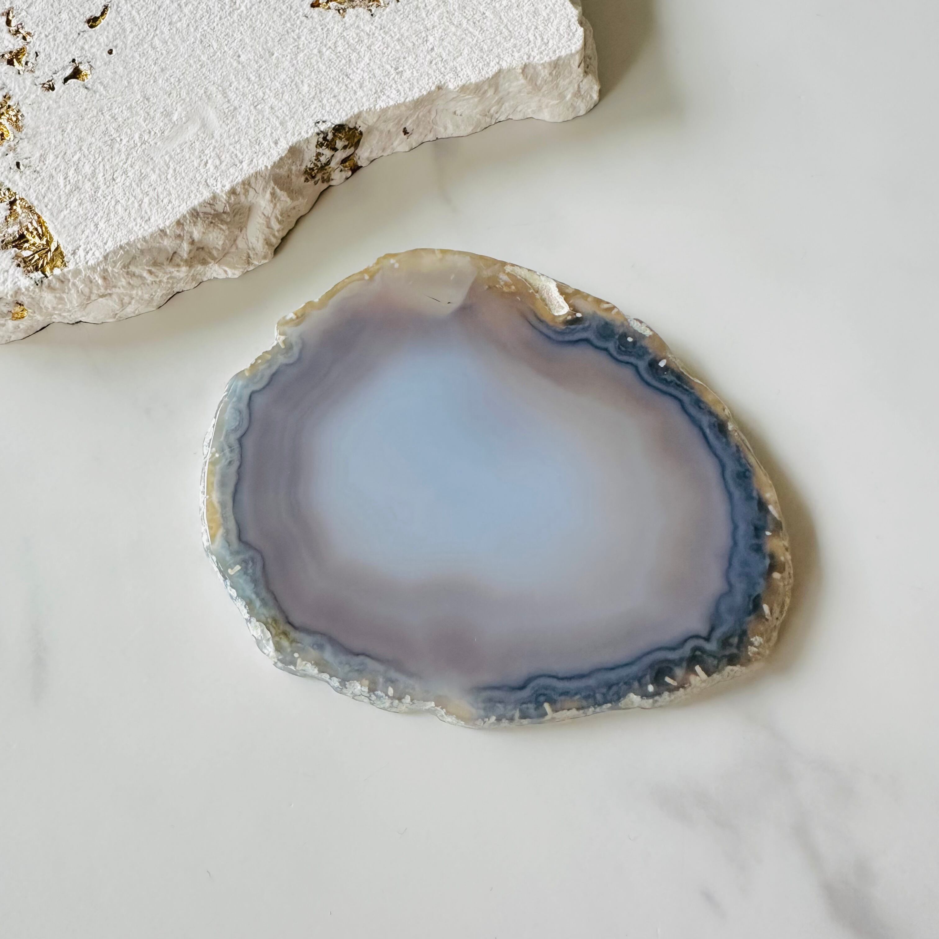 やや青みを帯びたグレイのニュアンスカラーがインテリアにも馴染みそうなアゲートプレートです。天然のままの優しい色合いで、丸みをおびた形に美しい透かし模様が浮かび上がり繊細な表情を見せてくれます。アゲートの柔和で女性的な雰囲気が包み込むような癒しを与えてくれます。