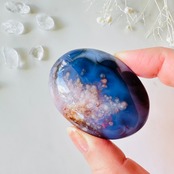 青紫色の石にピンク色の花霞を吹き流したような魅力的なブルーフラワーアゲートパームストーンです。レースのような模様と、艶のある質感、美しい色合いが魅力です。この色合いは天然の色です。手のひらサイズの握りやすい大きさで、ぎゅっと握れば心が落ち着き、極上の癒しの時間を演出します。他のお石と組み合わせてお部屋のお気に入りのスペースに飾るのもおすすめです。