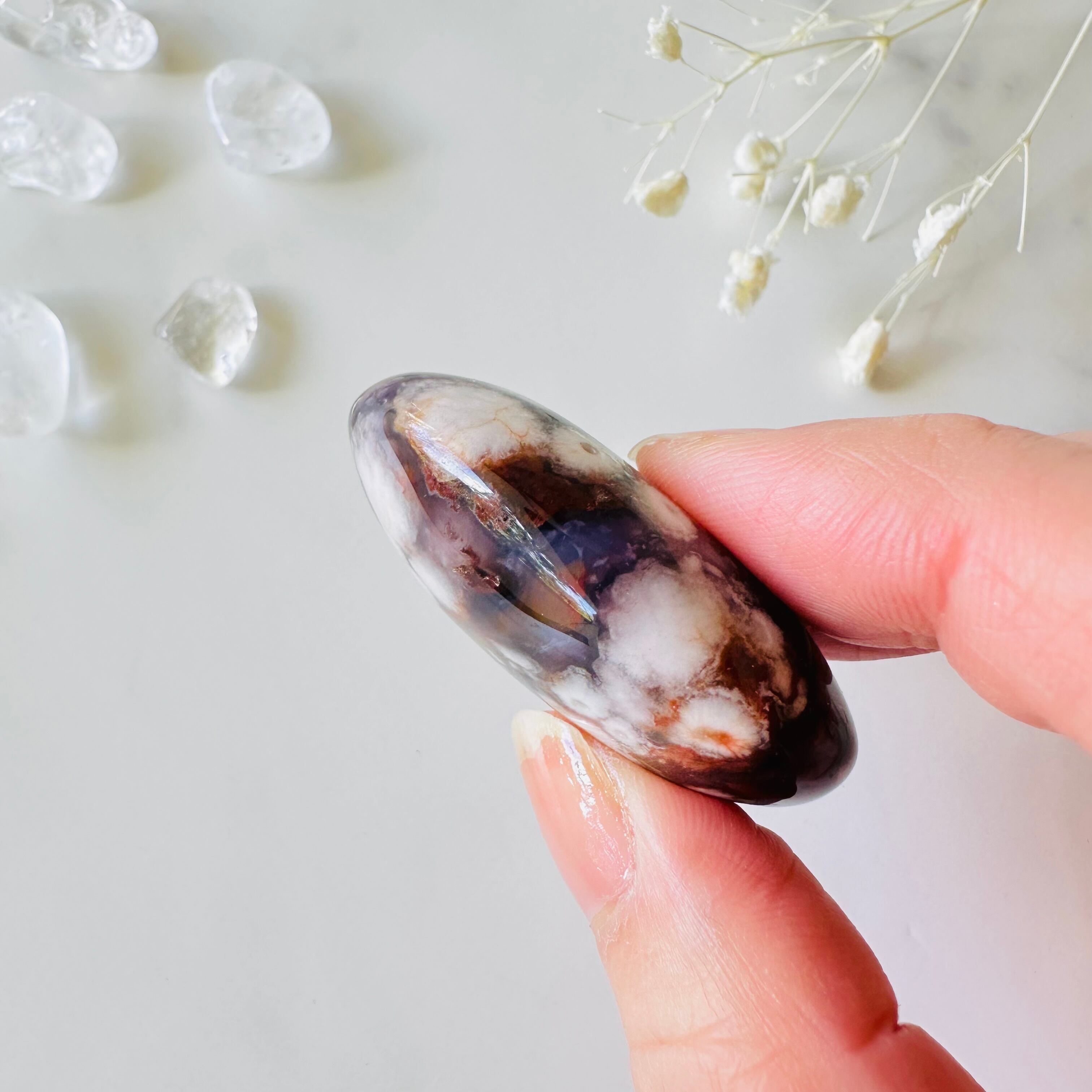 青紫色の石にピンク色のお花が咲いたような魅力的なブルーフラワーアゲートパームストーンです。艶のある質感、美しい色合いが魅力で隙間からのぞく赤いクォーツがアクセントになっています。この色合いは天然の色です。小さめサイズのが可愛らしく、ぎゅっと握れば心が落ち着きます。他のお石と組み合わせてお部屋のお気に入りのスペースに飾るのもおすすめです。
