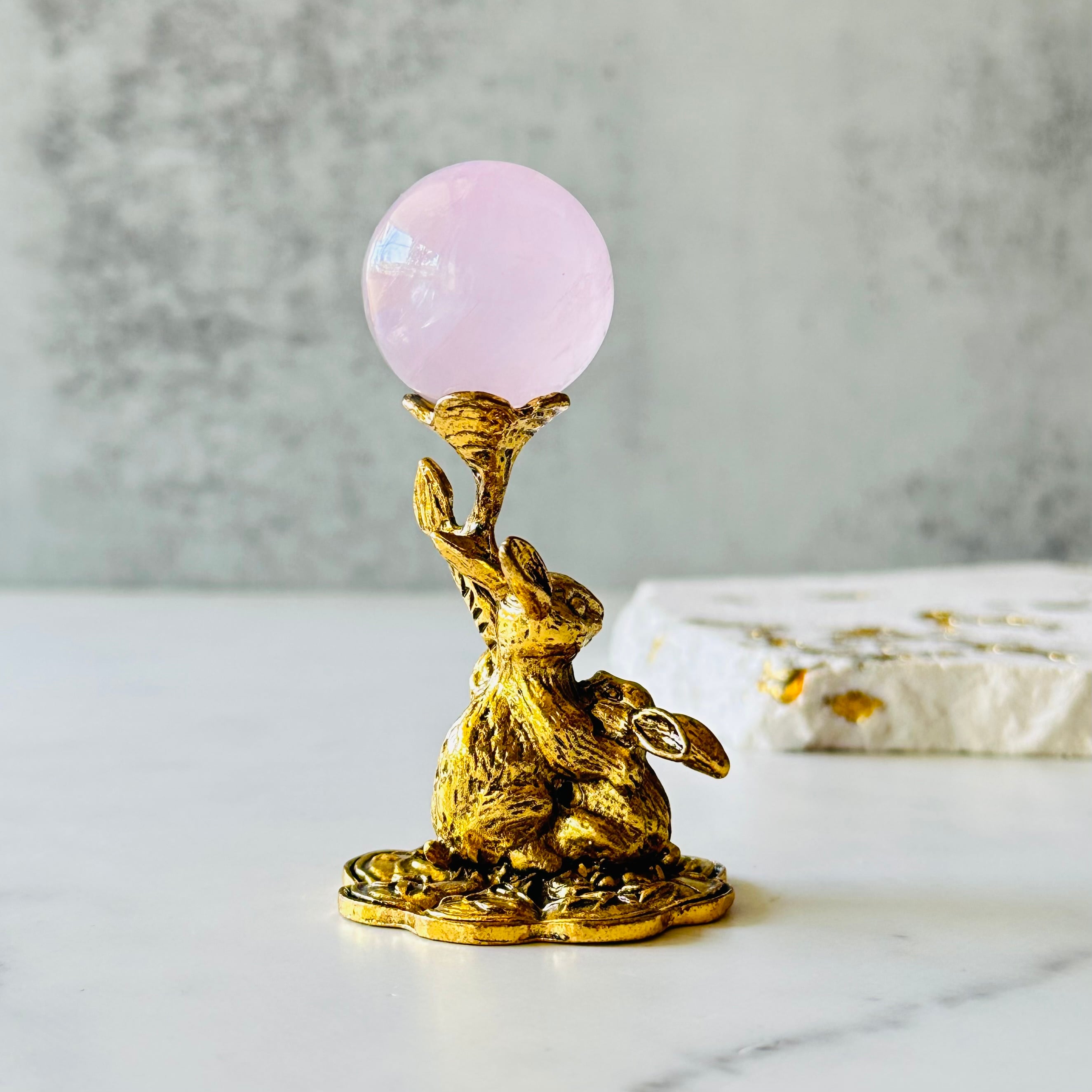 金色に輝くうさぎさんのスフィアスタンドです。寄り添う親子のうさぎさんがスフィアを支えてくれます。小さめサイズのスフィアやエッグに向いています。お部屋のインテリアにどうぞ。