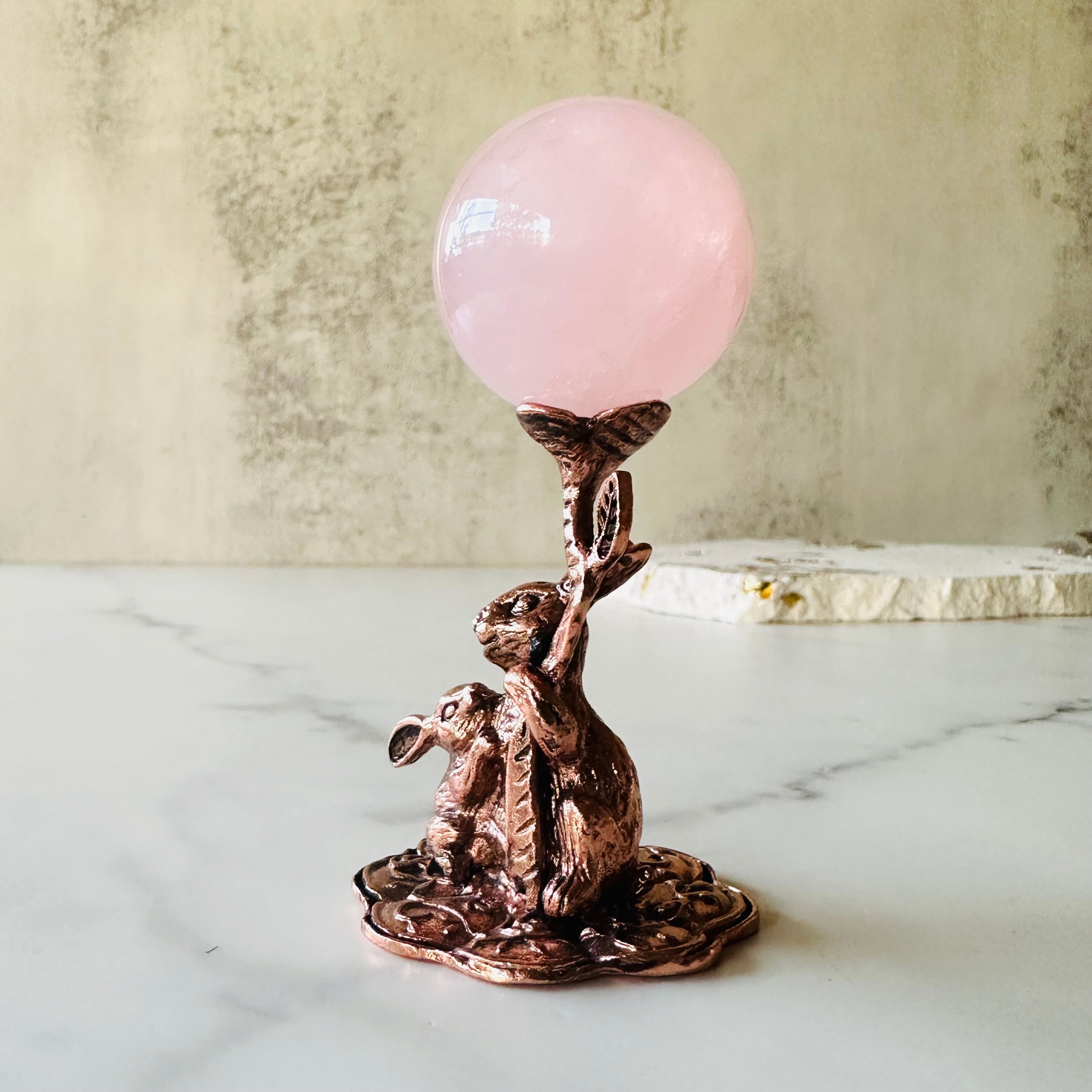 ピンクゴールドに輝くうさぎさんのスフィアスタンドです。寄り添う親子のうさぎさんがスフィアを支えてくれます。小さめサイズのスフィアやエッグに向いています。お部屋のインテリアにどうぞ。