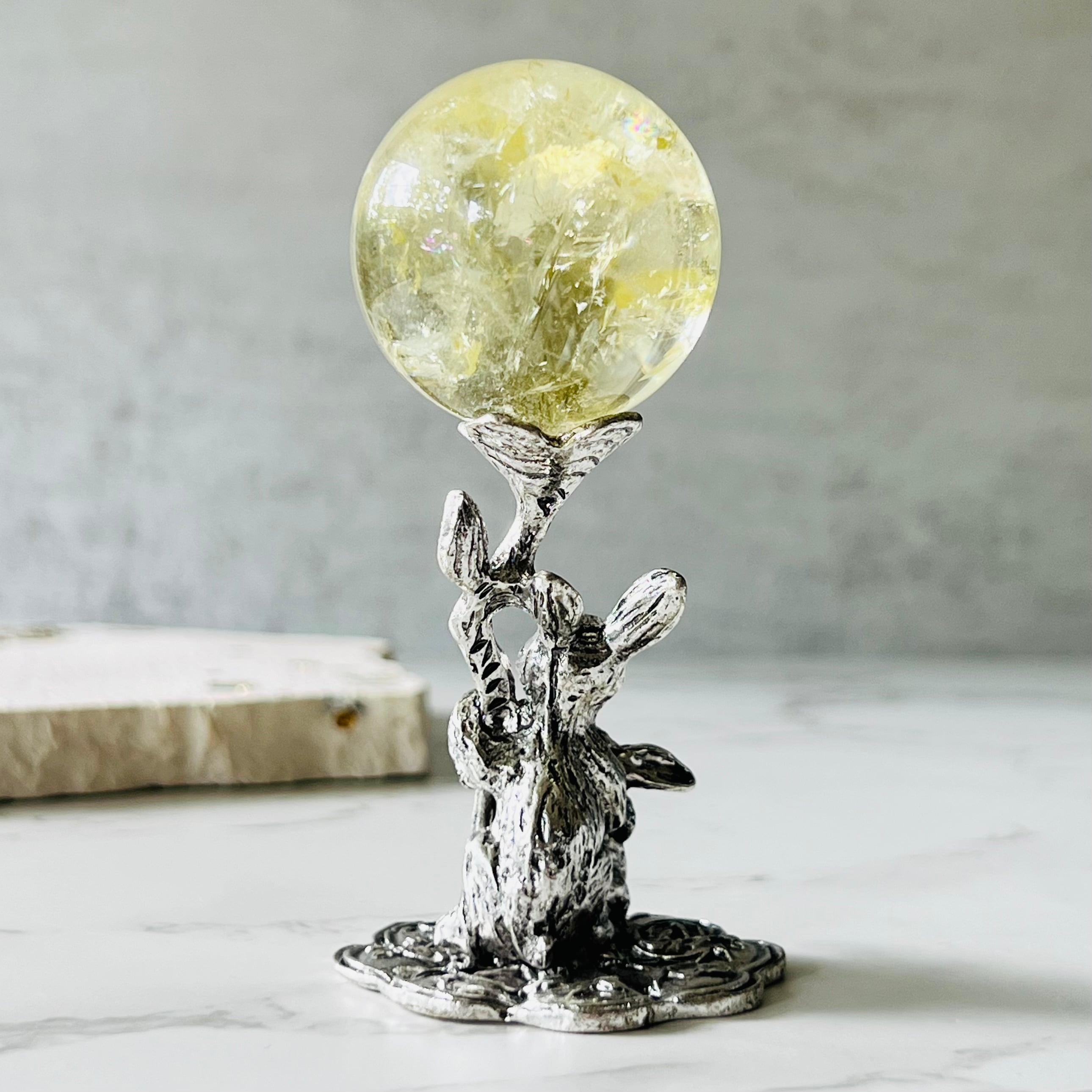 シルバーに輝くうさぎさんのスフィアスタンドです。寄り添う親子のうさぎさんがスフィアを支えてくれます。小さめサイズのスフィアやエッグに向いています。お部屋のインテリアにどうぞ。