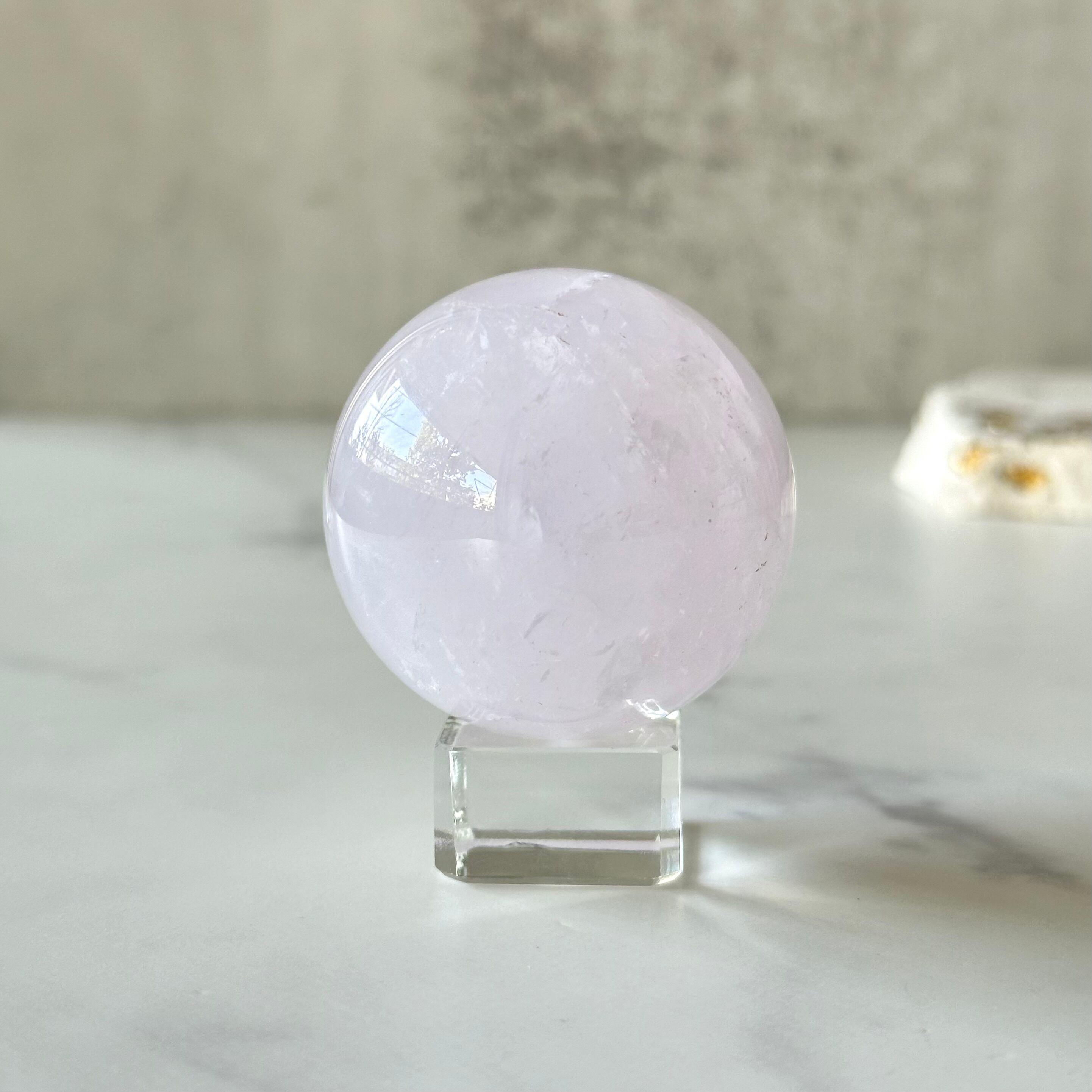 薄いラベンダーピンクのペリウィンクルローズクォーツのスフィアです。