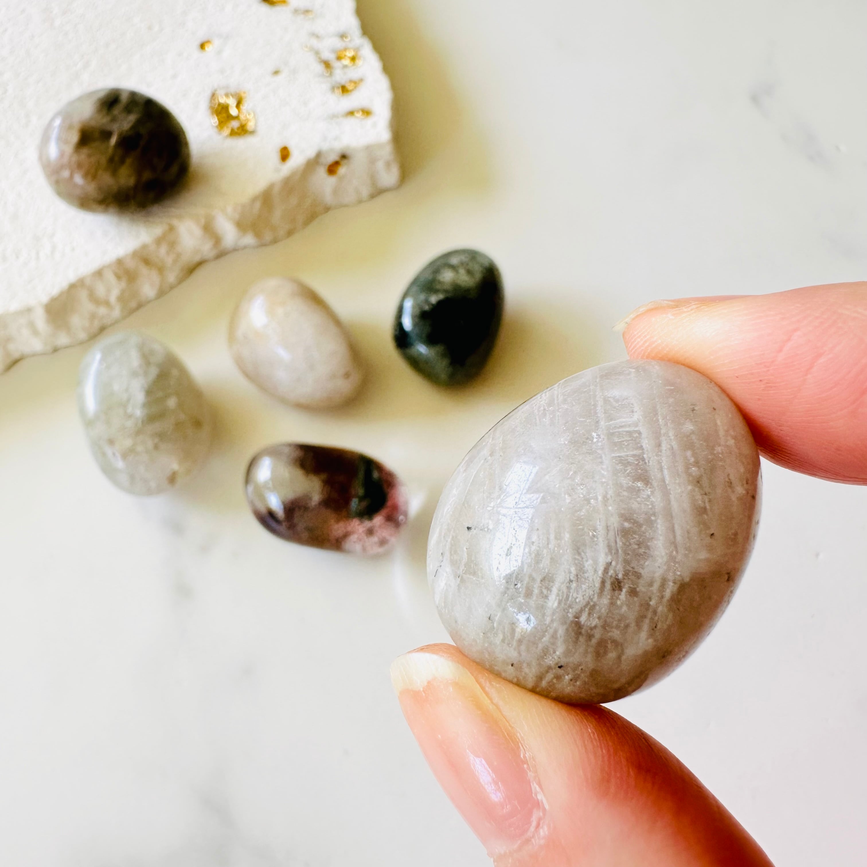 天然石のタンブルです。タンブルとは指でつまめるサイズの小石のこと。お気に入りの石を集めてあなただけのコレクションを作ってください。その中から、その日の気分に合わせてピンときた石をチョイス。ポケットに入れてさあ出かけましょう。
