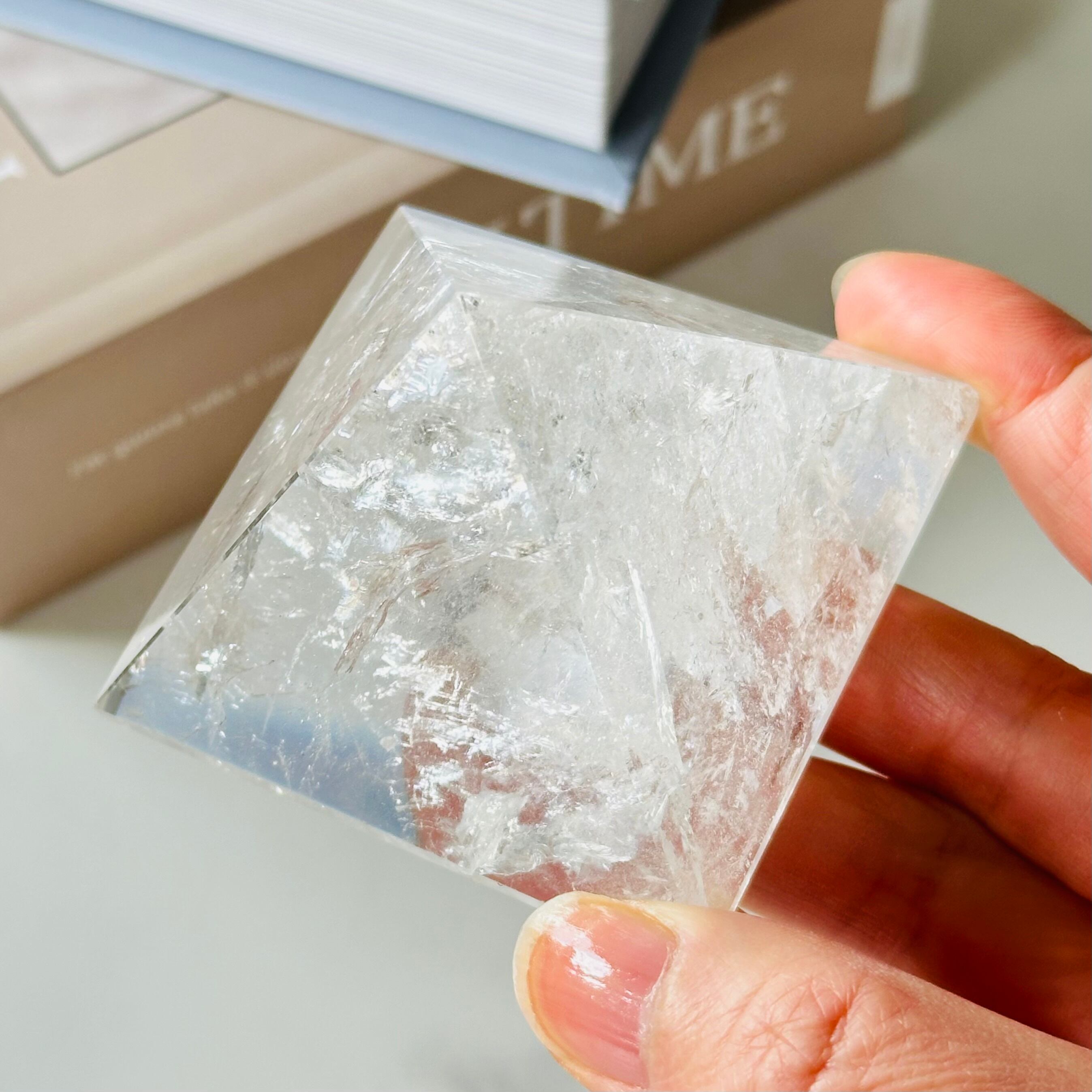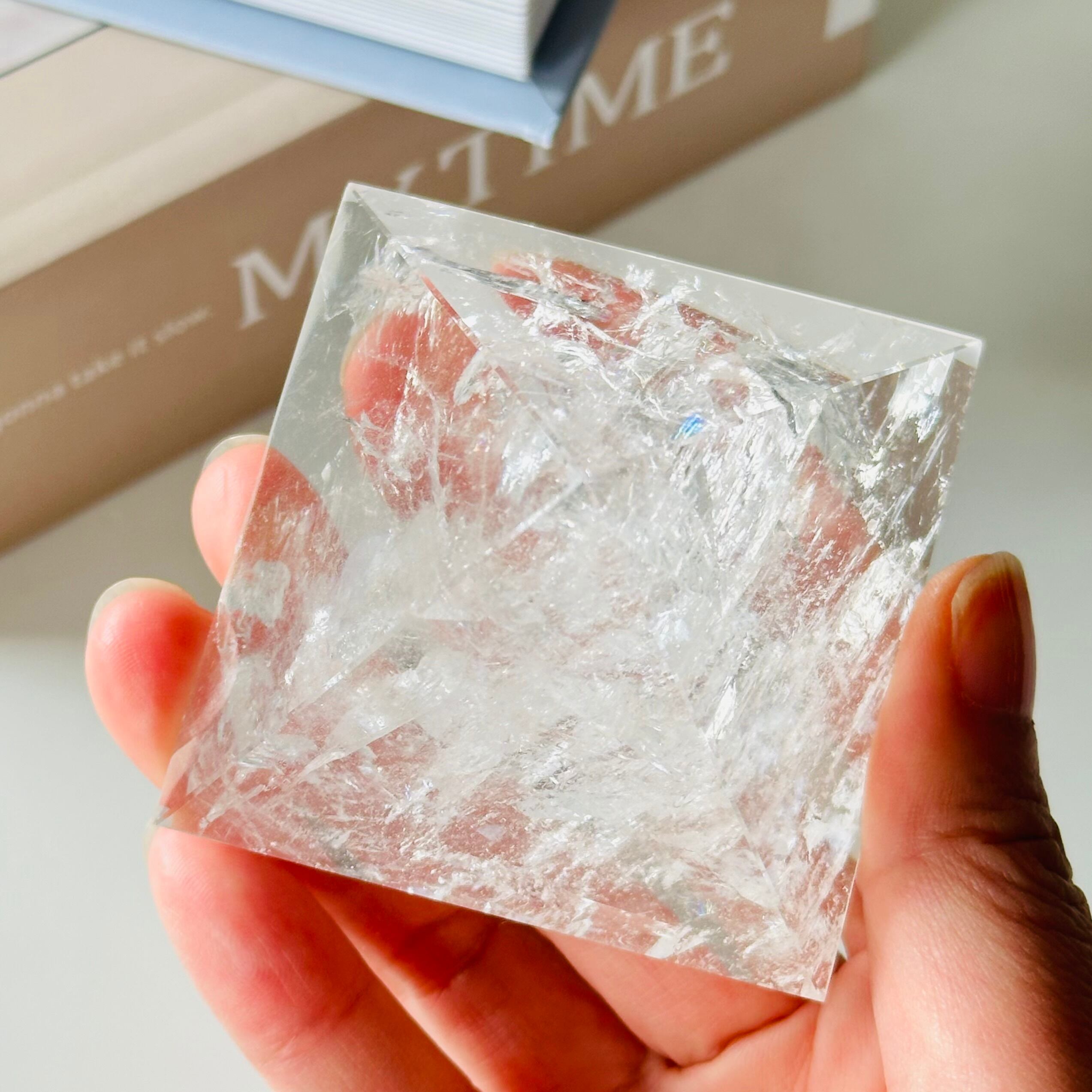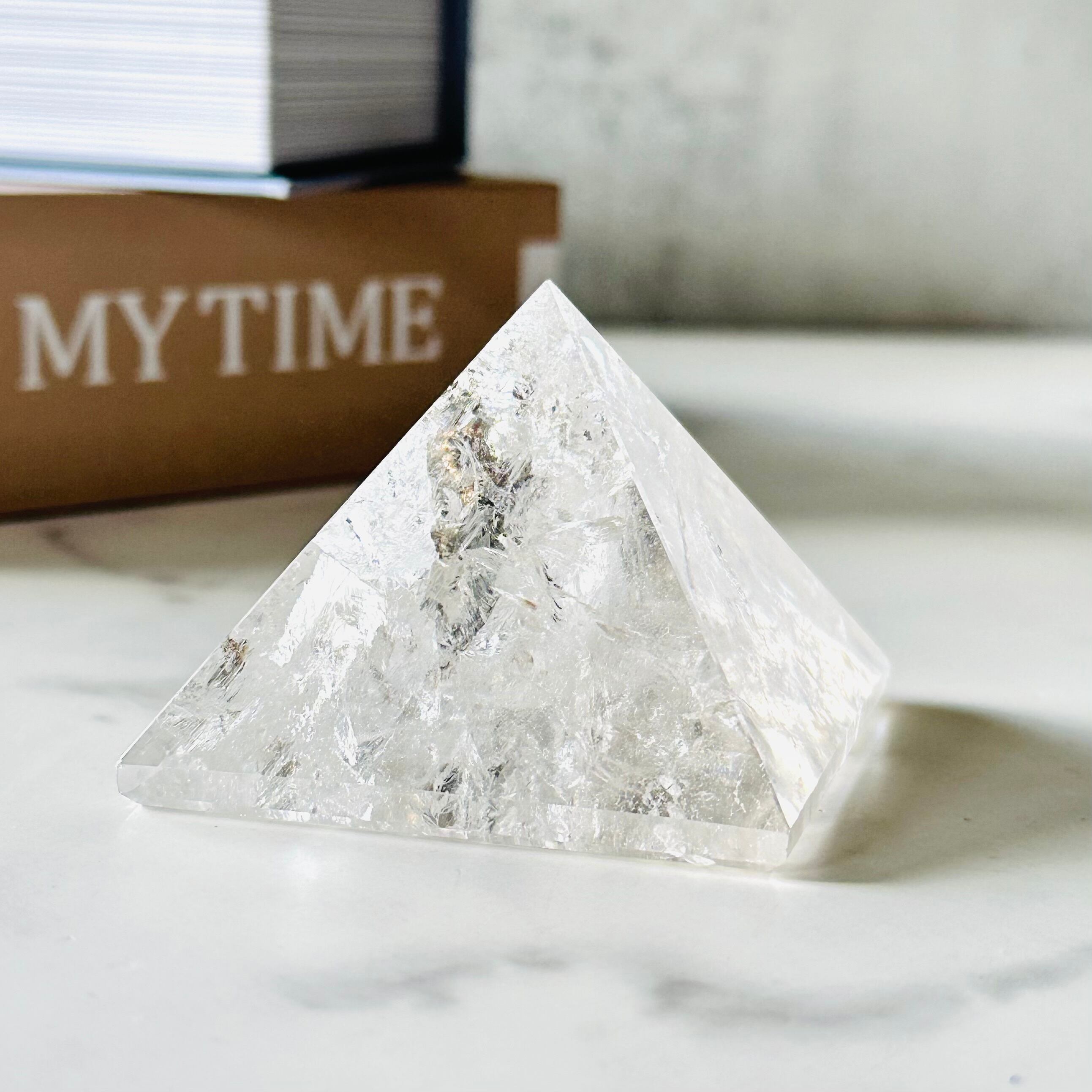 太陽の光を閉じ込めたような力強い輝きと清らかな水のような透明度が特徴のエネルギー溢れるレムリアンのピラミッドです。その静謐な波動は感性の奥深くにたどりつき、深く鋭い直感力と洞察力を養ってくれるでしょう。美しい虹もたっぷりと宿す特別なマスタークリスタルです。