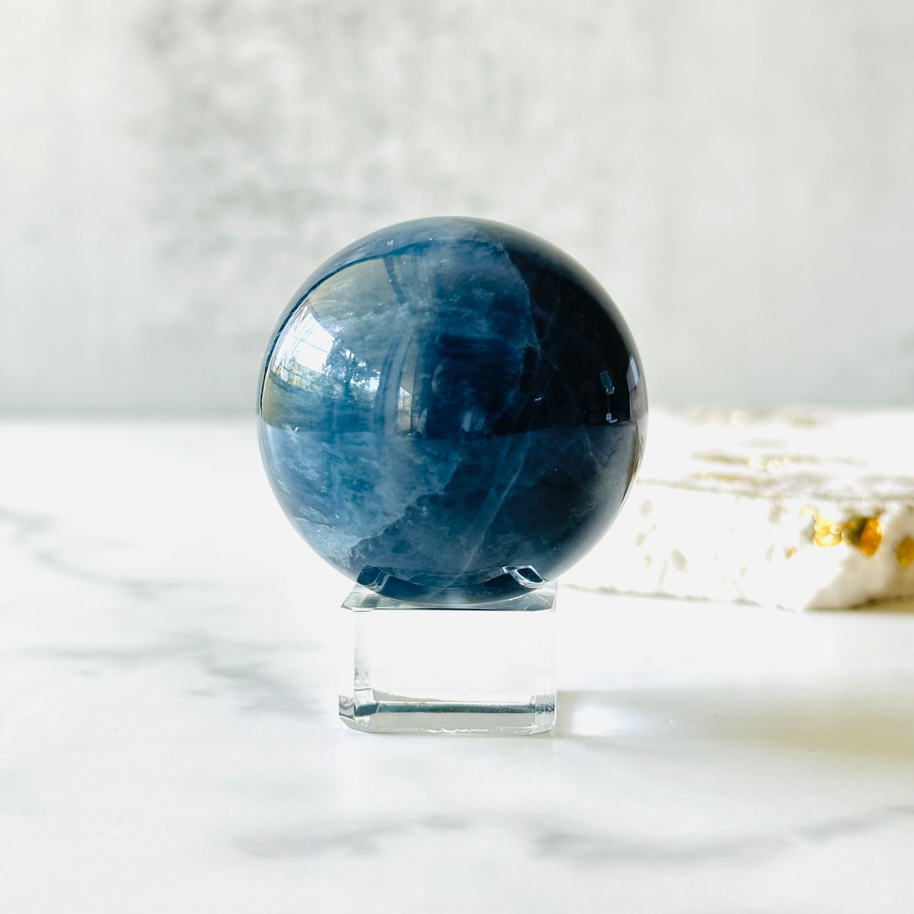深海を連想させる深いブルーが神秘的なブルーフローライトのスフィアです。