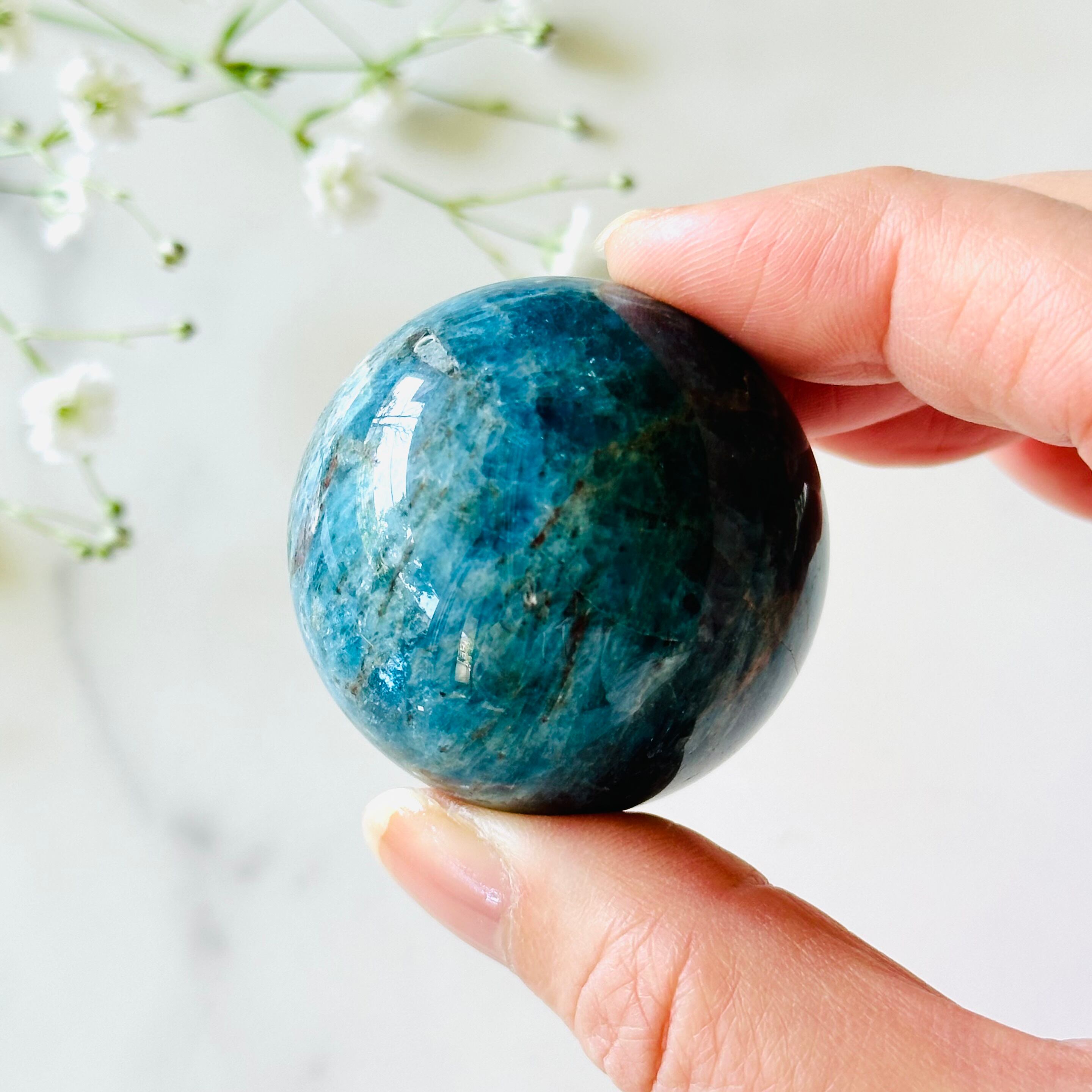 美しいブルーの色合いが海や空、地球を連想させます。自然の美しさを感じながらこの小さなスフィアを手に取ると、自分自身が宇宙の一部であると感じられるような気がします。表面には細かい煌めきが美しく輝きます。いつまでも見飽きることなく時間を忘れてしまうアイテムです。