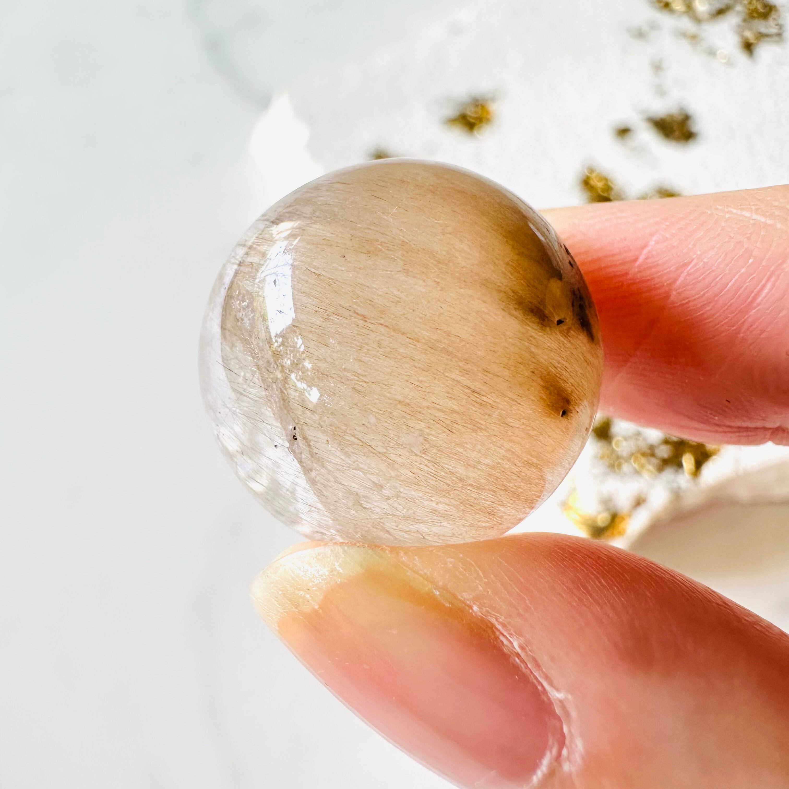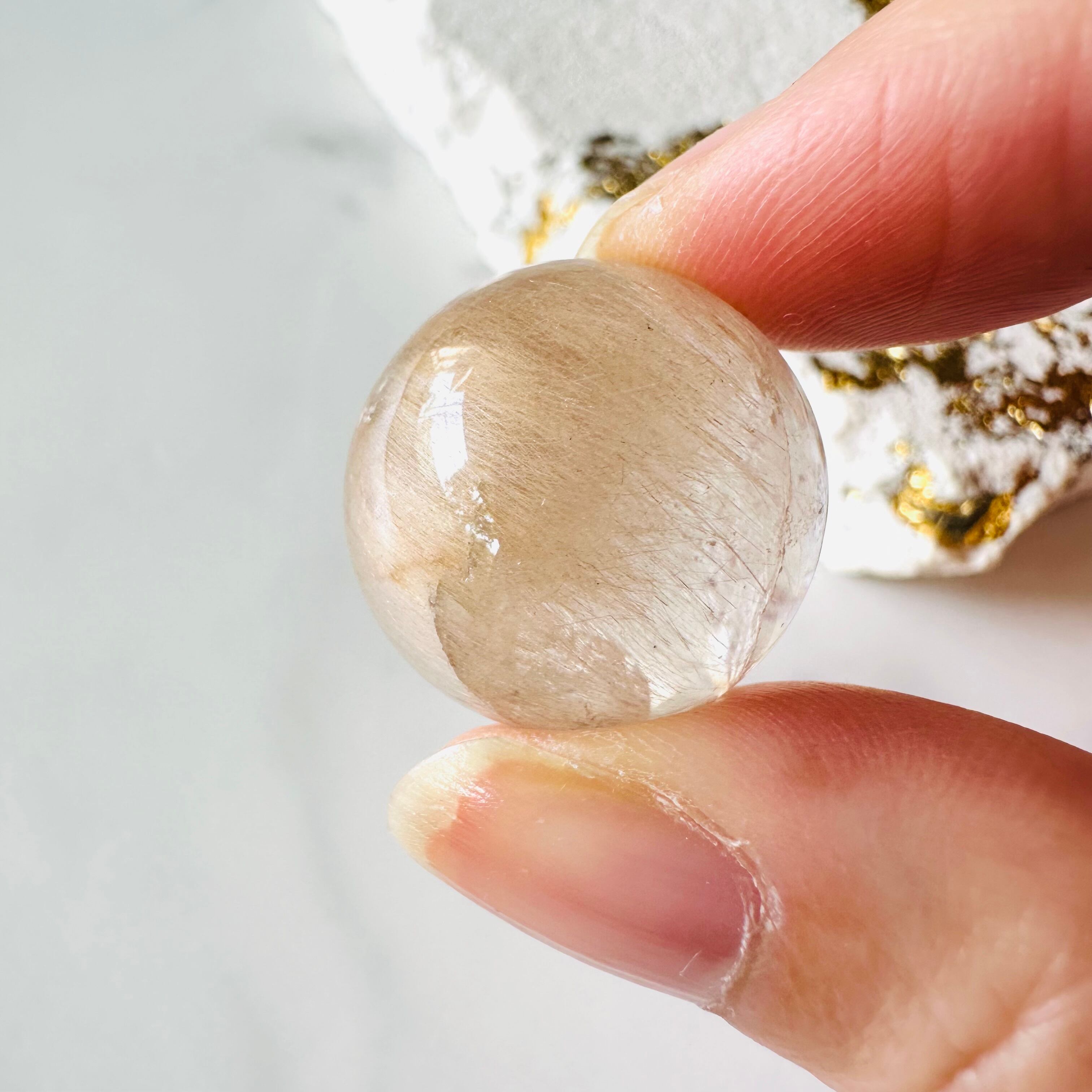サゲニティックはギリシャ語で「網」を意味する「sagena」が名前の由来とされています。和名は「針入り水晶」。優しいベージュカラーの細く繊細な針状結晶がたっぷり入ってとても綺麗です。