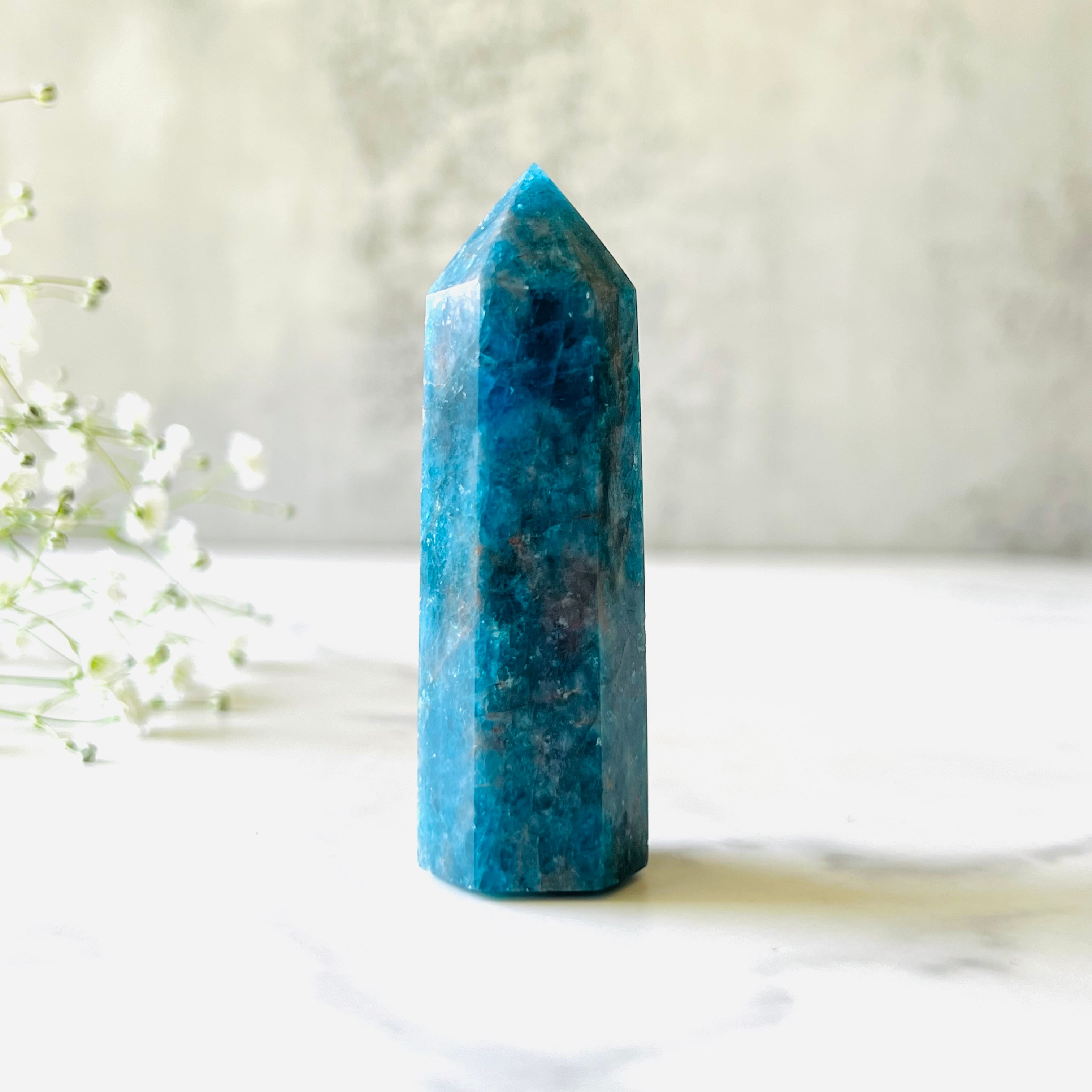 ブルーアパタイトタワーは、地球の神秘的なエネルギーを感じることができるヒーリングストーンです。鮮やかで美しいブルーが心を落ち着かせ、お部屋の波動を調整してクリアに保ってくれます。デスクやリビングルームなど、エネルギーを高めたい場所に飾ってみてください。