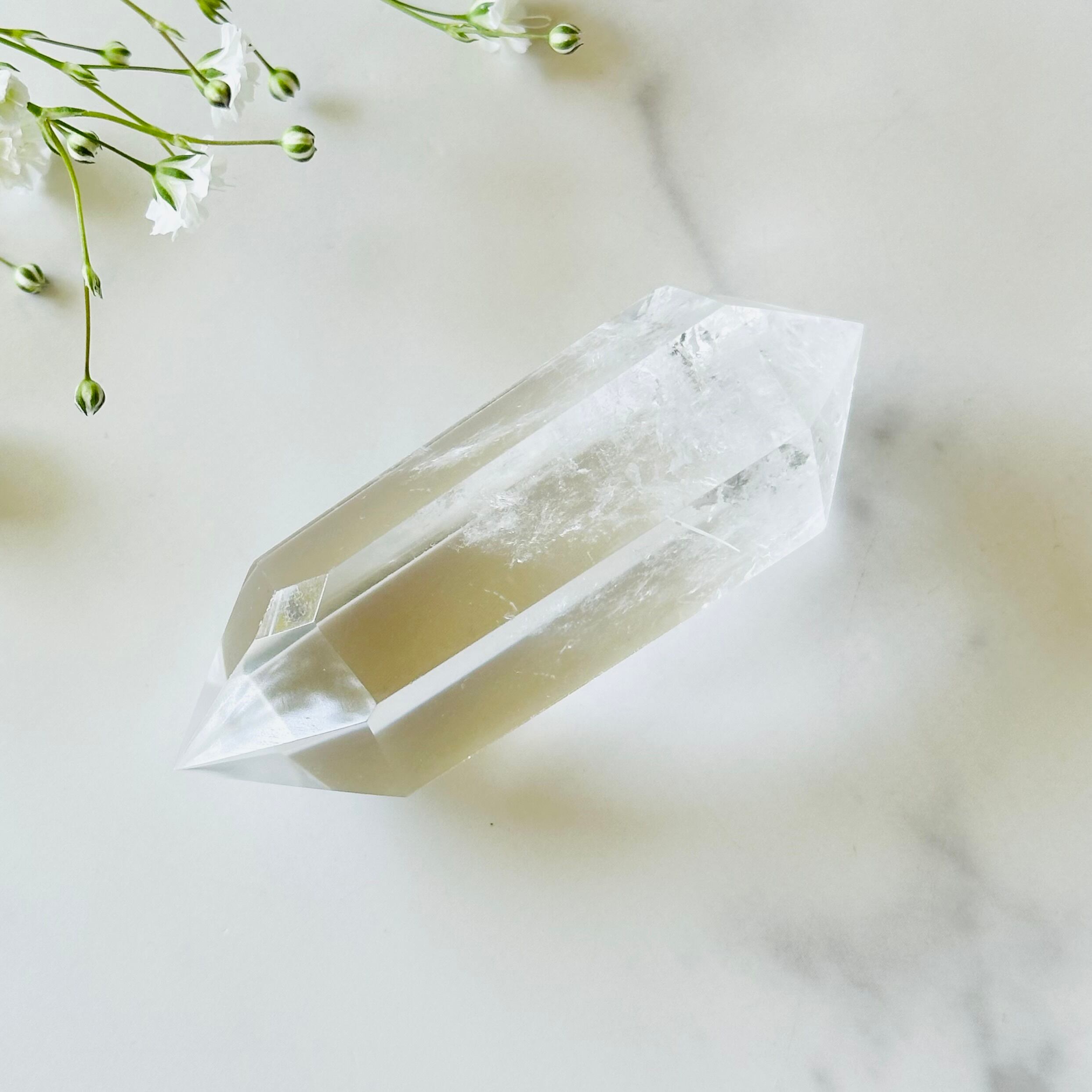 クリアな水晶の両端から強いエネルギーの発揮を感じさせます。マイナスのエネルギーを吸収して取り除き、乱れた精神状態を整えて、ポジティブなエネルギーに変換してくれます。心身のバランスをニュートラルに戻し、さらに前向きな気持ちで行動できるようサポートしてくれることでしょう。
