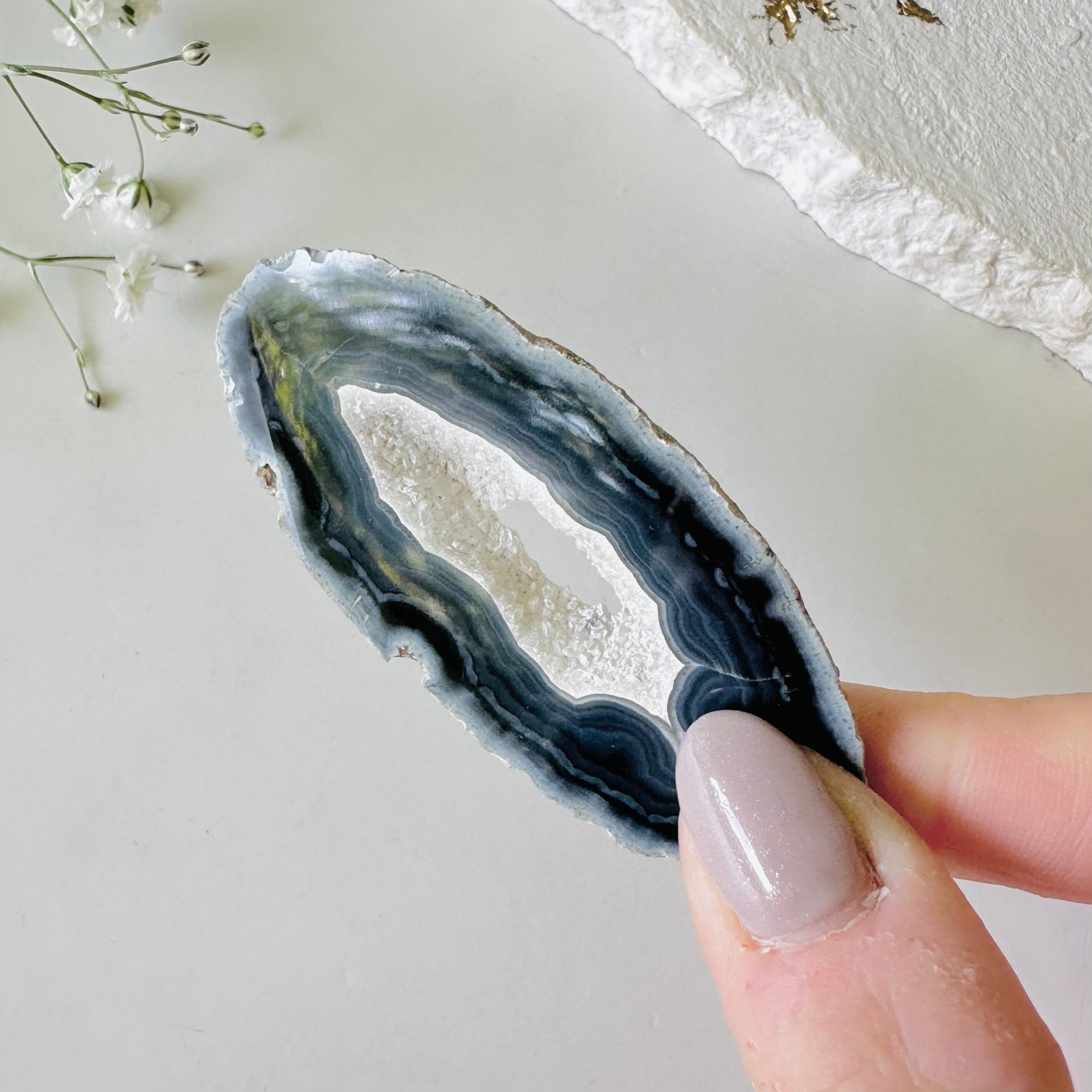 夜の海のような綺麗な深いネイビーが美しいアゲートプレートです。天然のままの色合いが繊細な表情を見せてくれます。ジオード部分にリングや天然石のタンブルを置いても素敵です。ご自身のセンスでインテリアに素敵に取り入れてみてください。