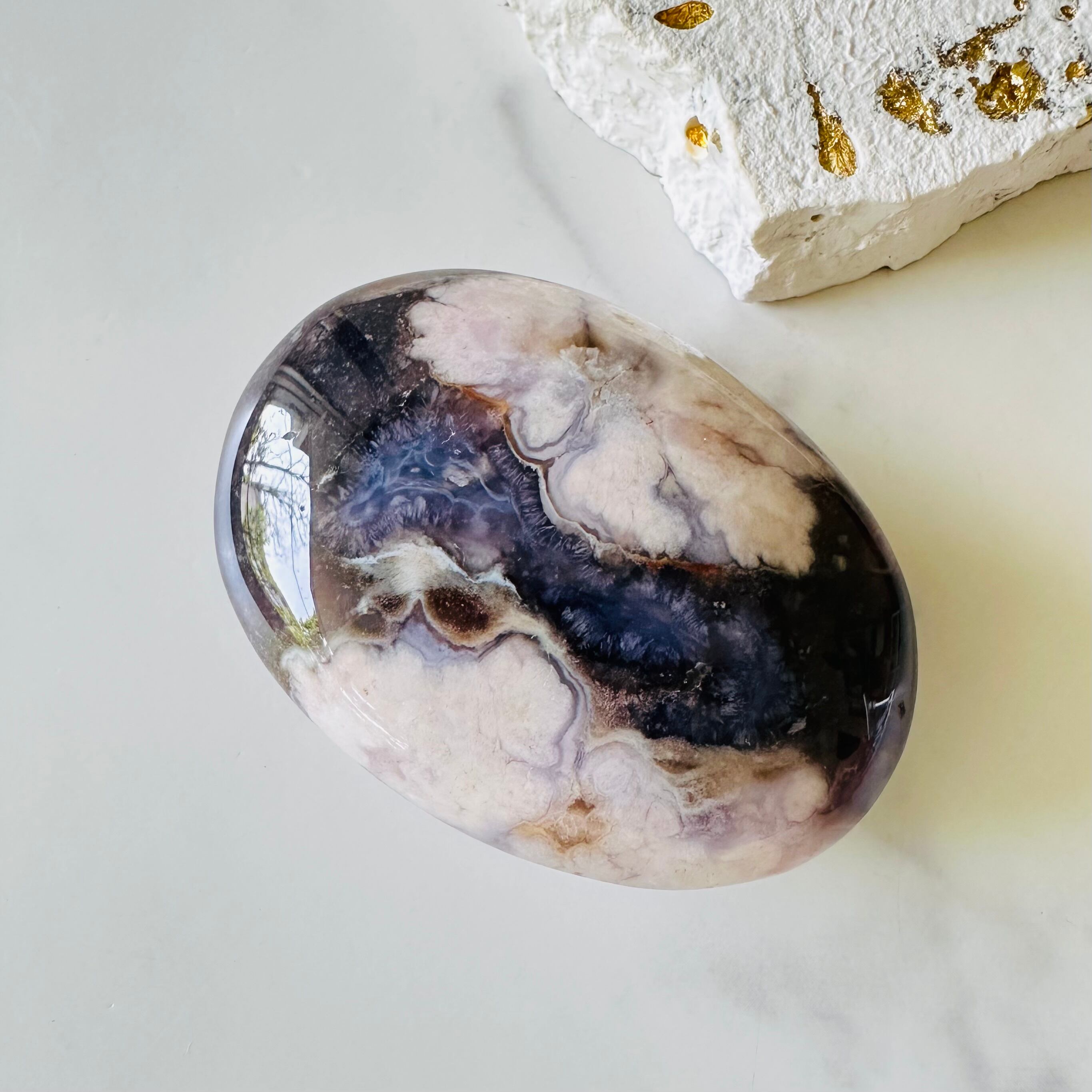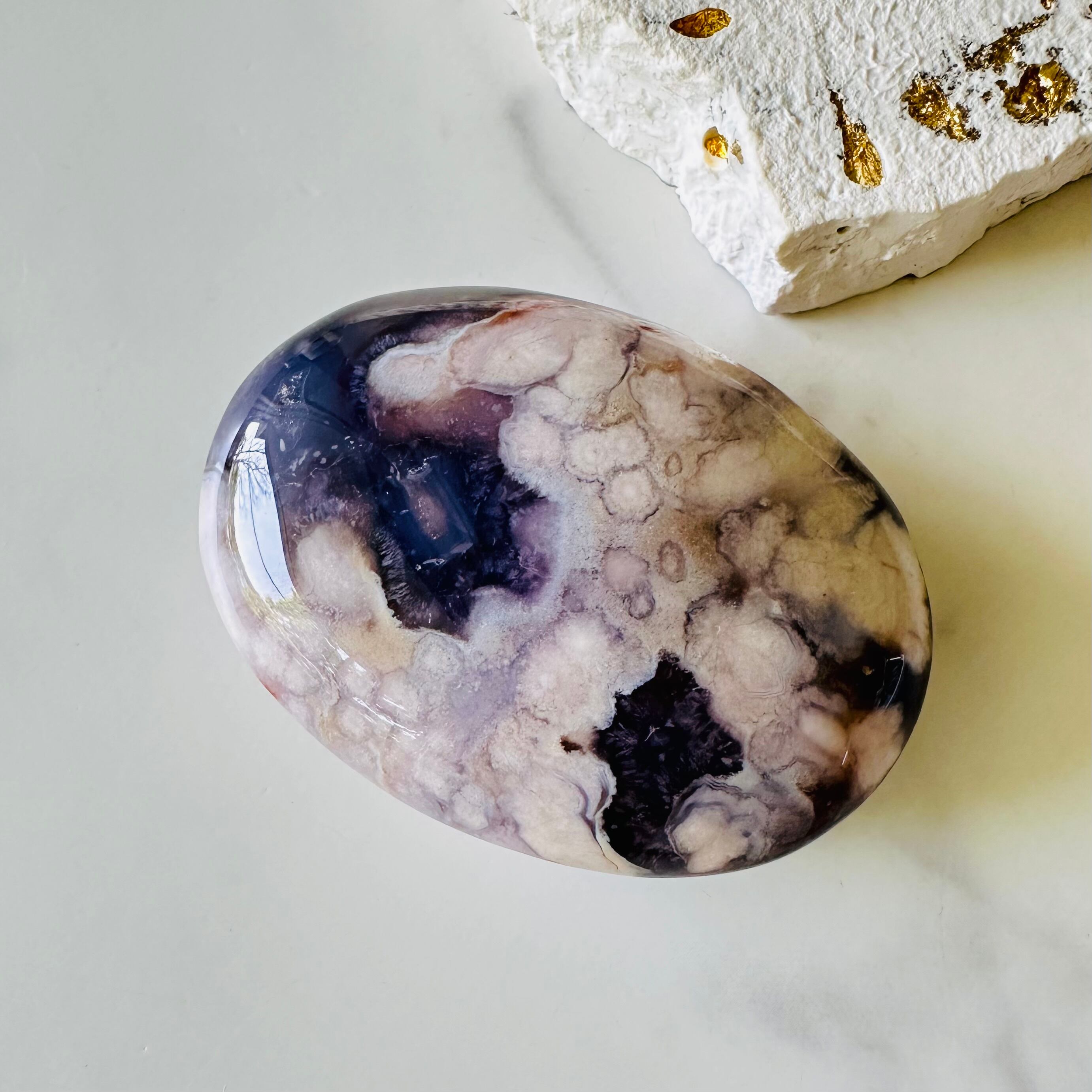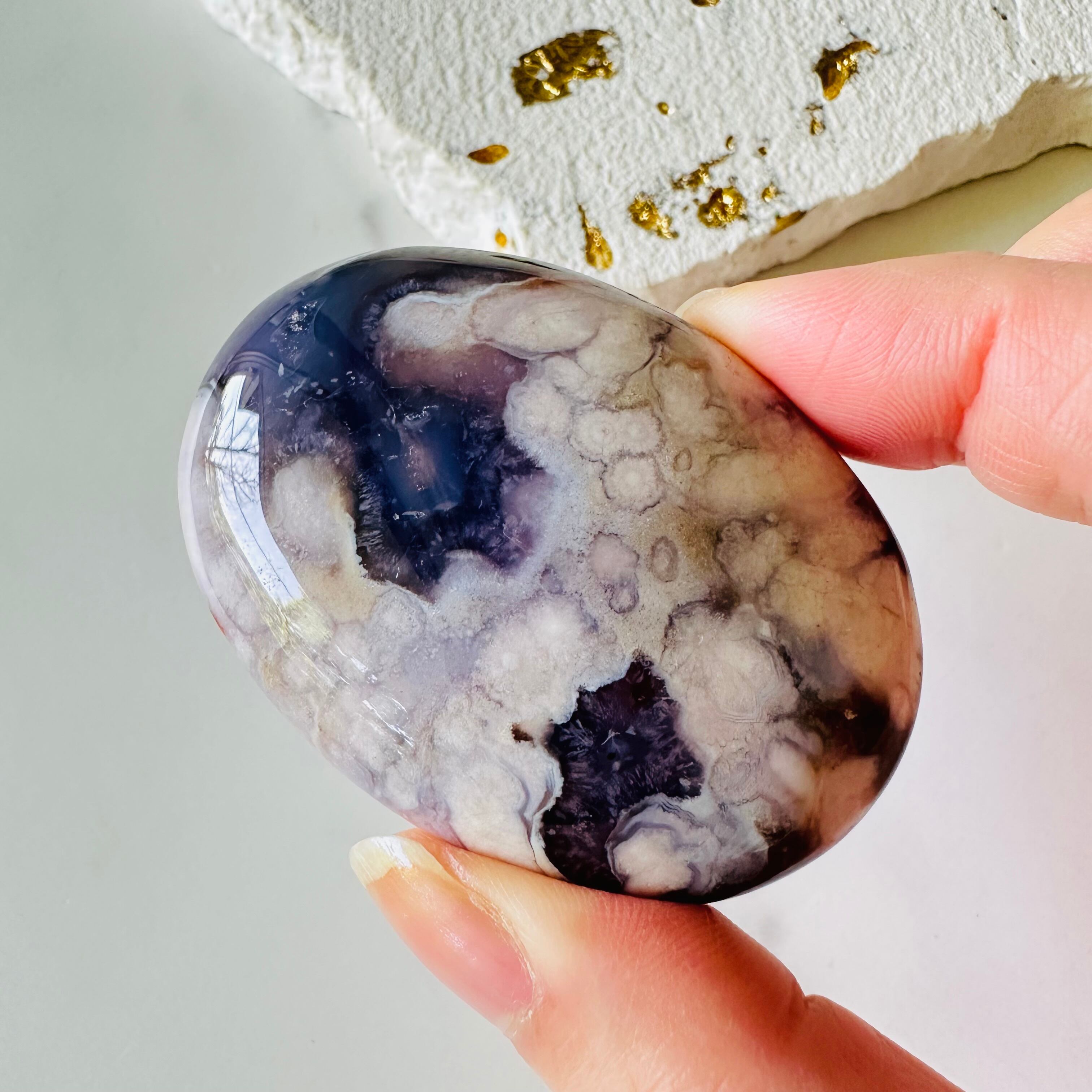 深い青紫色の石にピンク色のお花が咲いた幻想的で可愛らしいブルーフラワーアゲートパームストーンです。淡いピンク色とのコントラストが美しく夜桜を連想させます。握りやすい大きさで、ぎゅっと握れば心が落ち着き、極上の癒しの時間を演出します。他のお石と組み合わせてお部屋のお気に入りのスペースに飾るのもおすすめです。