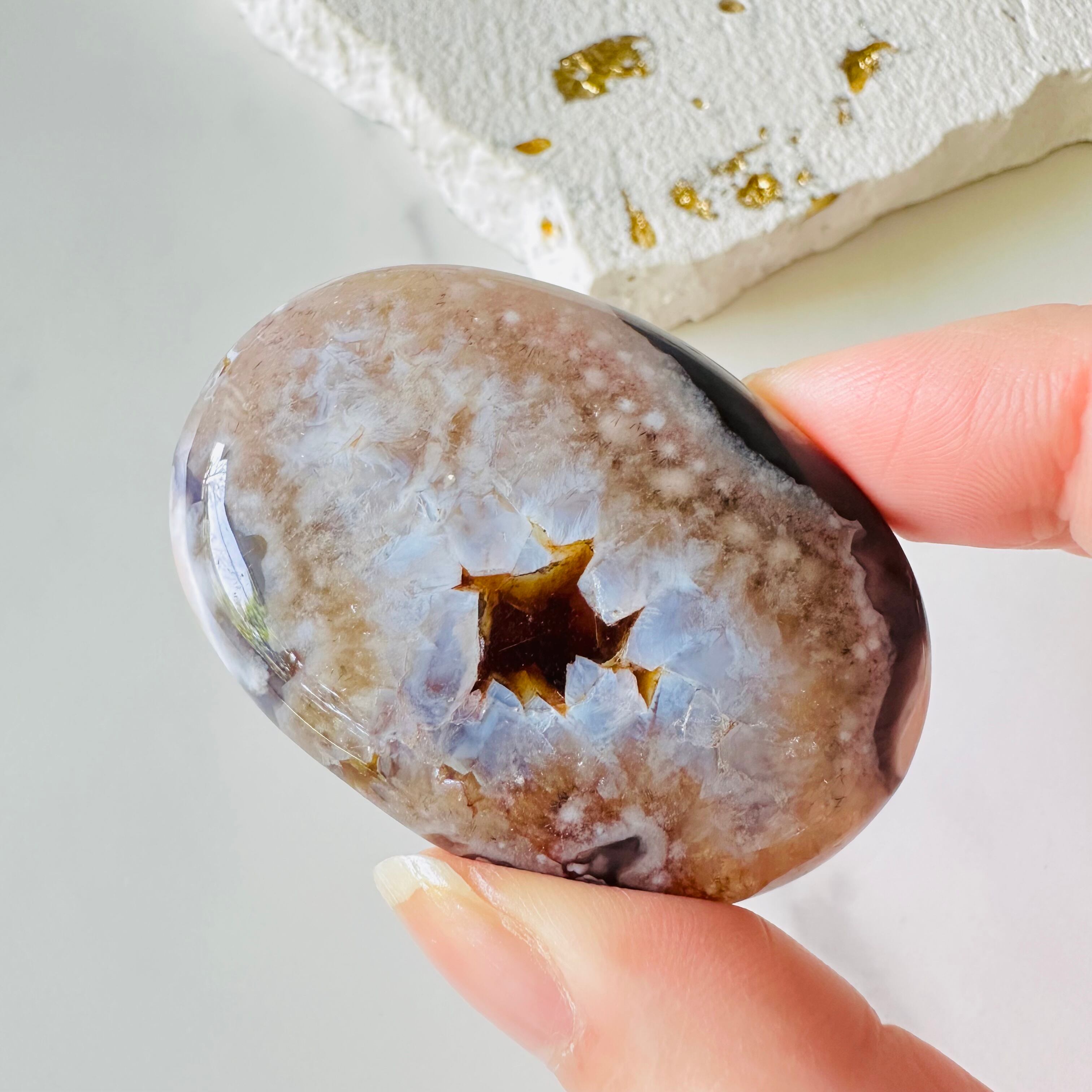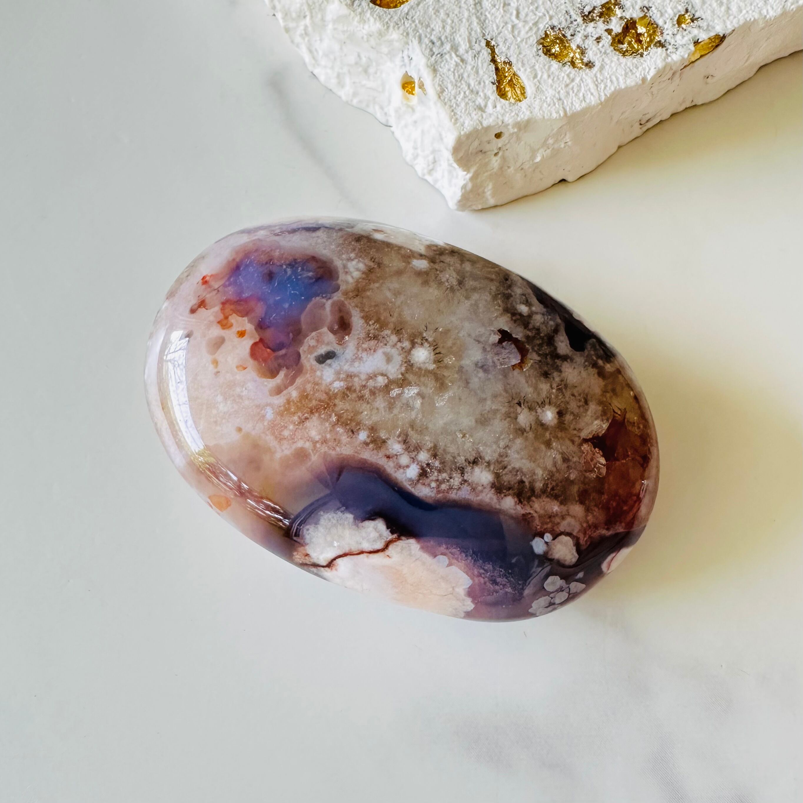 青紫色の石にピンク色のお花が部分的に咲いている、とっても可愛らしいブルーフラワーアゲートパームストーンです。ザクザクした半透明のクォーツがたっぷり入って魅了されます。