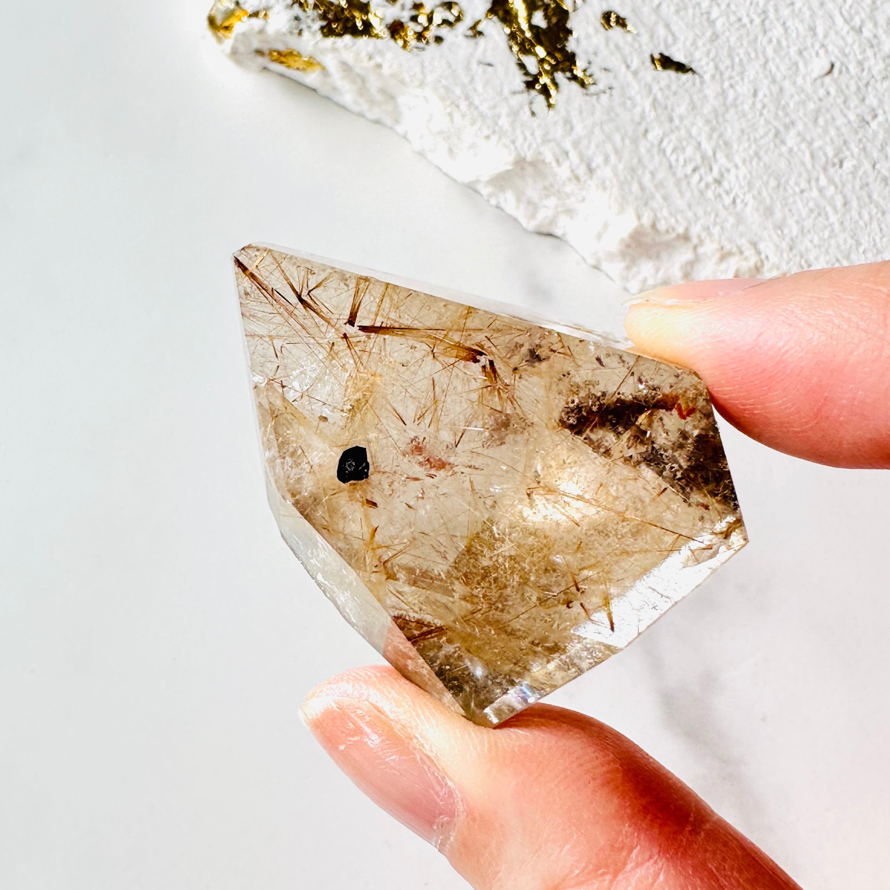 金色に輝く美しいルチルは上品でありながらも力強い波動を届けてくれます。水晶の中を縦横無尽に伸びるルチルは、直感力や洞察力を高め、自信と決断力を与えて幸運をもたらしてくれます。夢や目標に向かって頑張る方、より一層の成功を求める方に、お守りとして最適です。