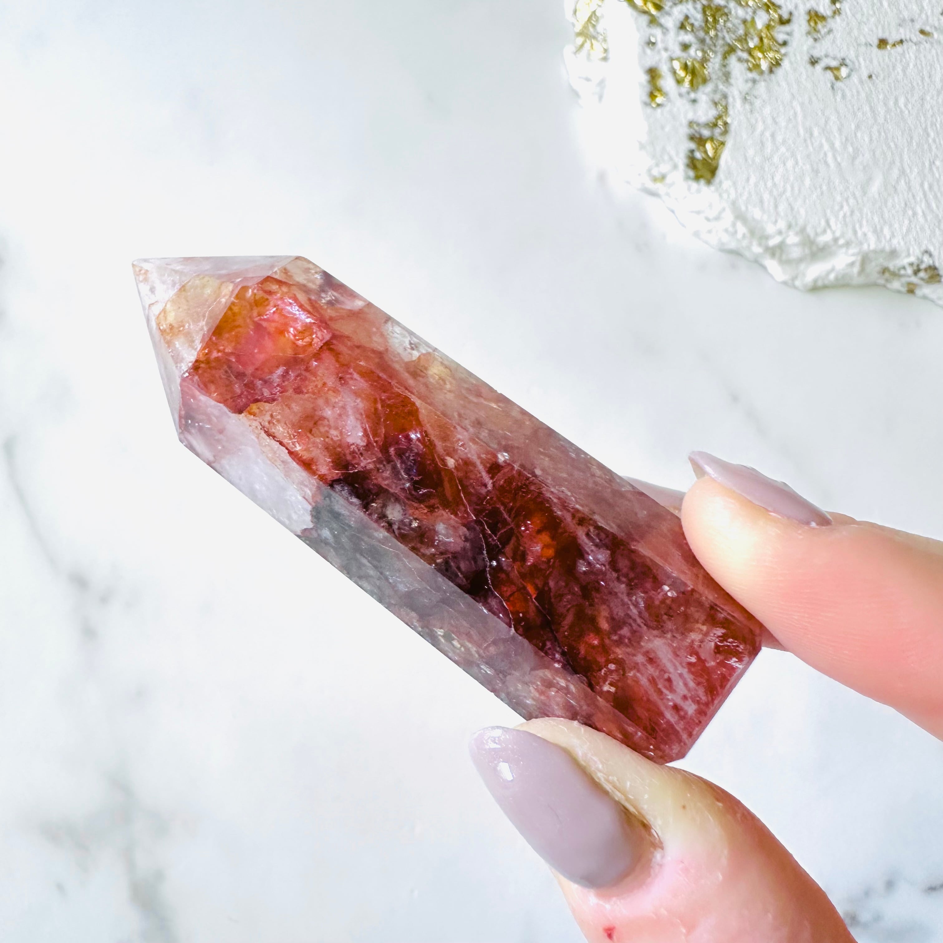 生命の鼓動を感じる情熱的な色合いのファイヤークォーツです。しっかりと濃いダークレッドカラーは強いエネルギーを感じさせます。光を入れるとキラキラと輝きます。内部には無数の虹が煌めくとても美しいタワーです。