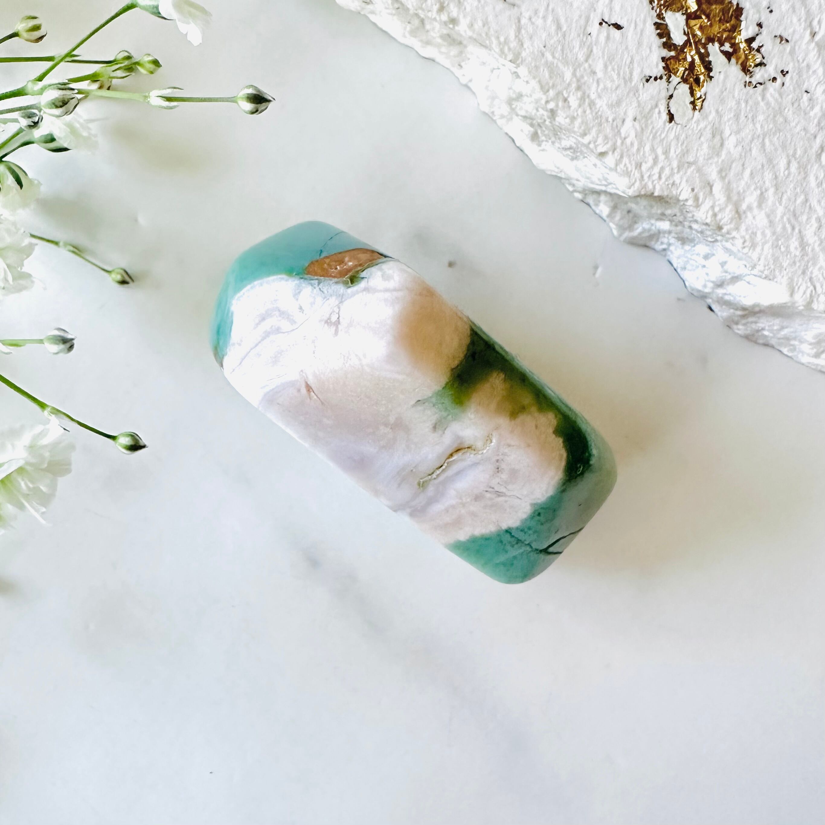 美しいエメラルドグリーンの石に大きなお花が咲いたグリーンフラワーアゲートのフリーフォームです。手のひらに馴染む握りやすい大きさです。触れるとつるんとした石の質感に癒されます。