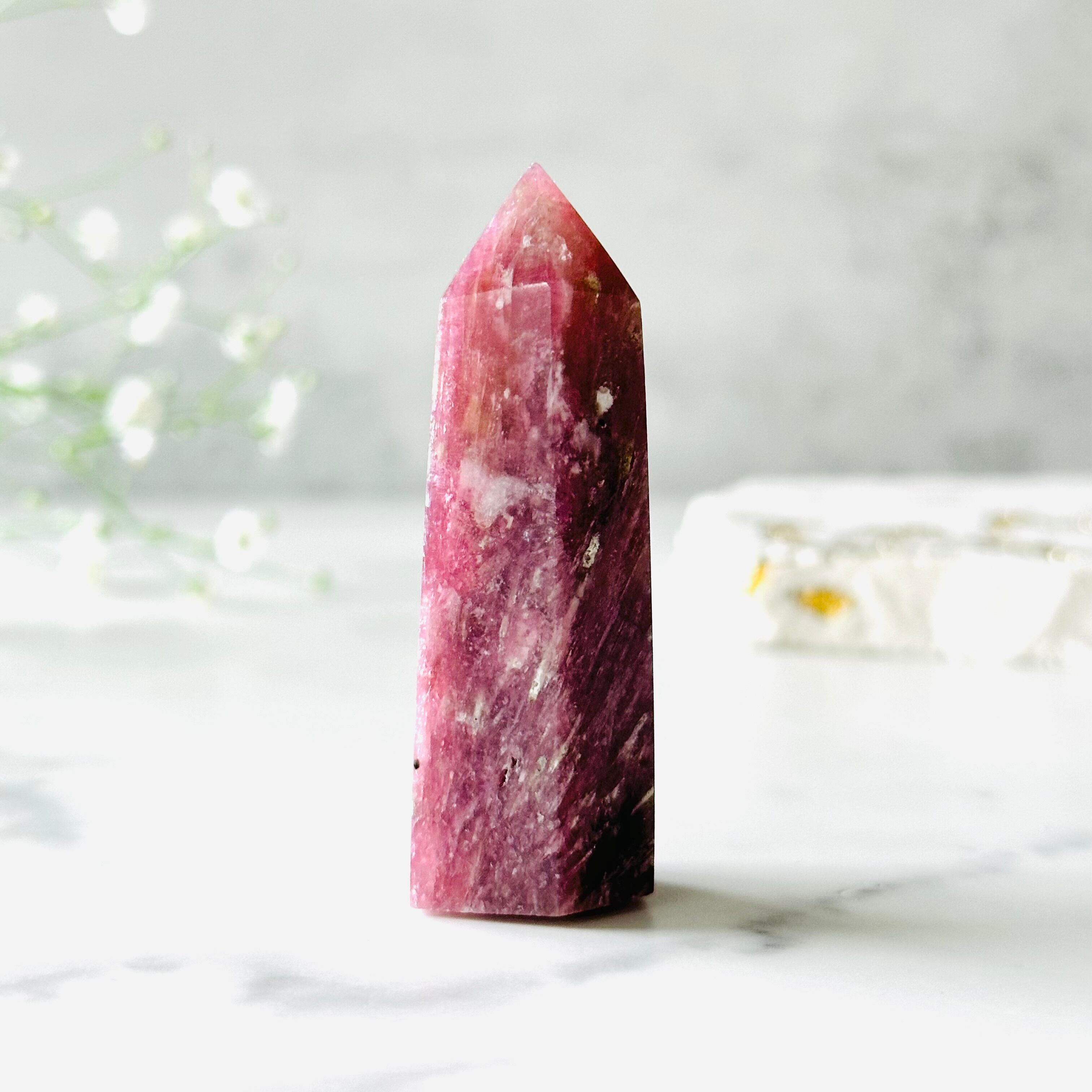 ウォーターメロントルマリンのタワーです。ウォーターメロンはスイカのこと。スイカの果肉のような濃いめのピンクにホワイトが混ざり合い、美しい模様を描きだしています。動かすとラメがキラッと輝きます。