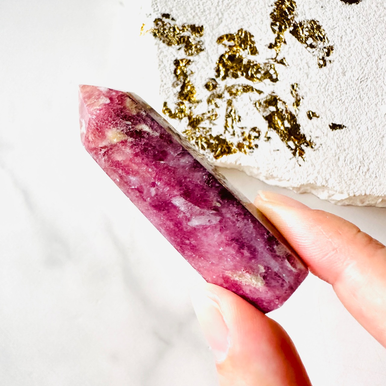 ウォーターメロントルマリンのタワーです。ウォーターメロンはスイカのこと。スイカの果肉のように濃いめのピンクにほんのりイエローとホワイトが混ざり合い美しい模様を描きだしています。動かすとラメがキラッと輝きます。