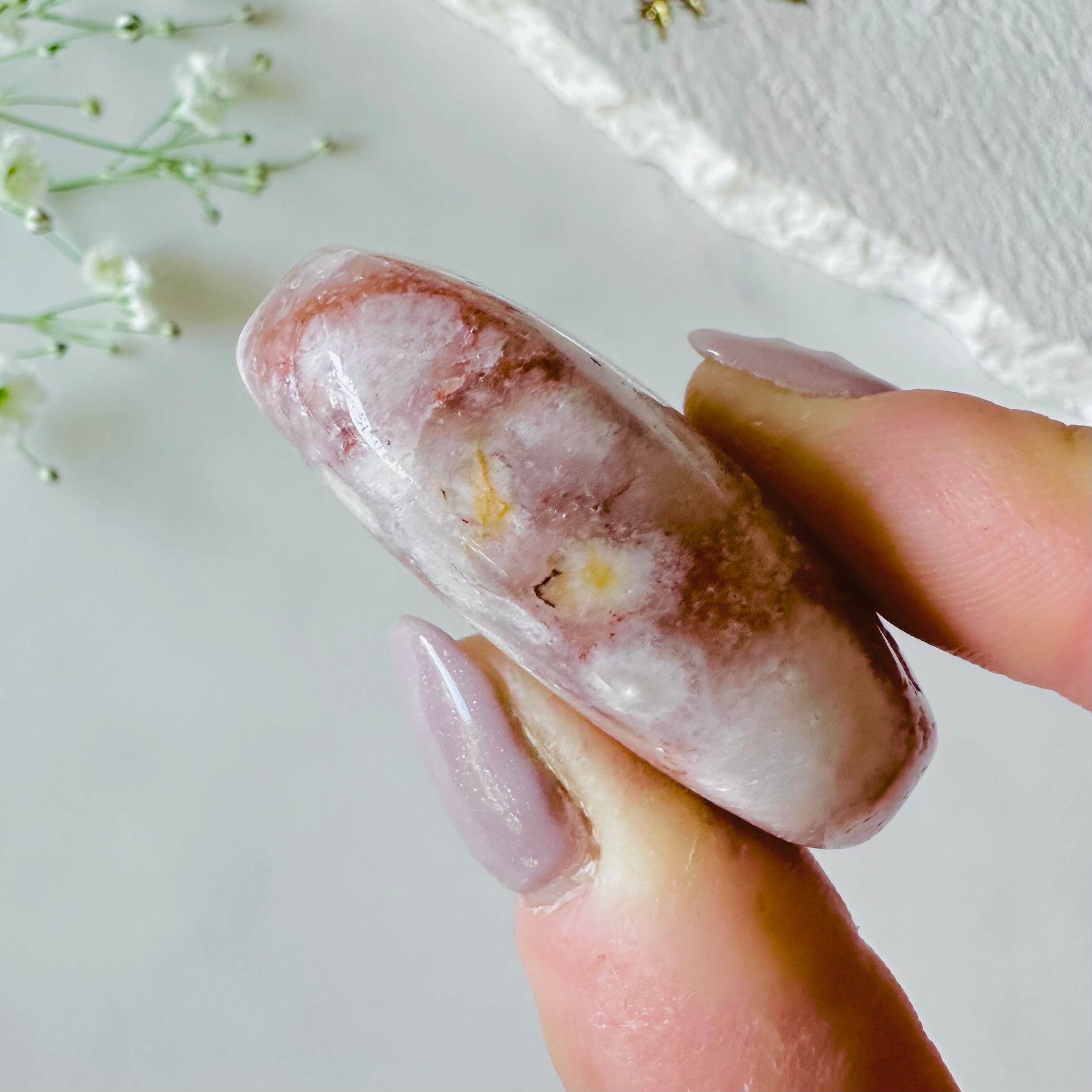 ピンクアメジストとフラワーアゲートが共生した可愛らしいパームストーンです。