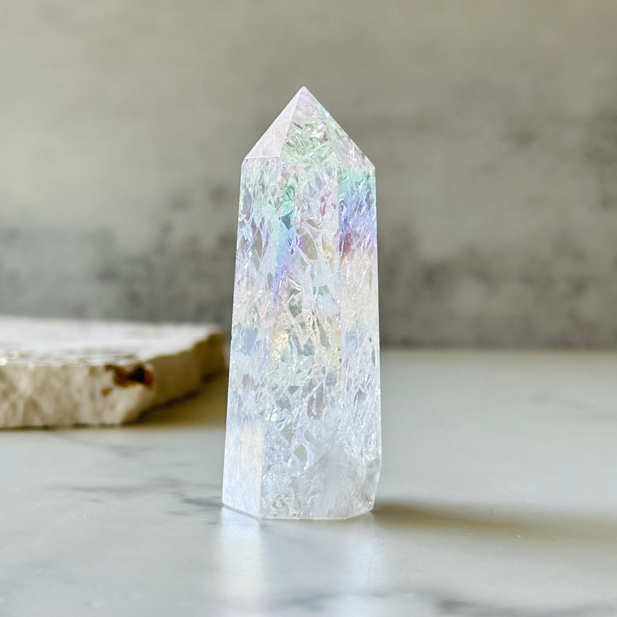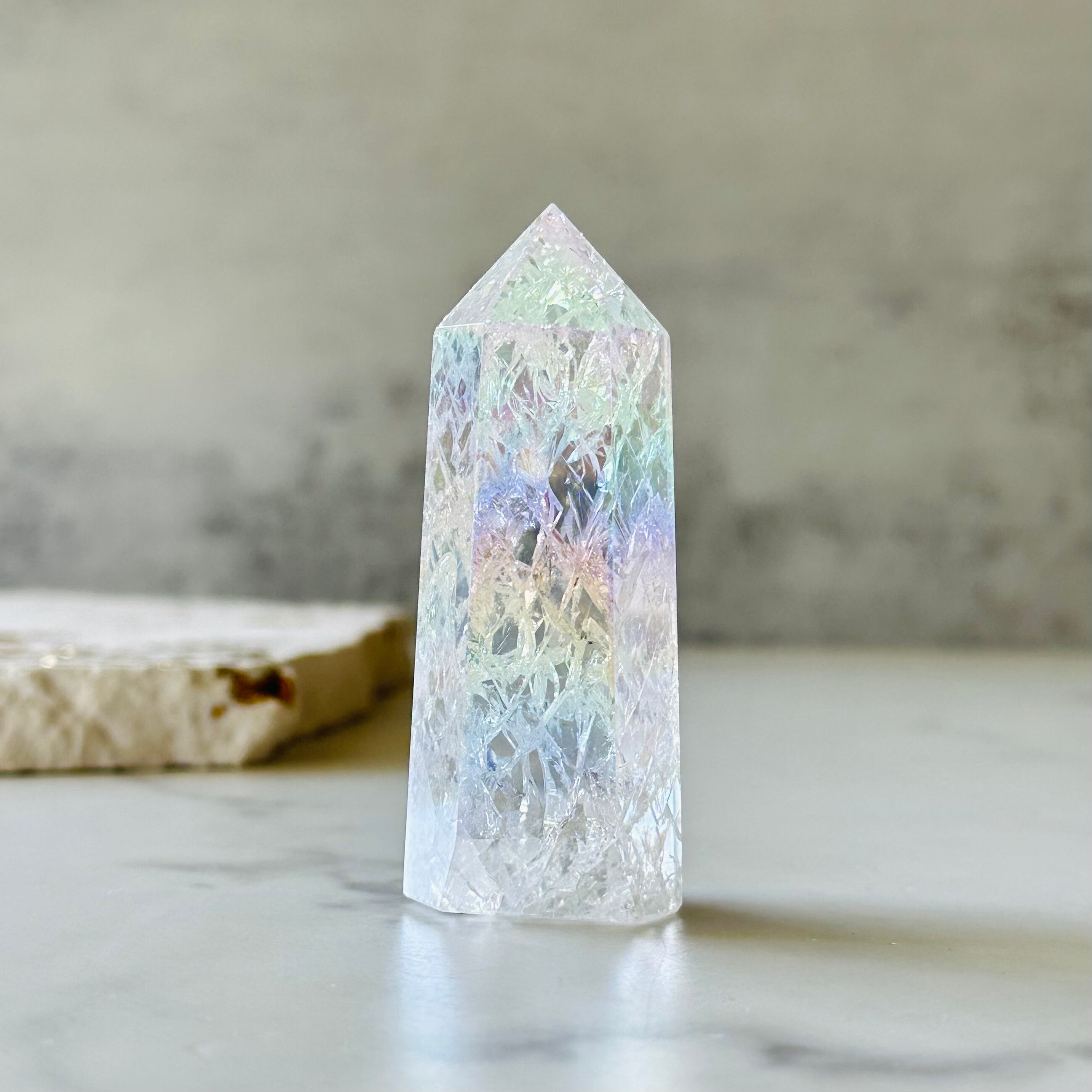 人工的にクラックを入れて、オーロラ加工を施した水晶ポイントです。内部には無数の虹を宿し、ピンクやイエロー、グリーンのパステルカラーのオーラを纏った可愛らしいアイテムです。