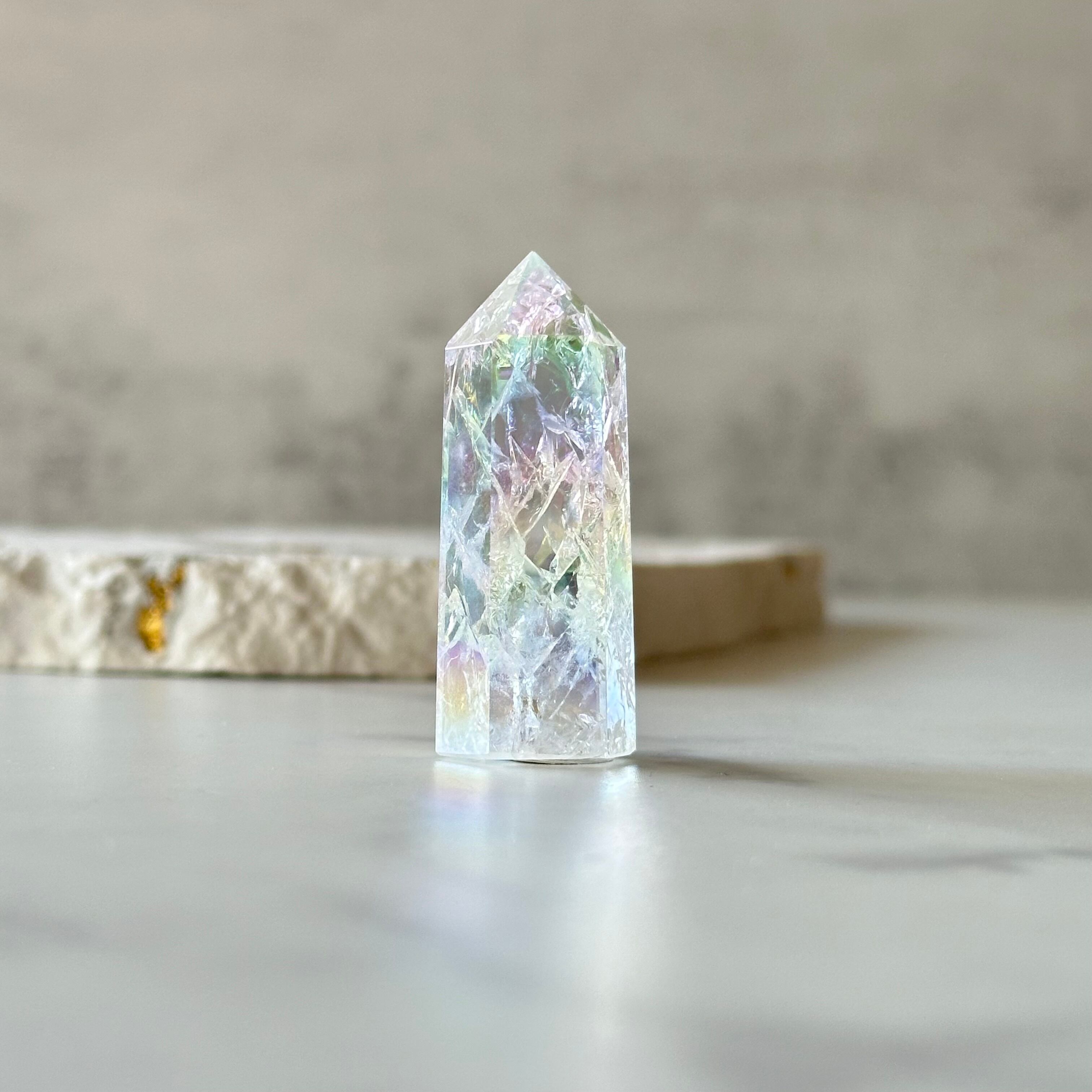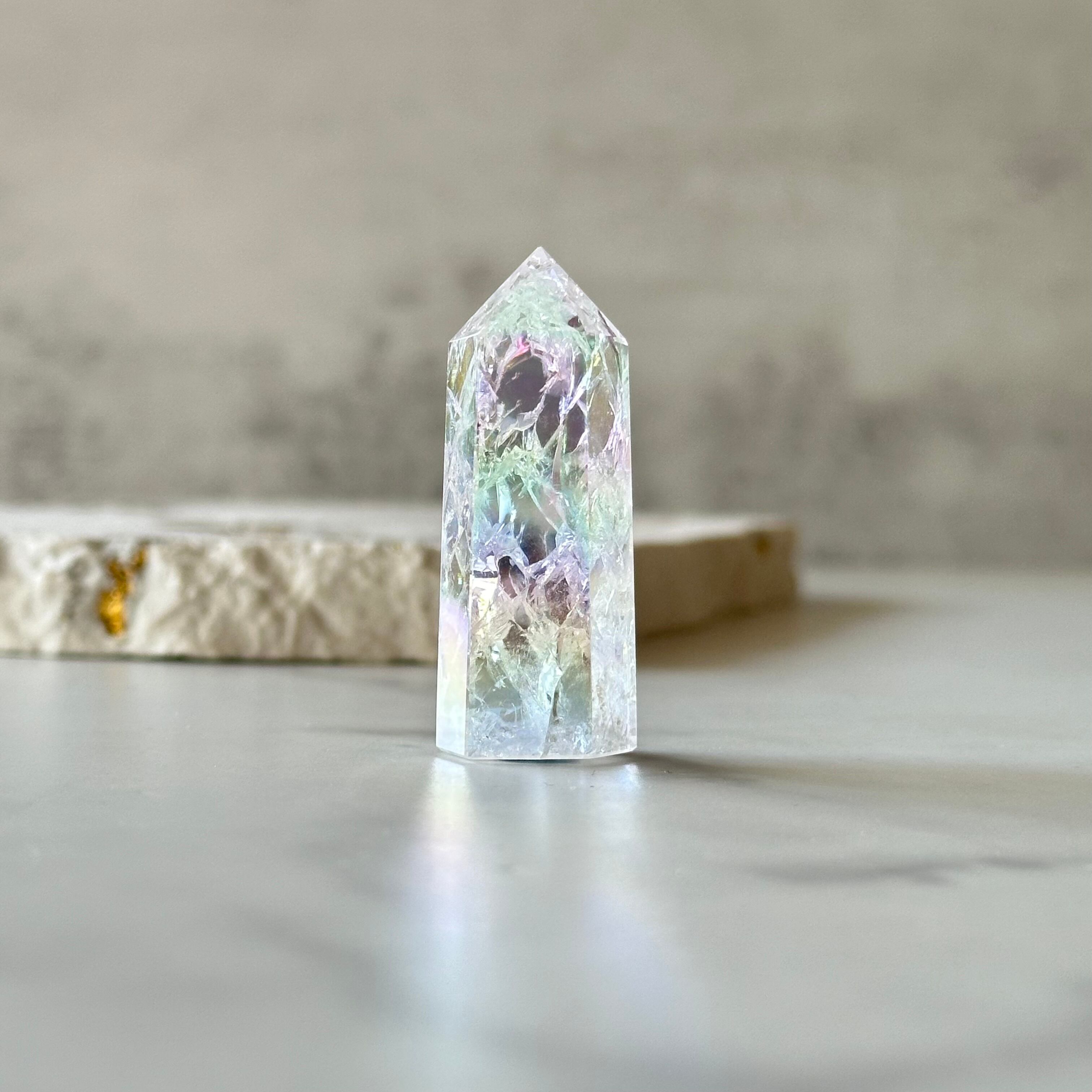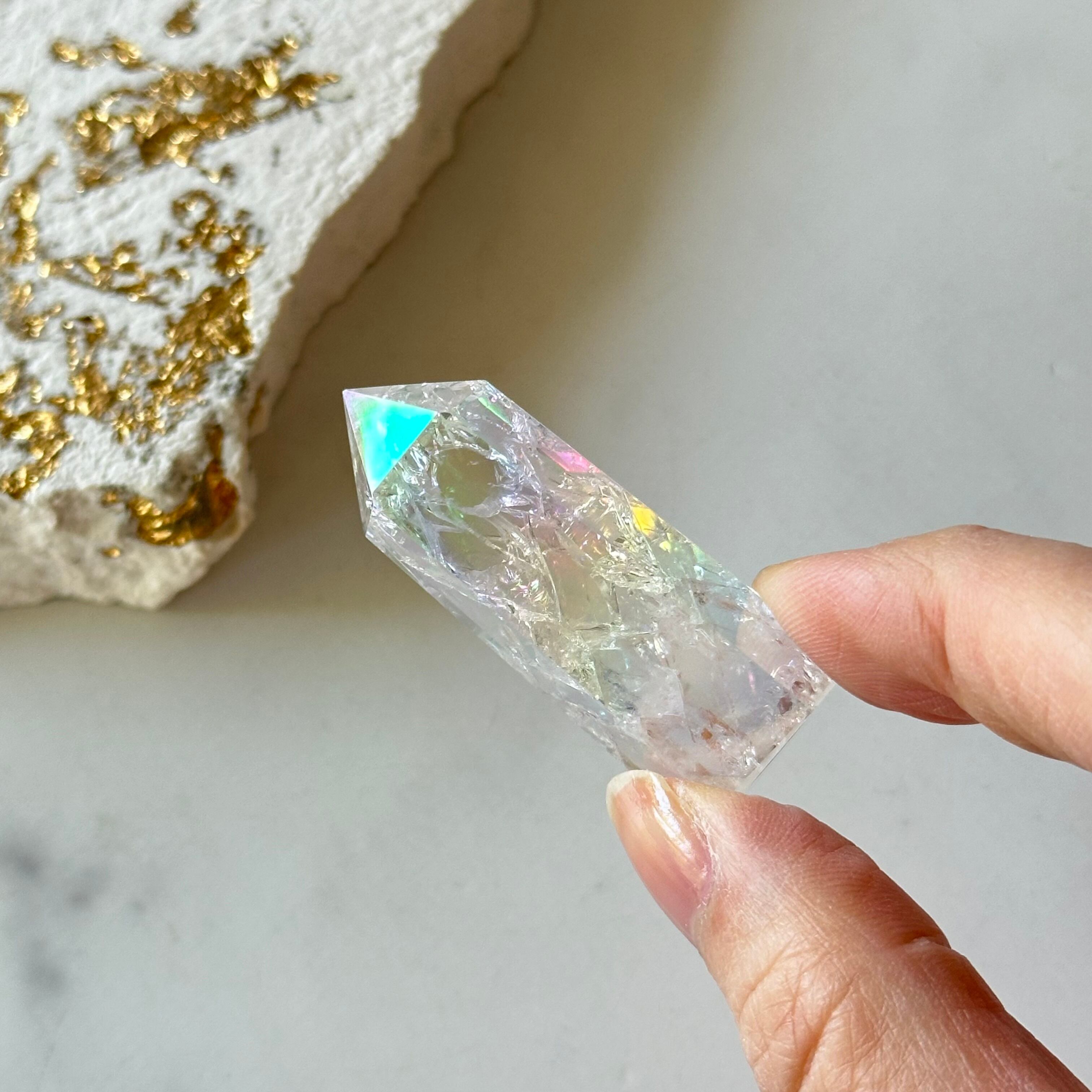 人工的にクラックを入れて、オーロラ加工を施した水晶ポイントです。内部には無数の虹を宿し、ピンクやイエロー、グリーンのパステルカラーのオーラを纏った可愛らしいアイテムです。