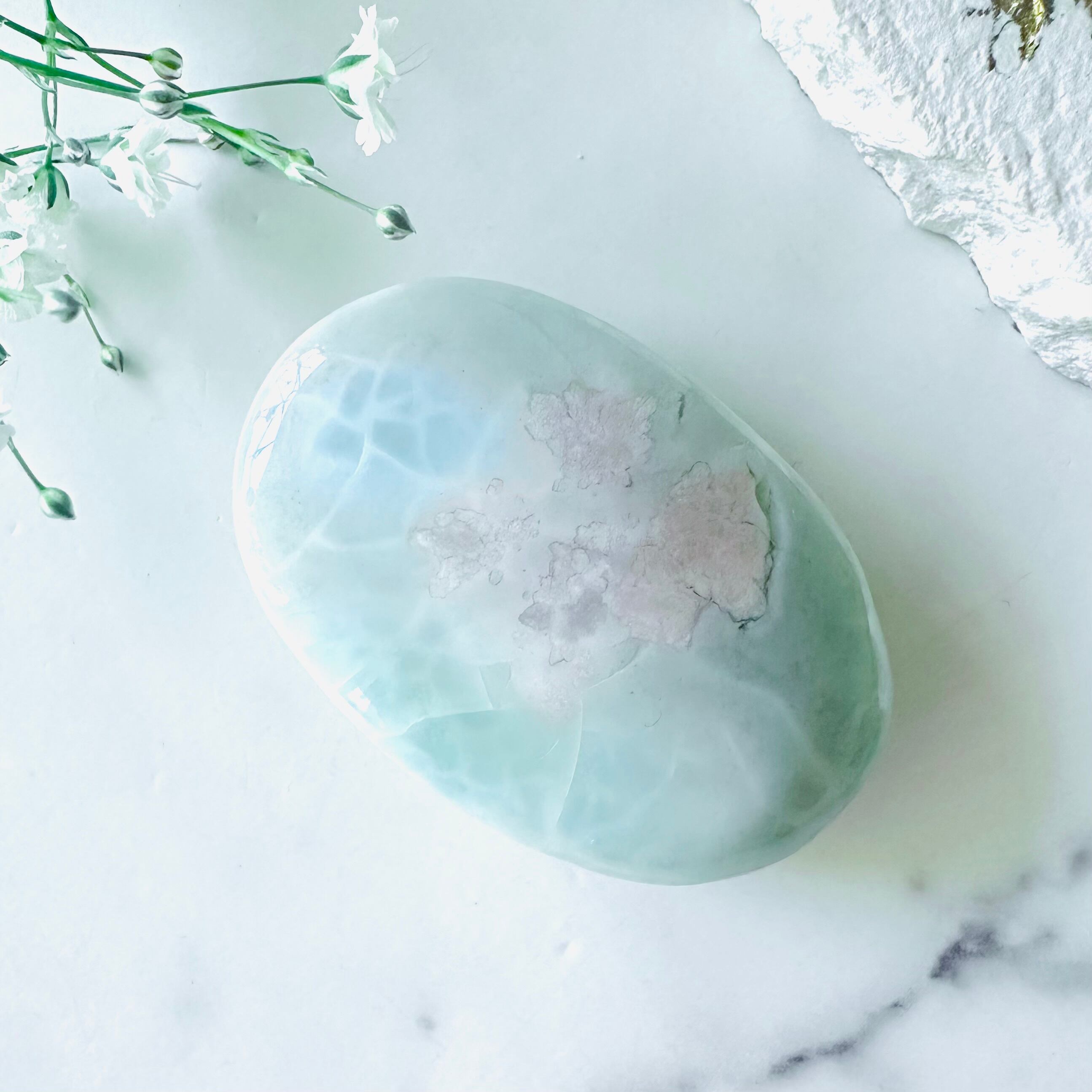 優しいエメラルドグリーンの石にピンク色のお花が咲いた可愛らしいパームストーンです。柔らかな色合いが心を穏やかに癒してくれます。