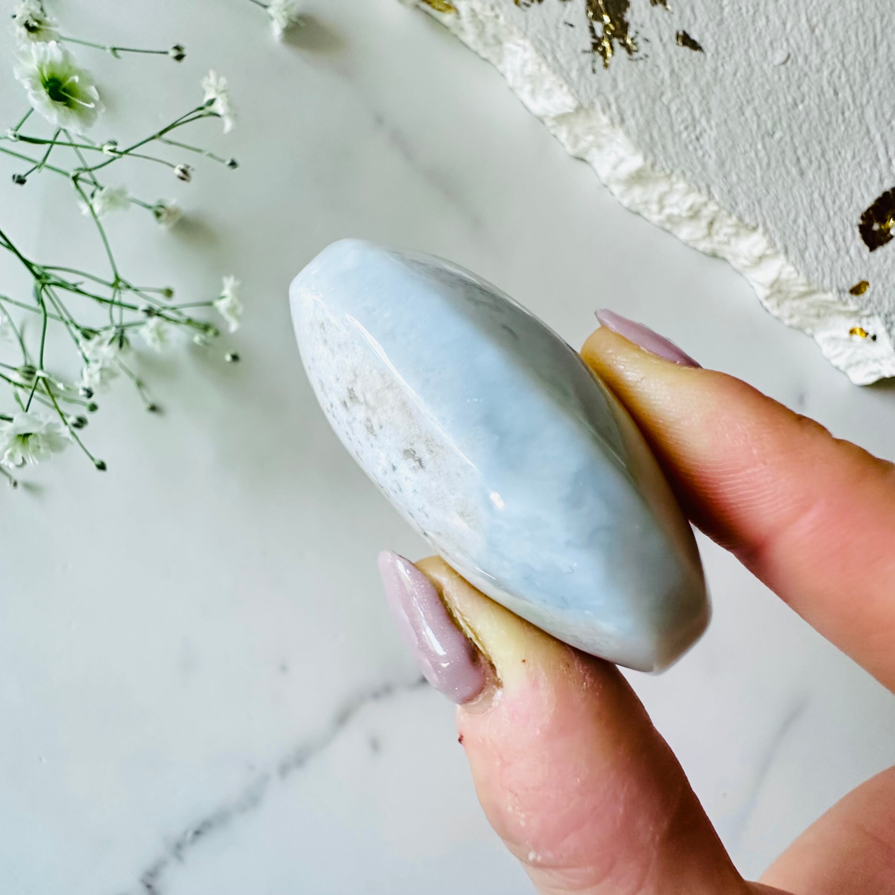 優しいエメラルドグリーンの石にピンクのお花が咲いた可愛らしいパームストーンです。ぷっくりとした厚みのある形で柔らかな色合いに癒されます。