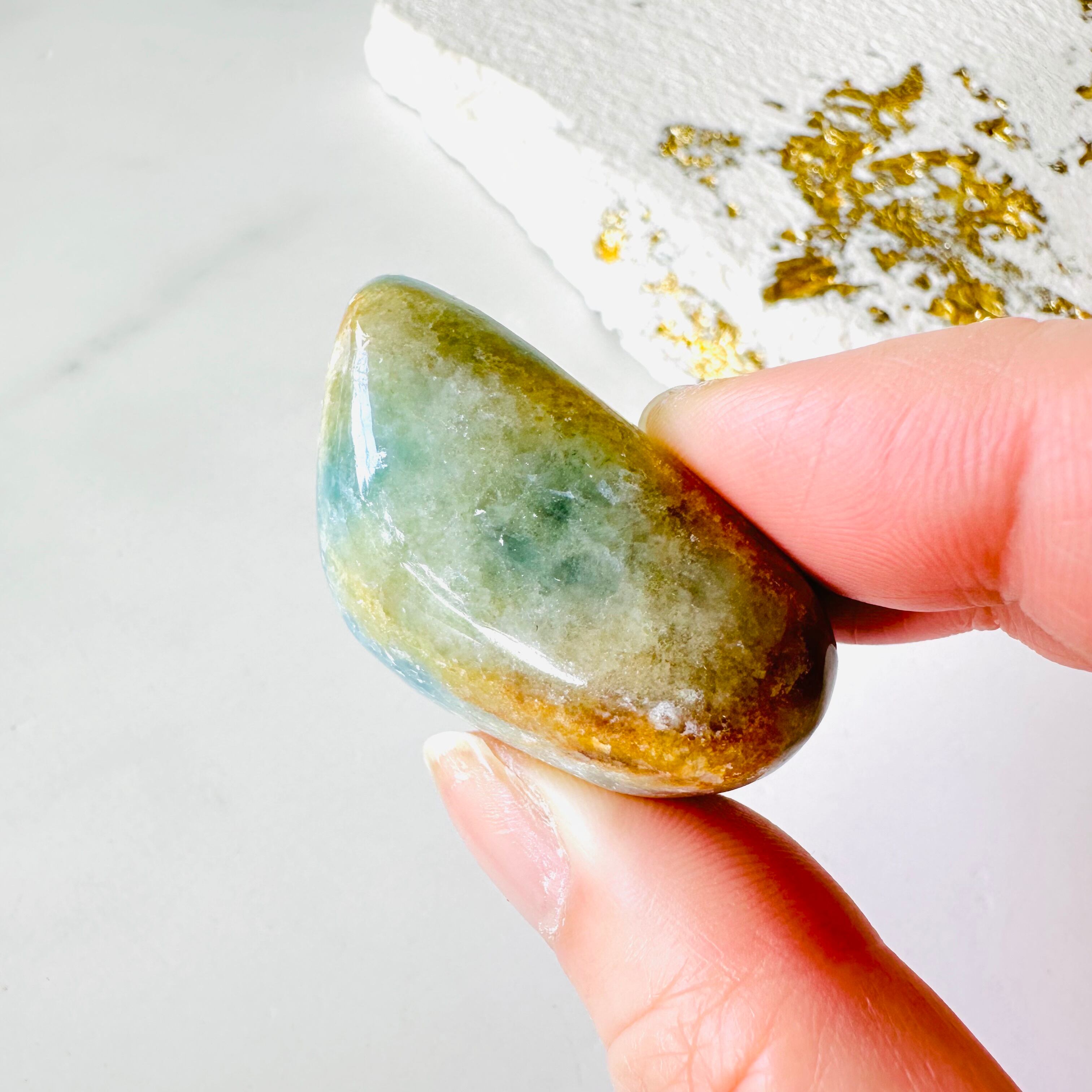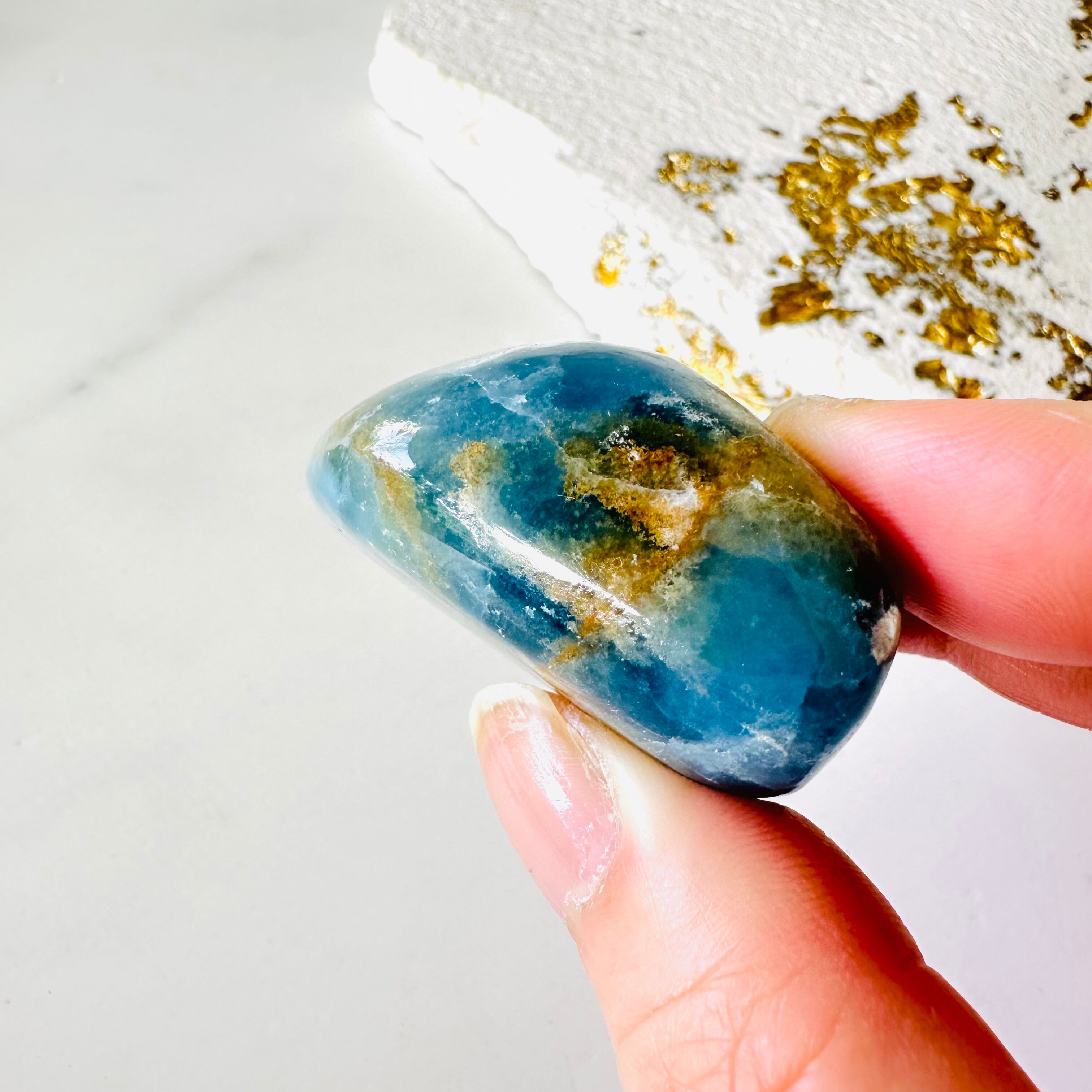 何層にも重なり合ったブルーとブラウンの縞模様が美しい色調と模様を作り出しています。つやつやとした石肌で触り心地のいいタンブルです。