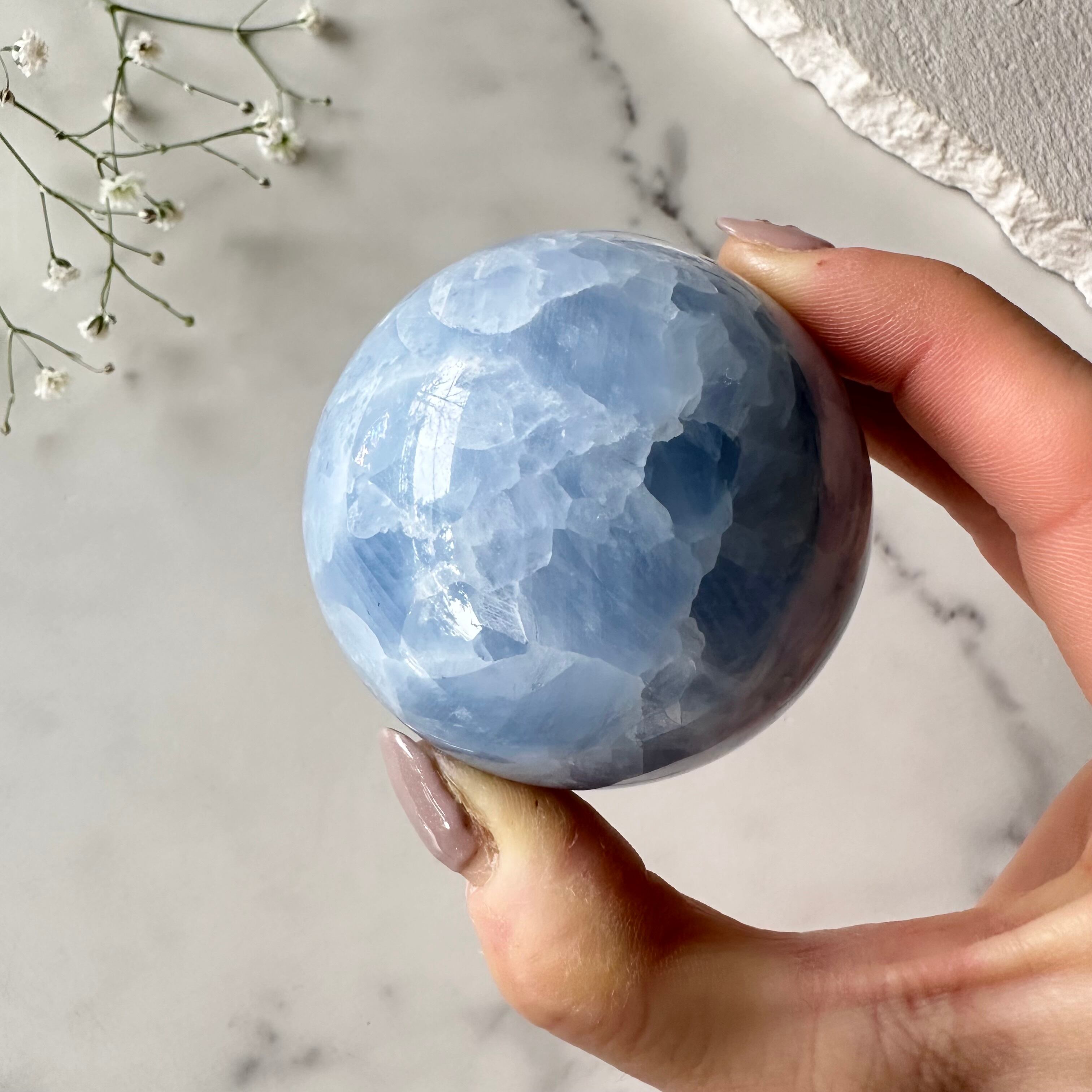 冷たく澄んだ冬の空のようなアイスブルーのセレスタイト。くるくる回すと結晶がキラキラと輝きます。セレスタイトはヒーリング効果が高いと言われていますが、大きさもしっかりとあり、お部屋に飾れば清らかな気持ちになれそうなスフィアです。